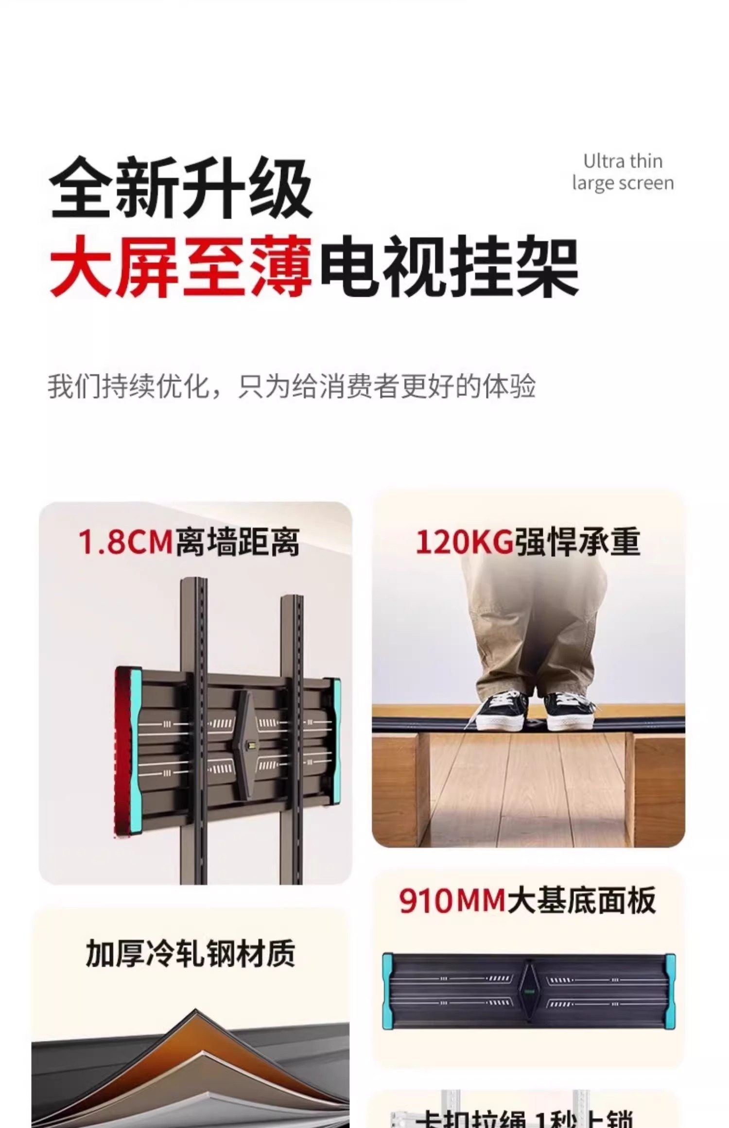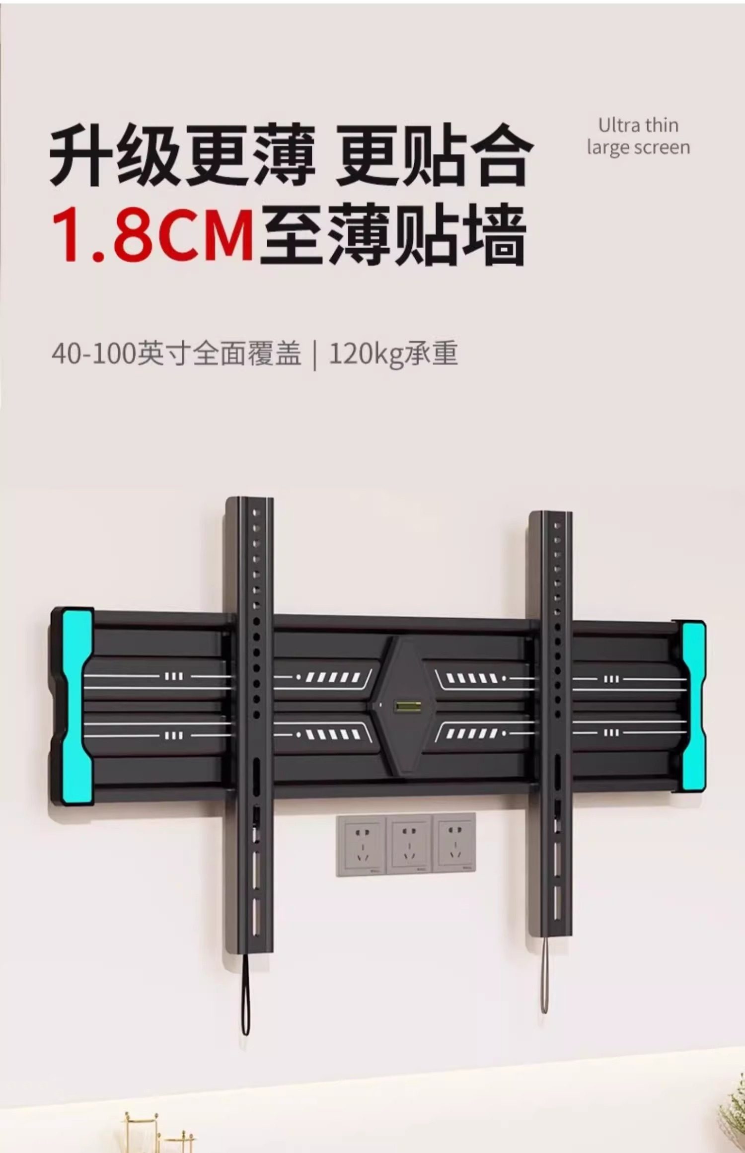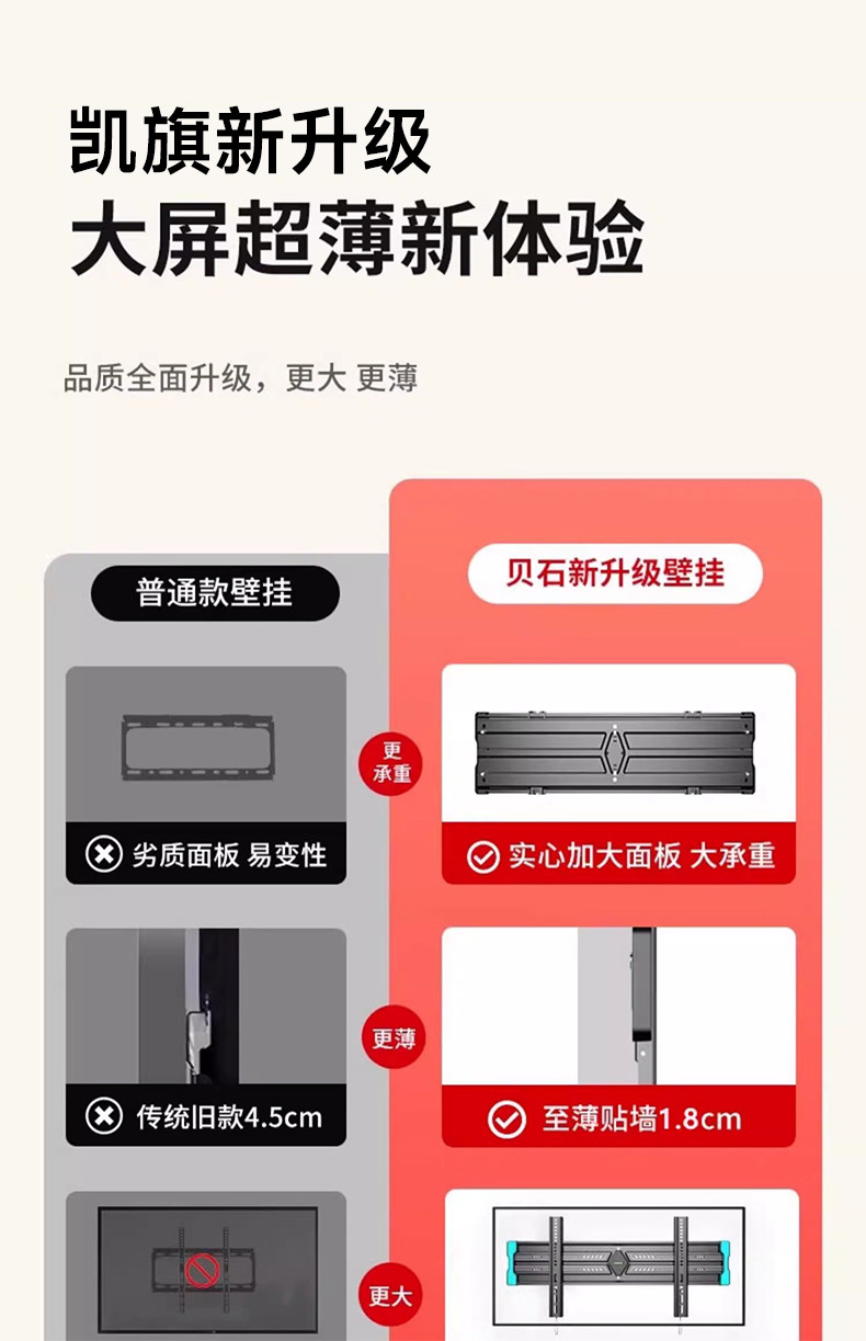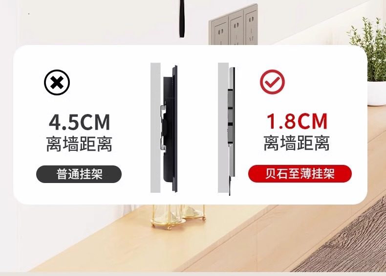 | Color Classification | [Featured Products on the Main Screen],Universal for All Brands[Within 43inch],1.8cm Ultra-Thin Wall-Mounted Design,Simple and Flexible Adaptation.,Universal for All Brands[Within 50inch],1.8cm Ultra-Thin Wall Display,Stable Load-Bearing.,Universal for All Brands[Within 55inch],1.8cm Ultra-Thin Wall-Mounted Process,Demonstrate Quality.,Universal for All Brands[Within 60inch],1.8cm Ultra-Thin Wall-Mounted Construction,A Good Choice for Watching Movies.,Universal for All Brands[Within 65inch],1.8cm Ultra-Thin Wall-Mounted Construction,Comfortable Viewing Angle.,Universal for All Brands[Within 70inch],1.8cm Ultra-Thin Wall Mounting Solution,Home Adaptation.,Universal for All Brands[Within 75inch],1.8cm Ultra-Thin Wall-Mounted Masterpiece,Visual Feast.,Universal for All Brands[Within 80inch],1.8cm Ultra-Thin Wall Sticker Model,Stable and Worry-Free.,[Ultra-Large Screen Flagship Series],Universal for All Brands[Within 86inch],1.8cm Ultra-Thin Wall-Mounted andā Thickened and Solid Material,Extraordinary Support.,Universal for All Brands[Within 100inch],1.8cm Ultra-Thin Wall Matchingā Thickened and Solid Material,Responsible for the Giant Screen.,Universal for All Brands[Within 110inch],1.8cm Ultra-Thin Wall Bondingā Thickened and Solid Material,Shocking Experience.,Universal for All Brands[Within 120inch],1.8cm Ultra-Thin Wall-Mounted Auxiliaryā Thickened and Solid Material,Ultimate Presentation.,[Upgraded Ultra-Thin Universal Model],ā Upgraded Ultra-Thin Modelā [32 - 80inch Universal],1.5cm Ultra-Thin Wall-Mountedā Thickened and Solid Material,Excellent Upgrade.,ā Upgraded Ultra-Thin Modelā [50 - 100inch Universal],1.5cm Ultra-Thin Wall-Mounted andā Thickened and Solid Material,High-End Choice.,ā Upgraded Ultra-Thin Modelā [50 - 120inch Universal],1.5cm Ultra-Thin Wall Stickerā Thickened and Solid Material,Luxury Experience. |