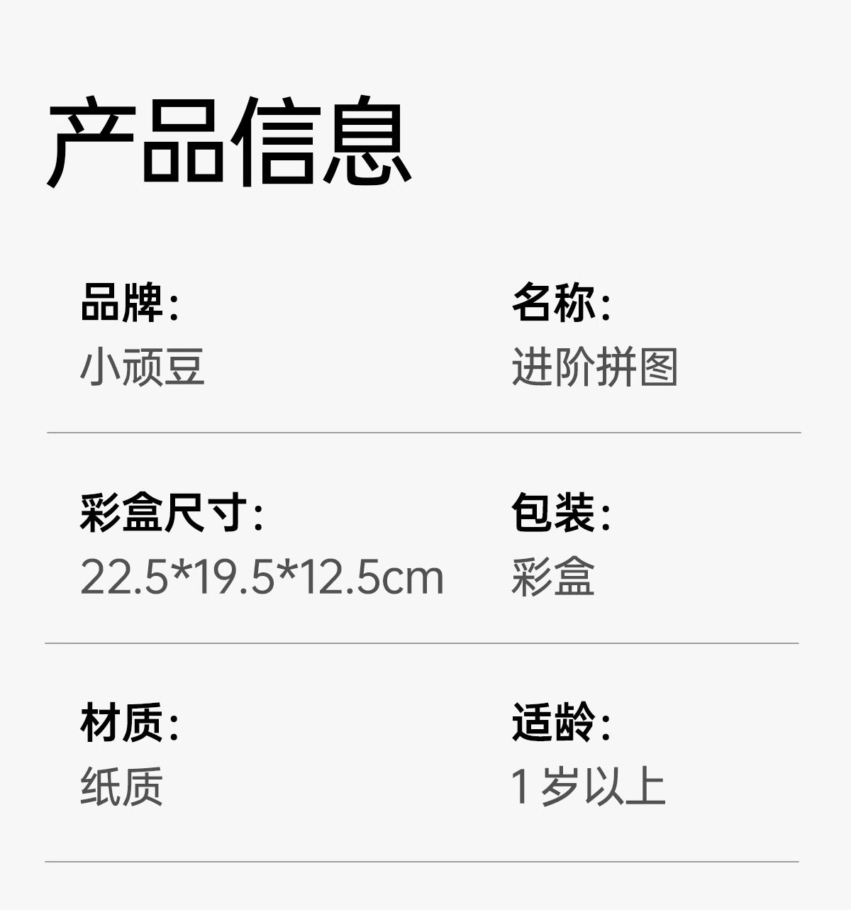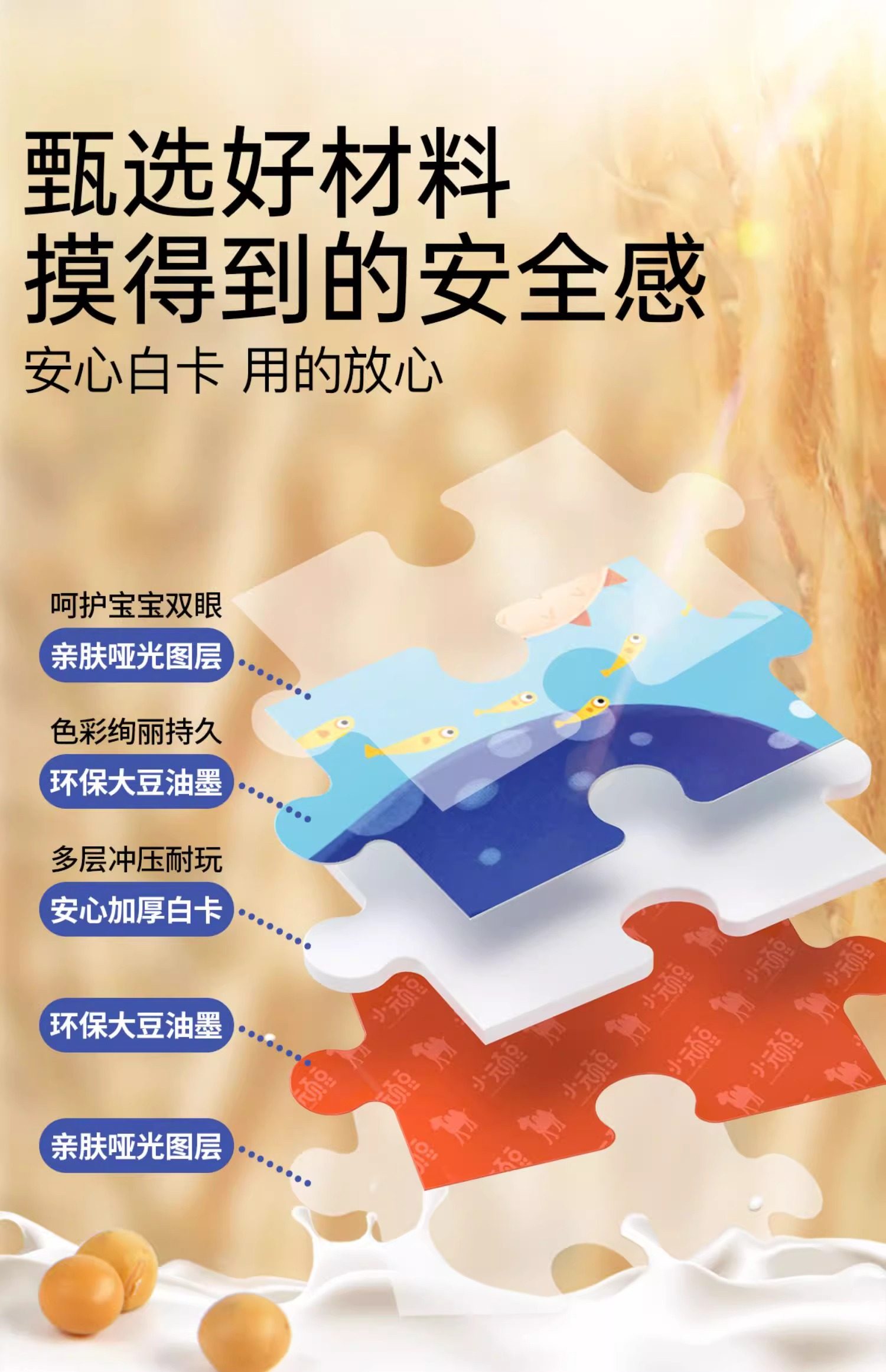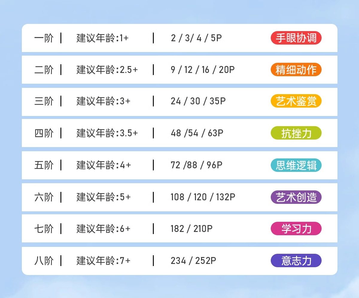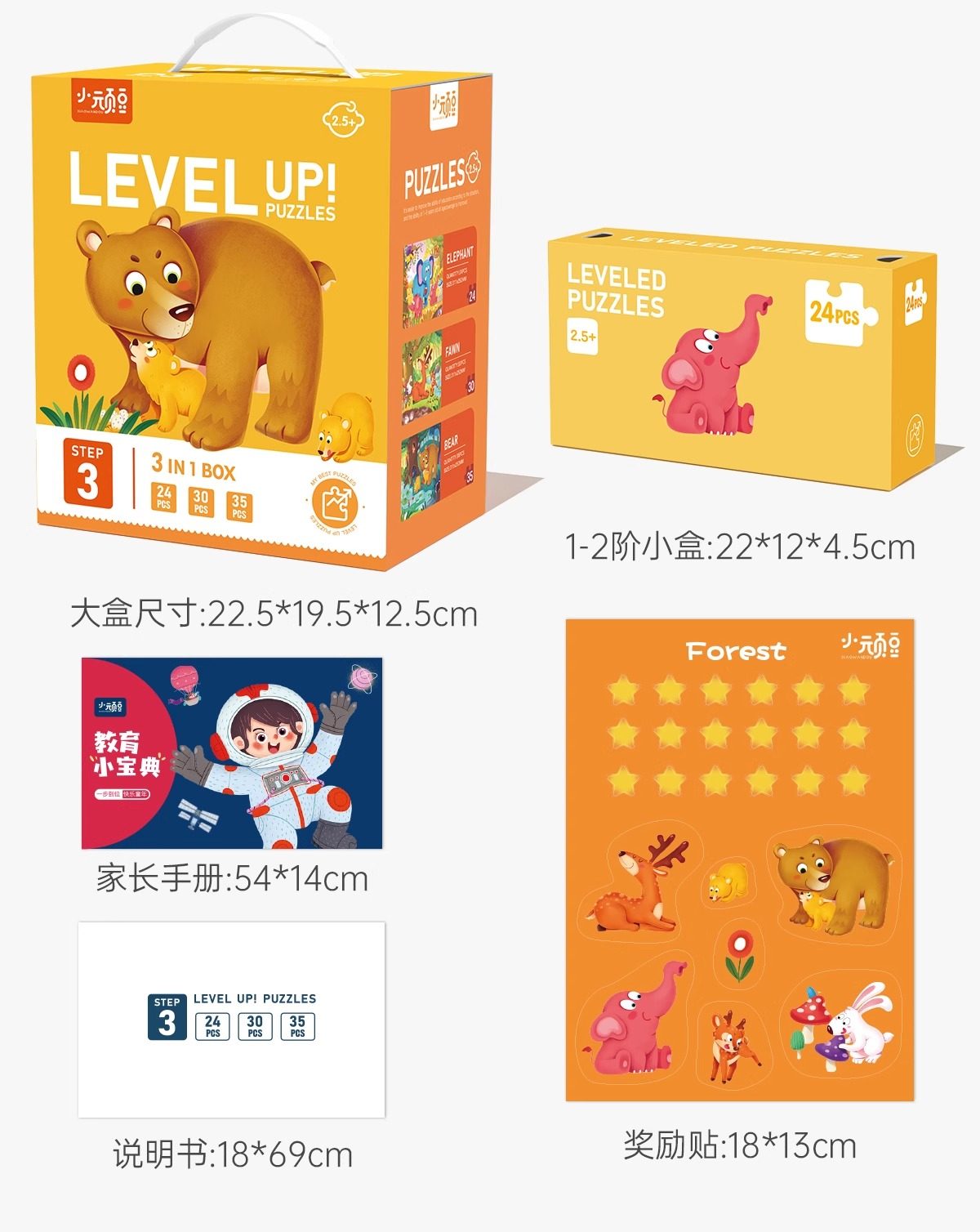| Color Classification | [Level 1]Animal Cognition (Recommended for 1-2 Years Old_4 Boxes Included),[Level 1]Shape Engineering Vehicle (Recommended for 1-2 Years Old_4 Boxes Included),[Level 2]Fables (Recommended for 2-3 Years Old_Contains 4 Boxes),[Level 2]Four Seasons Awareness (Recommended for 2-3 Years Old_4 Boxes Included),[Level 2]Scene Traffic (Recommended for 2-3 Years Old_Contains 4 Boxes),[Level 2]Scene Animals (Recommended for 2-3 Years Old - Includes 4 Boxes),[Level 3]Transportation (Recommended for 3-4 Years Old_Includes 3 Boxes_Jigsaw Puzzle),[Level 3]Pastoral Farm (Recommended for 3-4 Years Old_Contains 3 Boxes_Jigsaw Puzzle),[Level 3]Forest Animals (Recommended for 3-4 Years Old_Contains 3 Boxes_Puzzle Together),[Level 4]A Princess's Day Out (Recommended for Ages 3+).5-4.5 Years Old (3 Boxes Included),[Level 4]City Scene (Recommended 3).5-4.5 Years Old (3 Boxes Included),[Level 4]Aerospace Engineering (Recommendation 3.5-4.5 Years Old (3 Boxes Included),[Level 4]Dinosaur World (Recommended 3.5-4.5 Years Old (3 Boxes Included),[Level 5]Ocean Adventure (Recommended for Ages 4-5).5 Years Old (3 Boxes Included),[Level 5]Fantasy World (Recommended 4-5.5 Years Old (3 Boxes Included),[Level 5]Firefighter (Recommended 4-5.5 Years Old (3 Boxes Included),[Level 5]Jurassic Dinosaur (Recommended for Ages 4-5).5 Years Old (3 Boxes Included),[Level 5]Candy World (Recommended 4-5.5 Years Old (3 Boxes Included),[Level 6]Space Alien (Recommended for Ages 5-6).5 Years Old (3 Boxes Included),[Level 6]Primitive Tribe (Recommended 5-6.5 Years Old (3 Boxes Included),[Level 6]Ancient Era (Recommended 5-6.5 Years Old (3 Boxes Included),[Level 6]Family Fun (Recommended for Ages 5-6).5 Years Old (3 Boxes Included),[Level 7]Brainstorm (Recommended for 7 Years Old +_Includes 2 Boxes),[Level 7]National Trend Story Telling (Recommended for 7 Years Old +_Includes 2 Boxes_Joined Together),[Level 7]National Trend Journey to the West (Recommended for 7 Years Old +_Includes 2 Boxes_Joined Together),[Level 7]Traditional Festival (Recommended for Ages 7+; Includes 2 Boxes; Combination Puzzle),[Level 8]Trendy Chinese Mythology Stories (Recommended for Ages 8 and up + Includes 2 Boxes),[Level 8]Tang and Song Dynasty Elegance (Recommended for Ages 8 and up + Includes 2 Boxes) |