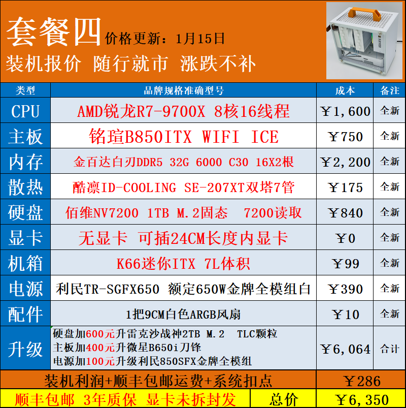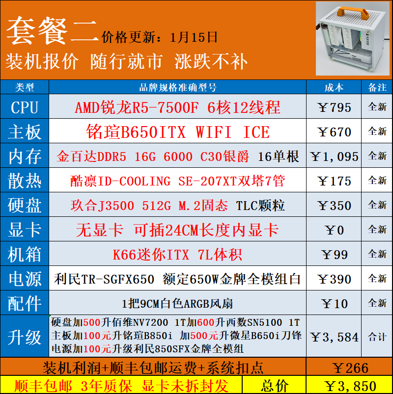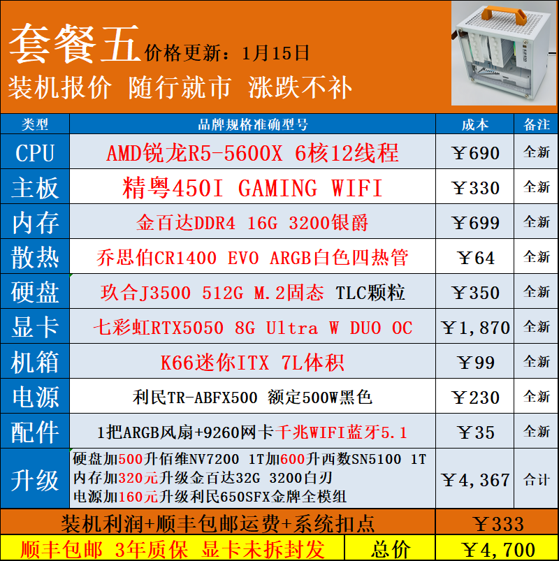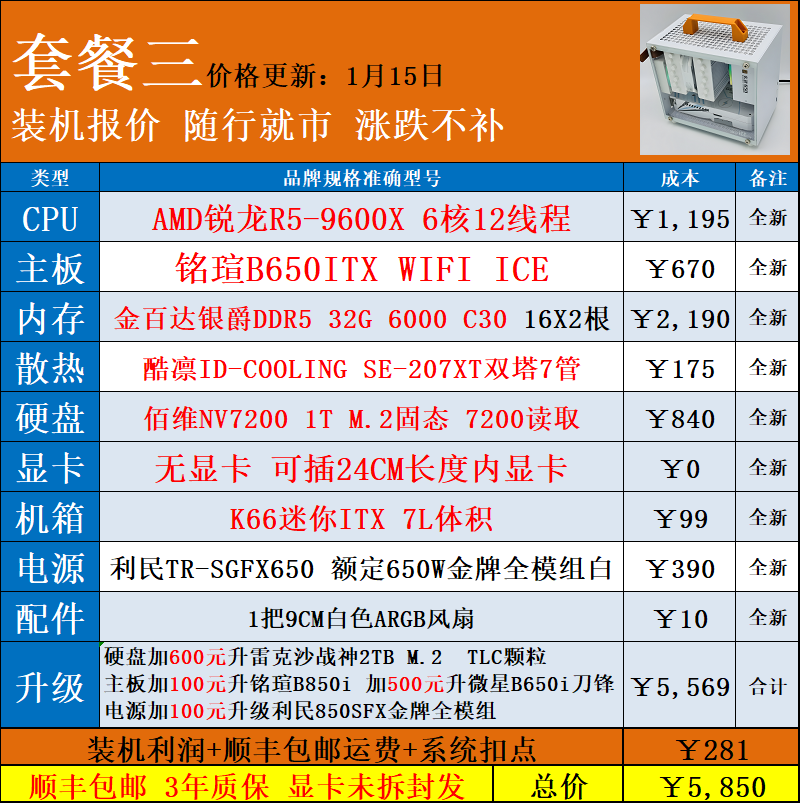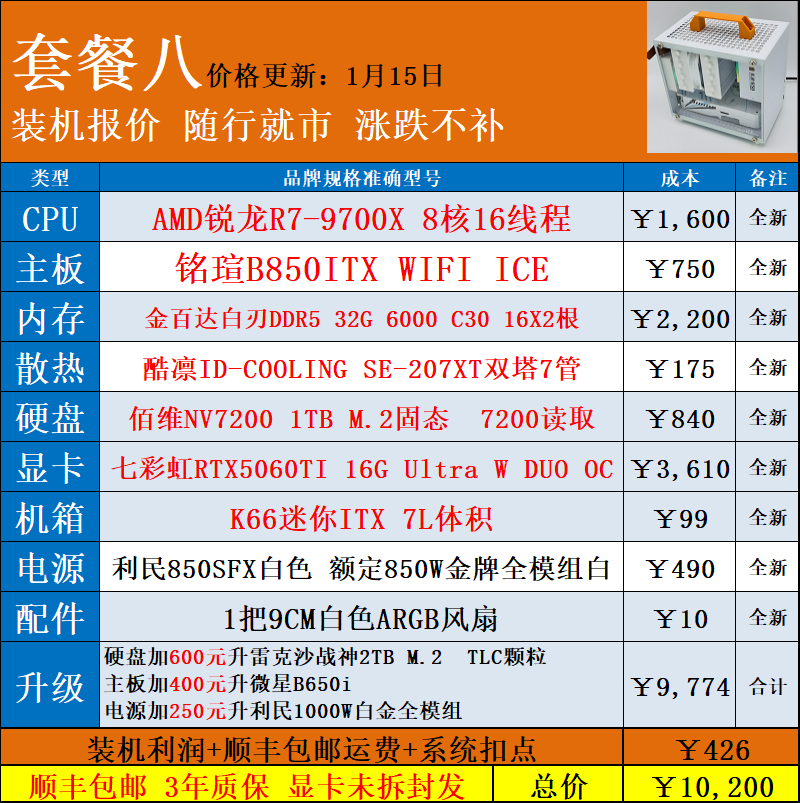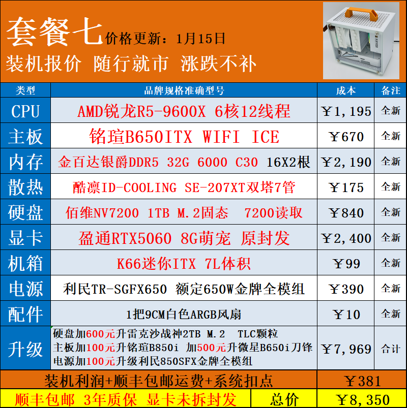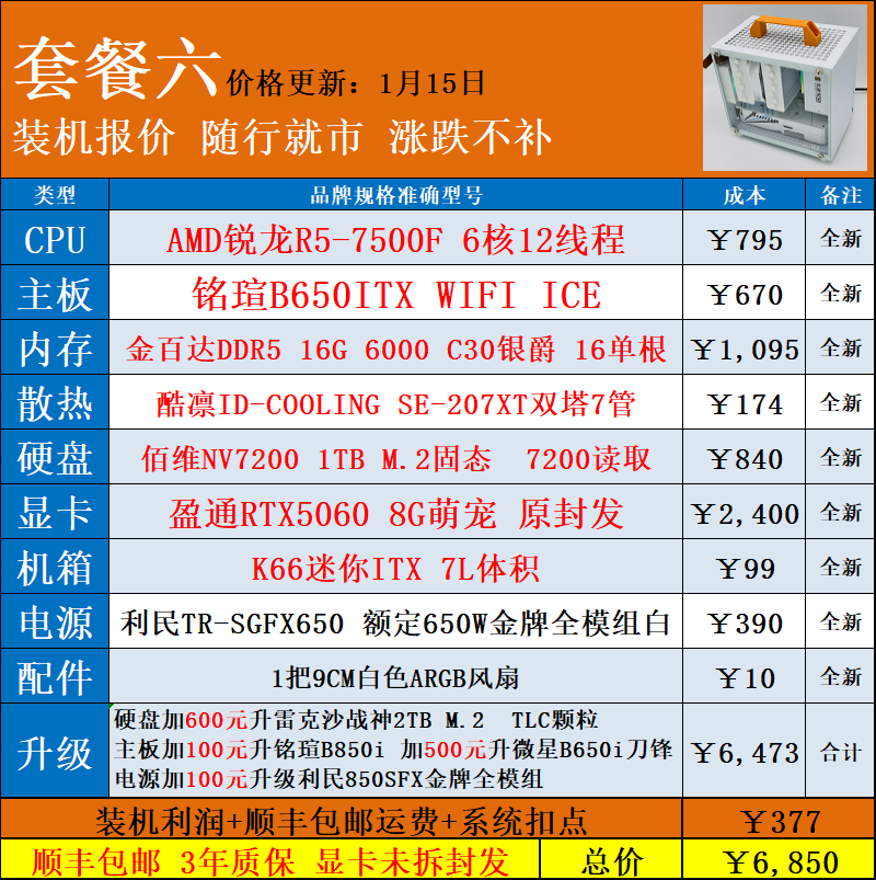 | Package Type | Package 1 5600X+ Without Card,Package 2 7500F+ Without Card,Package Three 9600X+ Without Card,Package 4 9700X+ Without Card,Package 5 5600X+Rtx5050 8g,Package 6 7500F+Rtx5060 8g,Package 7 9600X+Rtx5060 8g,Package 8 9700X+5060Ti 16g |