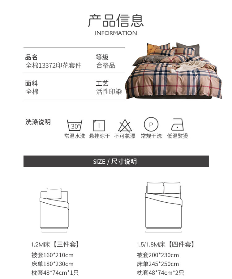 | Applicable Bed Size | 1.2m Three-Piece Bed Sheet Set (Suitable for Quilt 150*200),1.5m Bed Sheet Four-Piece Set[Suitable for Quilt 200×230],1.8m Bed Sheet Four-Piece Set[Suitable for Quilt 200×230],2.0m Bed Sheet Four-Piece Set[Quilt Cover 220×240cm],1.5m Fitted Sheet Set of Four,1.8m Fitted Sheet Set of Four |