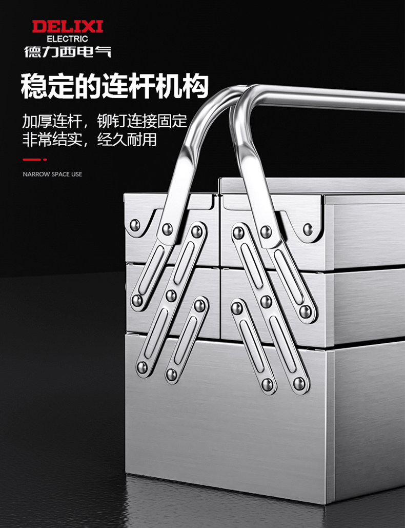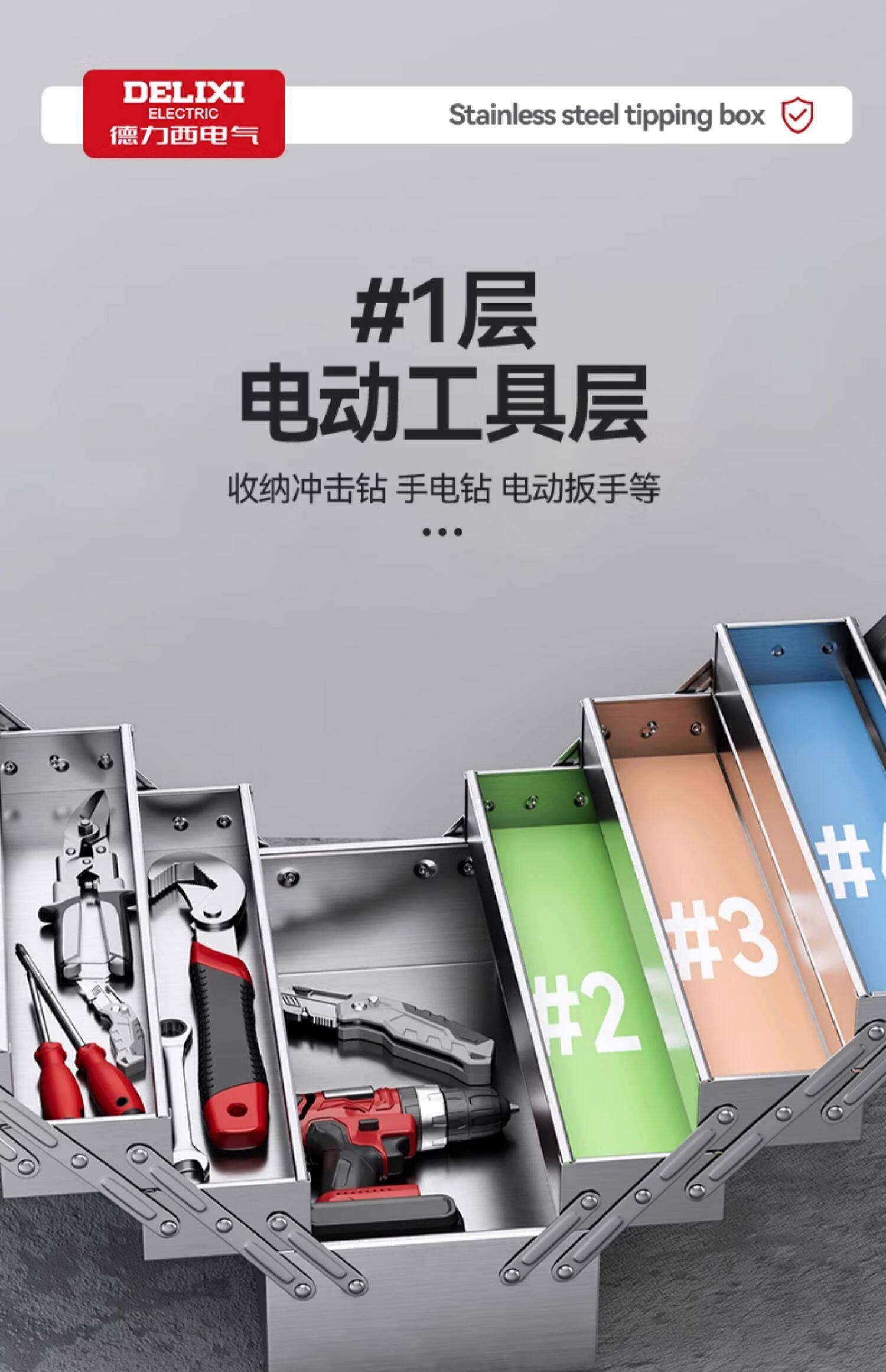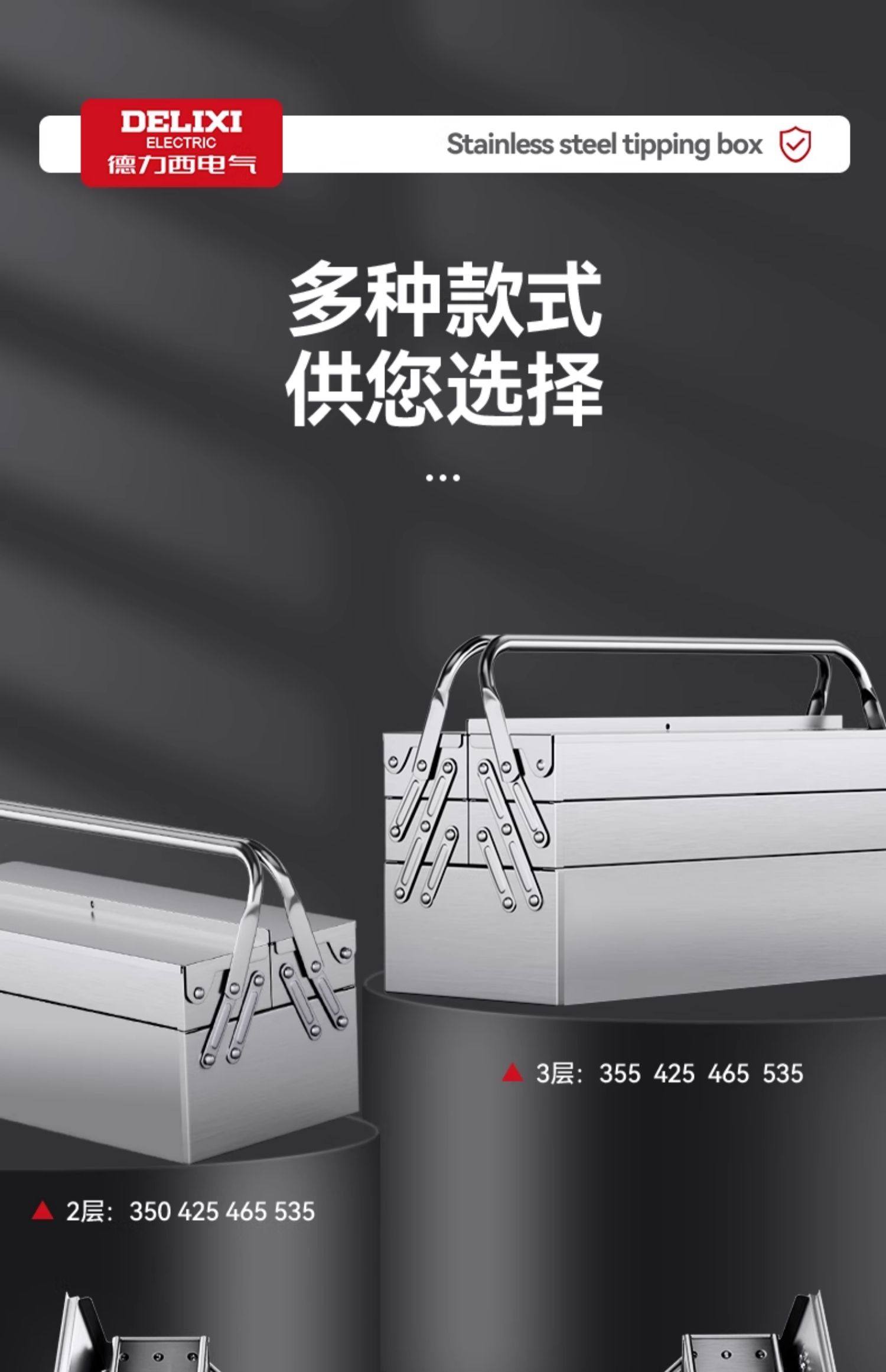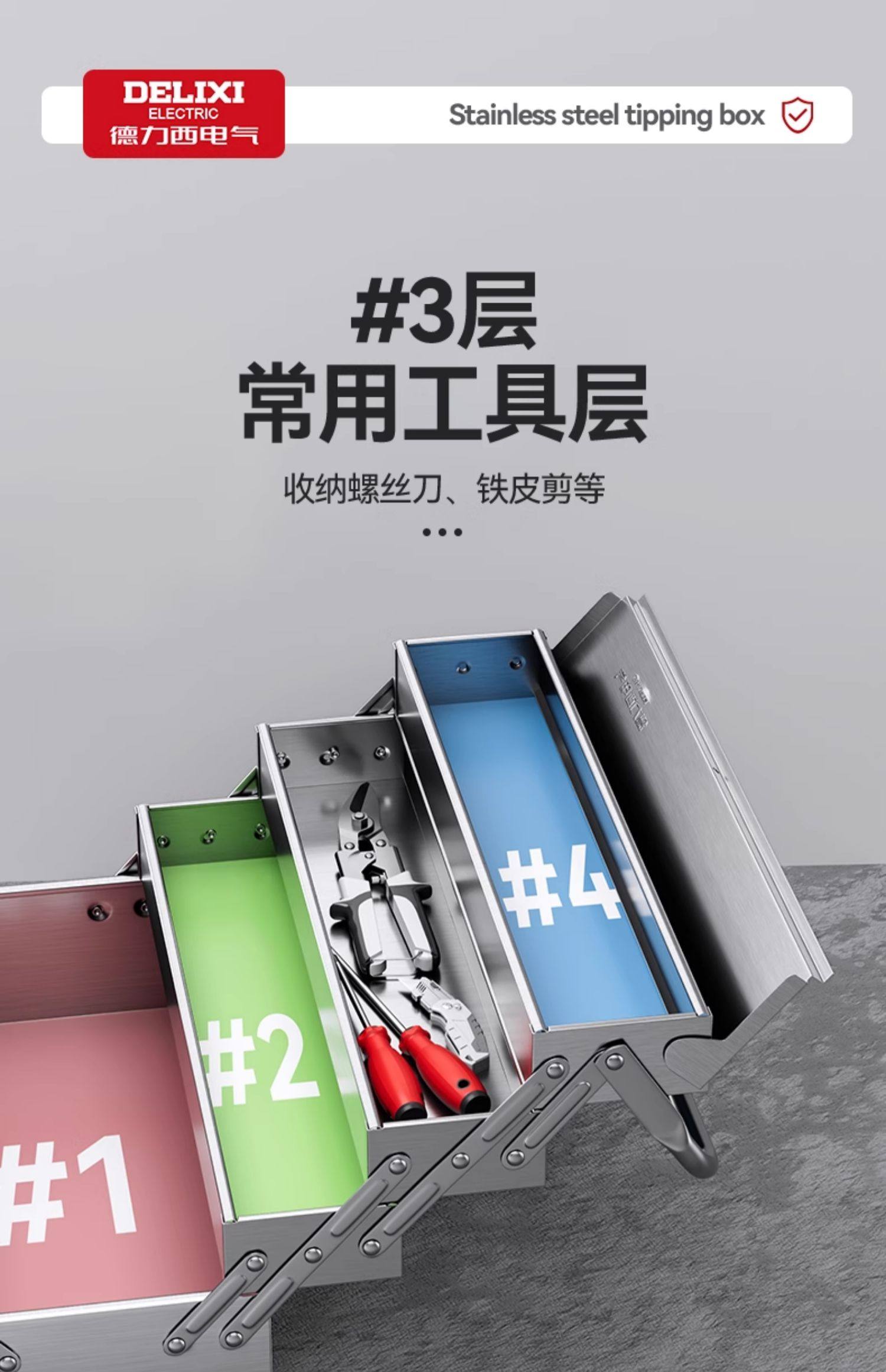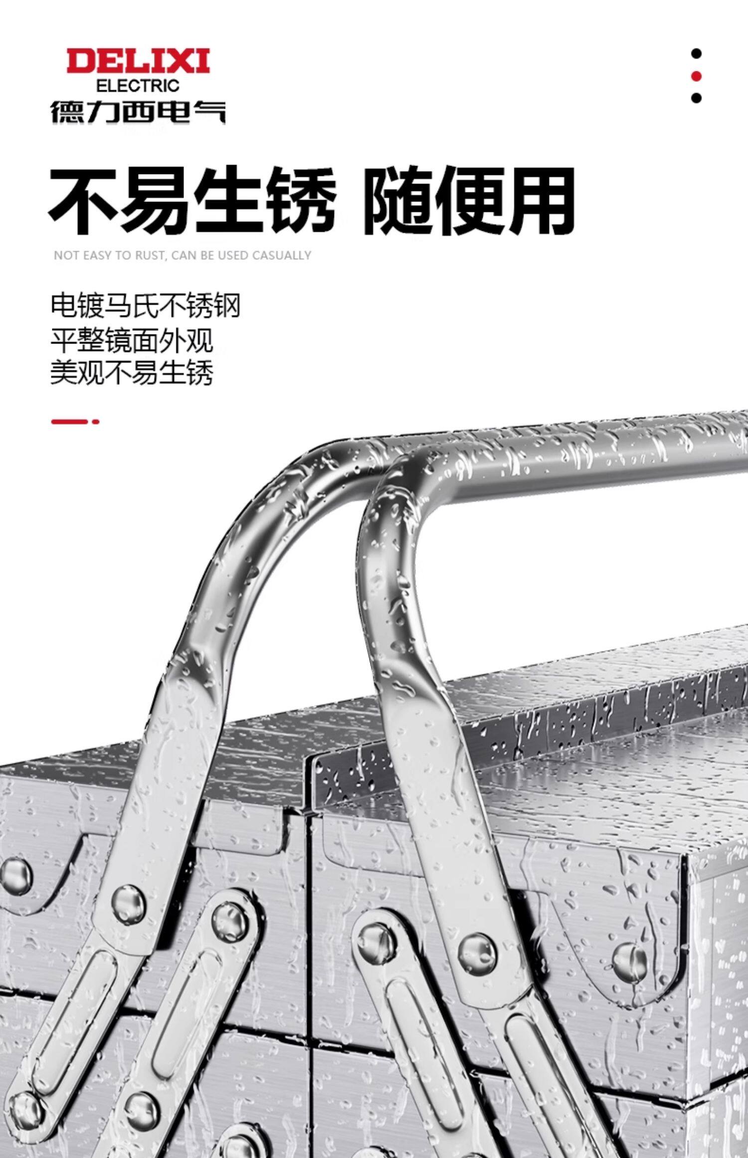 Delixi Electric Stainless Steel Tool Box, Household Multi-Functional Hardware Three-Layer Foldable Industrial-Grade Storage Box with Lock