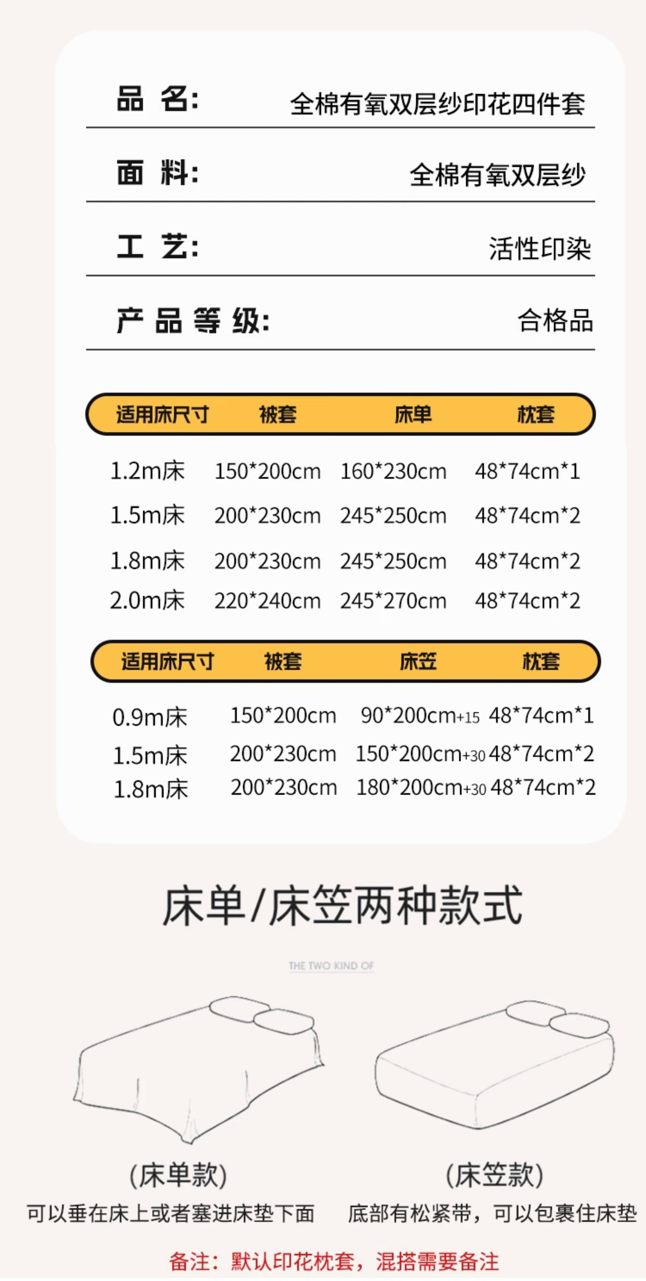 | Applicable Bed Size | 1.2m Bed Sheet Three-Piece Set[Suitable for Quilt 150×200],1.5m Bed Sheet Four-Piece Set[Suitable for Quilt 200×230],1.8m Bed Sheet Four-Piece Set[Suitable for Quilt 200×230],2.0m Bed Sheet Four-Piece Set[Quilt Cover 220×240cm],1.5m Fitted Sheet Set of Four,1.8m Fitted Sheet Set of Four |
