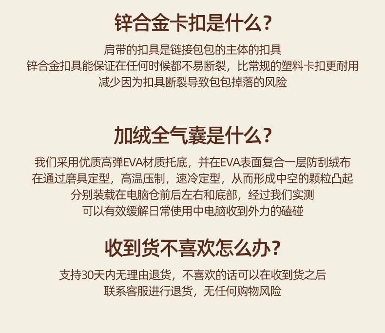 | Color Classification | 2025 New Arrival - Warm Sun Rice [360°Fleece-Lined Airbag Computer Compartment + Sbs Zipper + Metal Shoulder Strap Buckle + Hidden Back Pocket + Trolley Strap],2025 New Model-Space Gray [360°Fleece-Lined Airbag Computer Compartment + Sbs Zipper + Metal Shoulder Strap Buckle + Hidden Back Pocket + Trolley Strap],2025 New Style-Mysterious Black [360°Fleece-Lined Airbag Computer Compartment + Sbs Zipper + Metal Shoulder Strap Buckle + Hidden Back Pocket + Trolley Strap],Nuanyang Rice-[360°Fleece-Lined Airbag Compartment + Metal Shoulder Strap Buckle + Sbs Big Brand Zipper + Hidden Back Pocket + Double Water Bottle Compartment],Gentleman Gray-[360°Fleece-Lined Airbag Compartment + Metal Shoulder Strap Buckle + Sbs Big Brand Zipper + Hidden Back Pocket + Double Water Bottle Compartment],Mysterious Black-[360 ° Fleece-Lined Airbag Compartment + Metal Shoulder Strap Buckle + Sbs Big Brand Zipper + Hidden Back Pocket + Double Water Bottle Compartment],Nuanyangmi-[Sbs Zipper + Double Water Cup Compartment + Hidden Back Pocket + Trolley Case Strap + Back Ventilation Net],Gentleman Gray - [Sbs Zipper + Dual Water Bottle Compartments + Hidden Back Pocket + Trolley Sleeve + Back Ventilation Mesh],Mysterious Black - [Sbs Zipper + Dual Water Bottle Compartments + Hidden Back Pocket + Trolley Sleeve + Back Ventilation Mesh],Nuanyangmi-[Fleece Airbag + Sbs Big Brand Zipper + Metal Shoulder Strap Buckle + Hidden Back Pocket + Pull Rod Strap],Space Gray - [Fleece-Lined Airbag + Sbs Premium Zipper + Metal Shoulder Strap Buckle + Hidden Back Pocket + Trolley Sleeve],Gentleman Gray - [Fleece-Lined Airbag + Sbs Premium Zipper + Metal Shoulder Strap Buckle + Hidden Back Pocket + Trolley Sleeve],Mysterious Black - [Fleece-Lined Airbag + Sbs Premium Zipper + Metal Shoulder Strap Buckle + Hidden Back Pocket + Trolley Sleeve],2025 New Double Main Warehouse-Nuanyangmi [360°Fleece-Lined Airbag + Sbs Zipper + Metal Shoulder Strap Buckle + Wet and Dry Separation Pocket + Hidden Back Pocket],2025 New Double Compartment - Gentleman Grey [360]°Fleece-Lined Airbag + Sbs Zipper + Metal Shoulder Strap Buckle + Wet and Dry Separation Pocket + Hidden Back Pocket],2025 New Double Compartment - Mysterious Black [360°Fleece-Lined Airbag + Sbs Zipper + Metal Shoulder Strap Buckle + Wet and Dry Separation Pocket + Hidden Back Pocket],365 Days Free Warranty|30-Day No-Questions-Asked Return Policy|180 Days Replacement for Damage |