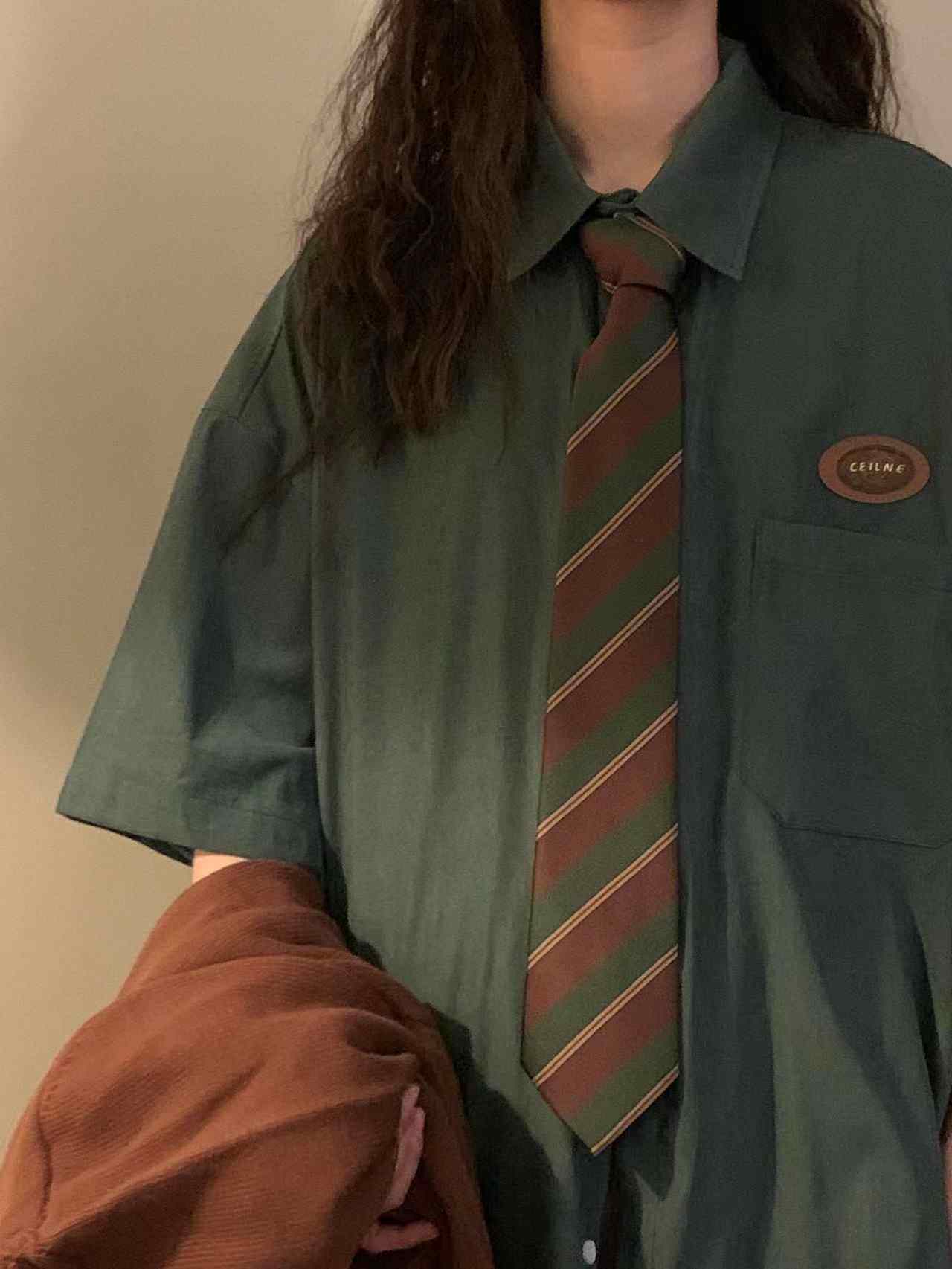 Green Striped Brown Hand-Tied Tie Shirt Accessory for Women, Retro Style Casual Versatile Jk School Style Tie for Women