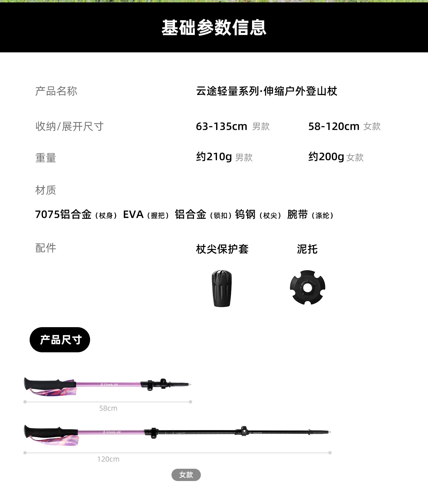 | Color Classification | The Following External Locking Telescopic Models[Backpack Attachment],[Light Purple]Women's Model - Cloud Grip | Metal Lock | True 7075,[Dark Red]Women's Model - Cloud Grip | Metal Lock | True 7075,Lanye Men's Model-Cloud Grip丨Metal Lock丨True 7075,Pine Green Men's Model-Cloud Grip丨Metal Lock丨True 7075,Save 6 yuan on 1 pair, light purple, women's style丨Zhen 7075,Save 6 yuan on 1 pair of clothing, Yin Hong, women's style | Zhen 7075,[Save 6 Yuan When Buying 1 Pair][Lanye]Men's | Authentic 7075,[Save 6 Yuan When Buying 1 Pair][Pine Green]Men's | Authentic 7075,Luoqing EVA handle丨Aluminum alloy telescopic style丨220g,Jet black EVA handle丨Aluminum alloy telescopic model丨220g,The Following Folding Models[Easy to Put in Bag],Taro Purple - Women's Style[33cm Folding Storage]7075 Staff Body,Rose Pink-Girls Style[33cm Folding Storage]7075 Staff Body,Men's Model - Navy Blue[Genuine High-Quality Stacked [Number]],Men's Model - Flame Orange[Genuine High-Quality Stacked [Number]],Folding Model-Orange[Storage 35cm, Height 155-185cm],Folding Model-Black[Storage 35cm, Height 155-185cm],Folding Model-Blue[Storage 35cm, Height 155-185cm],T-Handle Folding Model[Matte Black]Suitable for Height 150-180cm,The Following Children's Models[Family Time],Smurfs telescopic storage 58cm丨buckle lock height 160cm,Fresh Purple[Telescopic Storage 61cm | External Lock]Height ≤160Cm,Vibrant Orange[Telescopic Storage 61cm | External Lock]Height ≤160Cm,The Following Is[Carbon Fiber Trekking Pole],3K Carbon Folding[215g Folding 36cm Backpack Storage]Unisex,3K Carbon External Lock[166g Light and No Burden]No Height Limit,Smoke Purple[Carbon Fiber External Lock Telescopic 3D Anti-Slip Handle]168g,Apricot Yellow[Carbon Fiber External Lock Telescopic 3D Anti-Slip Handle]168g,True Blue[Carbon Fiber External Lock Telescopic 3D Anti-Slip Handle]168g |