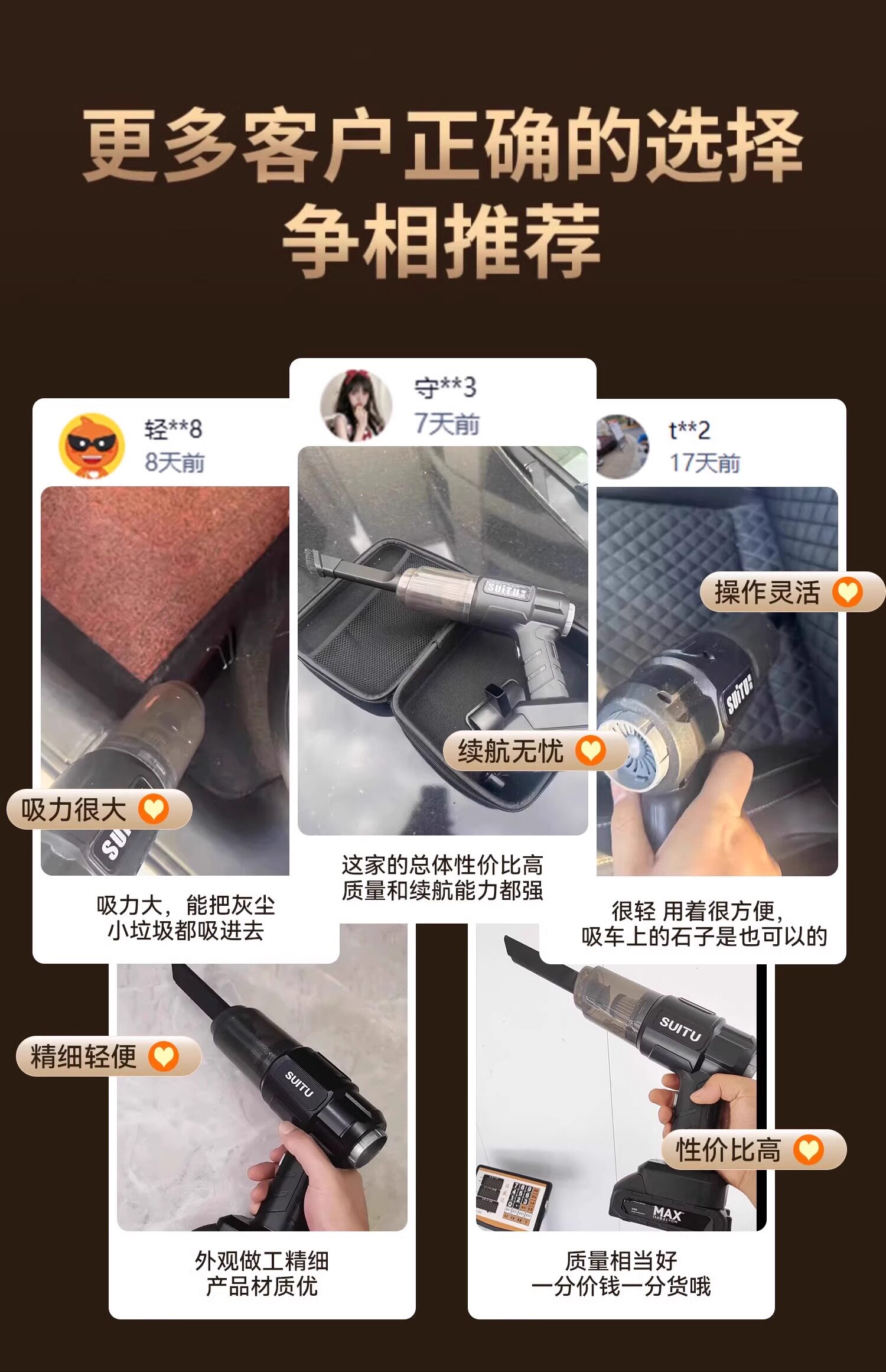 | Color Classification | ✅599999R Strong Suction [Pure Copper Deluxe Model - 5 Sections 10 Cores] Comes with Washable Filter *5/Removable Battery/Suction, Blow and Charge in One,699999R Strong Suction [Pure Copper Collection Model-5 Sections 10 Cores] Comes with Washable Filter *5 + Special Storage Bag/Removable Battery/Suction, Blow and Charge in One,✅799999R Strong Suction [Pure Copper Top Version - 5 Sections and 10 Cores] Comes with a Washable Filter *5 + Special Storage Bag + Spare Battery/Removable Battery/Suction, Blow, Charge and Pump in One,399999R Suction Power [Basic Model-5 Sections 10 Cores] No Accessories,499999R Suction Power [Pure Copper Upgrade - 5 Sections and 10 Cores] Removable Battery/Suction, Blow, Charge and Pump in One,399999R Suction Power [Pure Copper Permanent Magnet Luxury Model-10 Sections 20 Cores] Removable Battery/Suction and Blow 1 Body,499999R Suction Power [Pure Copper Permanent Magnet High-Performance Model-10 Sections 20 Cores] Removable Battery/Suction, Blow, Charge and Pump in One,599999R Strong Suction [Pure Copper Permanent Magnet Collection Model - 10 Sections 20 Cores] Comes with Washable Filter *5/Removable Battery/1 Body for Suction, Blowing, Charging and Pumping,899999R Strong Suction [Pure Copper Permanent Magnet Top Model - 10 Sections 20 Cores] Comes with Washable Filter *5 + Special Storage Bag / Removable Battery / Suction, Blow, Charge and Pump 1 in 1,✅ 999999R Strong Suction [Pure Copper Permanent Magnet Ai Top Model - 10 Sections 20 Cores] Comes with Washable Filter *5 + Special Storage Bag + Spare Battery/Removable Battery/Suction, Blow, Charge and Pump in One,German Pure Copper Motor Ai Smart Chip Hurricane High Suction Power,Chejia Outdoor Multi-Purpose Suction, Blowing, Charging and Pumping 4-in-1 Removable Battery,999999R Explosive Suction [Pure Copper Permanent Magnet Dual Electric Model-10C Dual Electric] + 10C Lithium Battery * 2 + Storage Bag + Stainless Steel Filter * 1 + Washable Filter * 2 + 365 Days of Replacement,969999R Explosive Suction [Pure Copper Permanent Magnet Collection Model-10C Single Battery] + Storage Bag + Stainless Steel Filter *1 + Washable Filter *2 + 365 Days Replacement,399999R Suction Power [Pure Copper Basic Model-5 Cells Single Battery]/Removable Battery/Suction and Blow 1 Body,499999R Suction Power [Pure Copper Upgrade - 5 Cells Single Battery] Comes with 2 Washable Filters/Removable Battery/Suction and Blow in One,799999R Strong Suction [Pure Copper Dual Electric Collection Model-5 Sections Dual Electric] Comes with Washable Filter *5 + Special Storage Bag + Spare Battery/Removable Battery/Suction, Blow, Charge and Pump in One,699999R Strong Suction [Pure Copper Collection Model-5 Cells Single Battery] Comes with 5 Washable Filters + Special Storage Bag/Removable Battery/Suction, Blow and Charge in One |