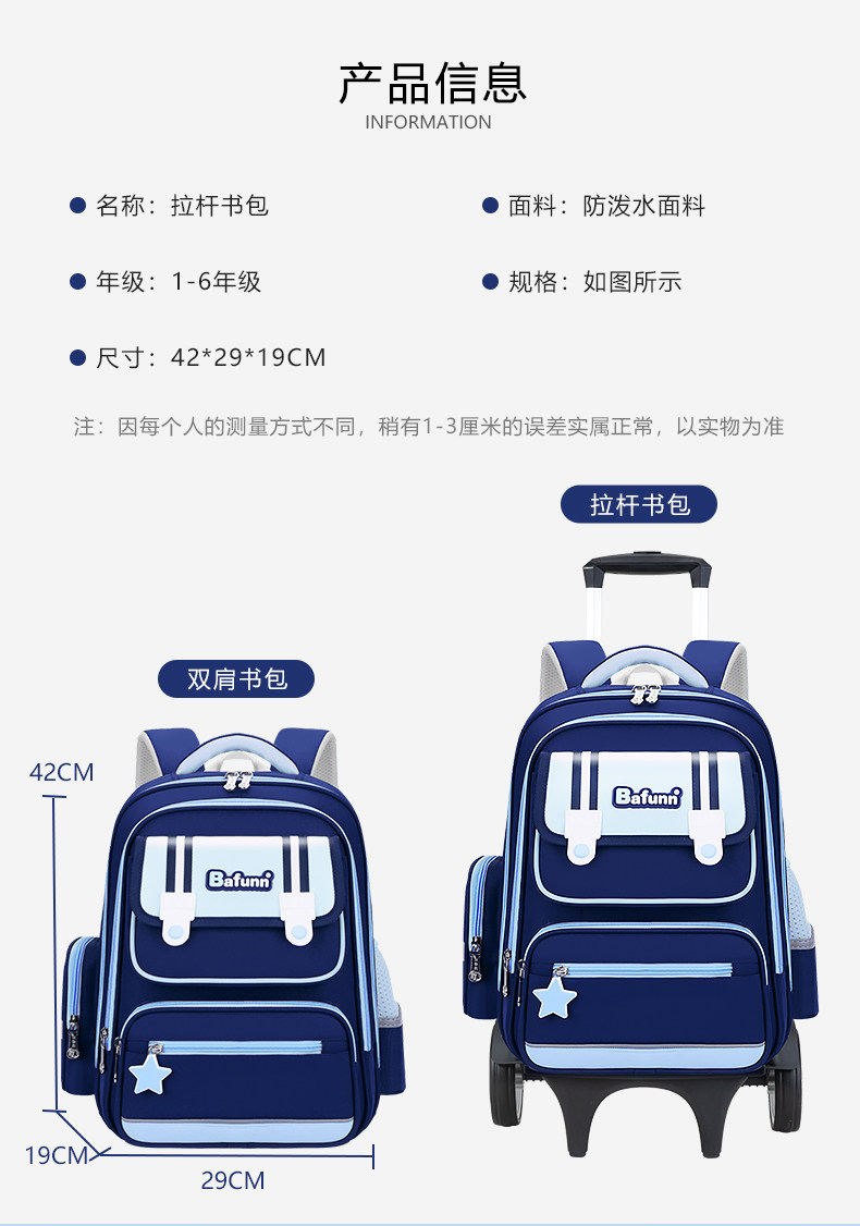 | Color Classification | Sky Blue + Separate Backpack - No Trolley,Sky Blue Backpack + Two-Wheel Trolley,Sky Blue Backpack + Six-Wheel Trolley,Sky Blue Backpack + High-Leg Six-Wheel Trolley,Sky Blue Backpack + Upgraded Large Two-Wheel Trolley,Pink + Separate School Bag - No Trolley,Pink School Bag + Two-Wheel Trolley,Pink School Bag + Six-Wheel Trolley,Pink School Bag + Tall Six-Wheel Trolley,Pink School Bag + Upgraded Large Two-Wheel Trolley,Green + Separate School Bag - No Pull Rod,Green School Bag + Two-Wheel Trolley,Green School Bag + Six-Wheel Trolley,Green Backpack + High-Leg Six-Wheel Trolley,Green Backpack + Upgraded Large Two-Wheel Trolley,Purple + Separate School Bag - No Pull Rod,Purple School Bag + Two-Wheel Trolley,Purple School Bag + Six-Wheel Trolley,Purple School Bag + Tall Six-Wheel Trolley,Purple School Bag + Upgraded Large Two-Wheel Trolley,Red + Separate School Bag - No Trolley,Red Backpack + Two-Wheel Trolley,Red Backpack + Six-Wheel Trolley,Red Backpack + High-Leg Six-Wheel Trolley,Red Backpack + Upgraded Large Two-Wheel Trolley |