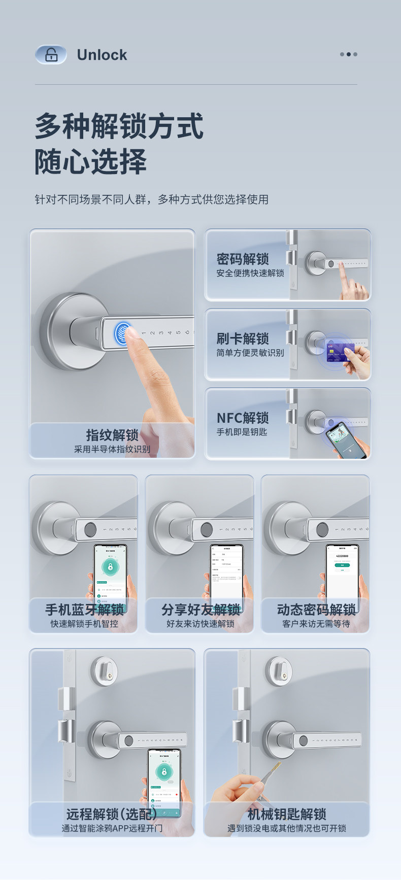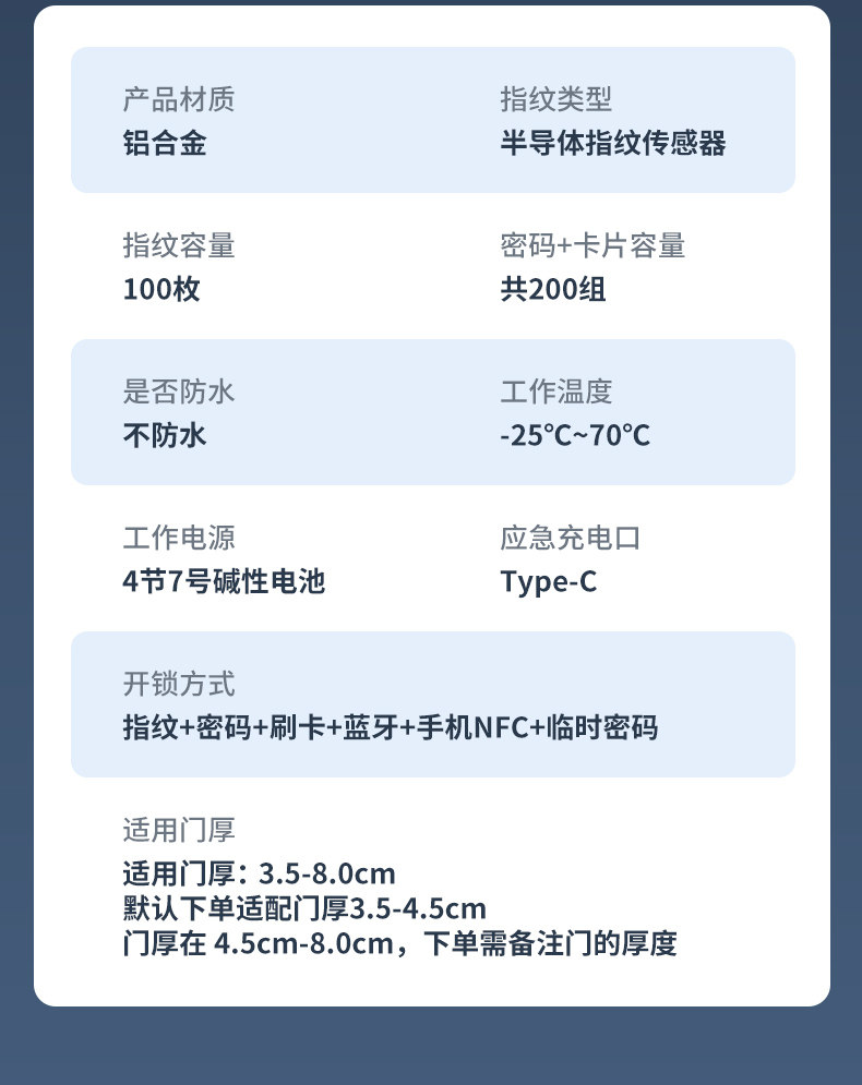 | Finish Color | [Double Tongue] Silver Regular Edition (Fingerprint + Password + Key),【Dual Tongue】Silver Card Swipe Bluetooth Version (App Management + 5 Unlocking Methods),【Dual Tongue】Silver Card Swipe Network Version (Remote App Management + 5 Unlocking Methods),【Dual Tongue】Black Standard Edition (Fingerprint + Password + Key),【Dual Tongue】Black Card Swipe Bluetooth Version (App Management + 5 Unlocking Methods),【Dual Tongue】Black Card Swipe Network Version (Remote App Management + 5 Unlocking Methods),[Single Tongue] Silver Regular Version (Fingerprint + Password + Key),【Single Tongue】Silver Card Swipe Bluetooth Version (App Management + 5 Unlocking Methods),【Single Tongue】Silver Card Swipe Network Version (Remote App Management + 5 Unlocking Methods),[Single Tongue] Black Regular Version (Fingerprint + Password + Key),【Single Tongue】Black Card Swipe Bluetooth Version (App Management + 5 Unlocking Methods),【Single Tongue】Black Card Swipe Network Version (Remote App Management + 5 Unlocking Methods),Fire Door Handle Lock |