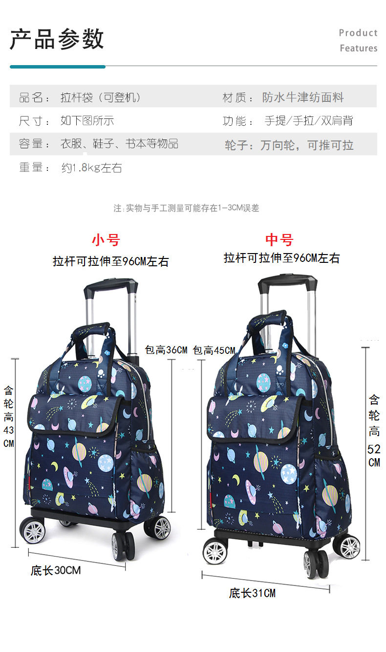 | Color Classification | Medium Black (with Ordinary Four-Wheel Aircraft Wheel Pull Rod),Medium Baolan (with Ordinary Four-Wheel Aircraft Wheel Pull Rod),Medium-Sized Star (with Standard Four-Wheel Aircraft Wheel Trolley),Medium-Sized "Cosmos" (with Standard Four-Wheel Aircraft Wheel Trolley),Medium-Sized Rabbit (with Standard Four-Wheel Aircraft Wheel Trolley),Medium Butterfly (with Ordinary Four-Wheel Aircraft Wheel Pull Rod),Small Black (with Thickened Four-Wheel Aircraft Wheel Pull Rod),Small Universe (with Thickened Four-Wheel Aircraft Wheel Pull Rod),Small Rabbit (with Thickened Four-Wheel Aircraft Wheel Pull Rod),Small Butterfly Flower (with Thickened Four-Wheel Aircraft Wheel Trolley),Small Colored Leaves (with Thickened Four-Wheel Aircraft Wheel Pull Rod),Small Star (with Heavy-Duty Four-Wheel Aircraft Wheels and Trolley Handle),Small Bear (with Thickened Four-Wheel Aircraft Wheel Pull Rod),Small Deer (with Thickened Four-Wheel Aircraft Wheel Pull Rod),Medium Black (with Heavy-Duty Four-Wheel Spinner Wheels and Trolley Handle),Medium-Sized "Cosmos" (with Reinforced Four-Wheel Aircraft Wheels and Trolley Handle),Medium-Sized Star (with Heavy-Duty Four-Wheel Aircraft Wheels and Trolley Handle),Medium Baolan (with Thickened Four-Wheel Aircraft Wheel Pull Rod),Medium Butterfly Flower (with Heavy-Duty Four-Wheel Aircraft Wheels and Trolley Handle),Medium-Sized Bunny (with Thickened Four-Wheel Aircraft Wheel Pull Rod),Medium-Sized Deer (with Thickened Four-Wheel Aircraft Wheel Pull Rod),Medium-Sized Cat Carrier (with Reinforced Four-Wheel Aircraft Wheels and Trolley Handle),Large Black (with Thickened Large Bottom Plate and Four-Wheel Aircraft Wheels),Large Dark Blue Small Leaves (with Thickened Large Base Plate and Four-Wheel Aircraft Wheels),Large Rose Flower (with Thickened Large Base Plate and Four-Wheel Aircraft Wheels),Large Camouflage (with Thickened Large Bottom Plate and Four-Wheel Aircraft Wheels),Large Bear (with Thickened Large Base Plate and Four-Wheel Aircraft Wheels),Large Ink Orchid Rose (with Thickened Large Base Plate and Four-Wheel Aircraft Wheels),Large-Sized "Butt Orchid" Scooter (Equipped with Thickened, Large Base Plate and Four-Wheel Aircraft Wheels),Large Plaid Material Black (with Thickened Large Bottom Plate and Four-Wheel Aircraft Wheels),Large Plaid Material Universe (with Thickened Large Bottom Plate and Four-Wheel Aircraft Wheels),Large Plaid Material Black Cat (with Thickened Large Bottom Plate and Four-Wheel Aircraft Wheels),Large Plaid Material Blue Cat (with Thickened Large Bottom Plate and Four-Wheel Aircraft Wheels),Large Plaid Sunflower (with Thickened Large Base Plate and Four-Wheel Aircraft Wheels),Large Plaid Material Small Grass Flower (with Thickened Large Bottom Plate and Four-Wheel Aircraft Wheels),Large Plaid Material Deer (with Thickened Large Bottom Plate and Four-Wheel Aircraft Wheels) |