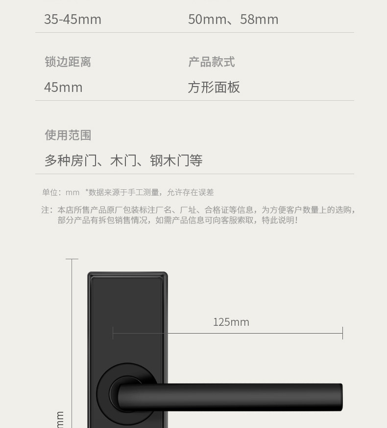 | Color Classification | Gentleman Black Model a Quality Panel [Excluding Lock Body, Lock Cylinder and Key],Gentleman Black [Type a Quality Complete Set] 125 Lock Body Tongue Distance 48,Gentleman Black [A-Grade Quality Complete Set] 125 Lock Body - Tongue Distance 60,Gentleman Black [A-Grade Quality Complete Set] 135 Lock Body - Tongue Distance 48,Gentleman Black [A-Grade Quality Complete Set] 138 Lock Body - Tongue Distance 60,Gentleman Black [A-Grade Quality Complete Set] 145 Lock Body - Tongue Distance 65,Gentleman Black [A-Grade Quality Complete Set] 145 Lock Body - Tongue Distance 75,Gentleman Black [A-Grade Quality Complete Set] 148 Lock Body - Tongue Distance 75,Gentleman Black [A-Grade Quality Complete Set] 160 Lock Body - Tongue Distance 80,Gentleman Black [A-Grade Quality Complete Set] 160 Lock Body - Tongue Distance 85,Stainless Steel Quality Panel [Excluding Lock Body, Lock Cylinder and Key],【Stainless Steel Premium Set】125 Lock Body - 48mm Backset,【Premium Stainless Steel Set】125 Lock Body - 60mm Backset,【Stainless Steel Premium Set】135 Lock Body - 48mm Backset,【Stainless Steel Premium Set】138 Lock Body - 60mm Backset,【Stainless Steel Premium Set】145 Lock Body - 75mm Backset,【Stainless Steel Premium Set】148 Lock Body - 75mm Backset,【Stainless Steel Premium Set】155 Lock Body - 85mm Backset,【Stainless Steel Premium Set】160 Lock Body - 80 Latch Bolt Stroke,【Stainless Steel Premium Set】160 Lock Body - 85mm Backset,58 Black Square Panel [Excluding Lock Body, Lock Cylinder Key],【58 Black Square Full Set】165 Lock Body - Tongue Distance 75,【58 Black Square Full Set】170 Lock Body - Tongue Distance 95,【58 Black Square Full Set】175 Lock Body - Tongue Distance 95,【58 Black Square Full Set】180 Lock Body - Tongue Distance 100,58 Square Panel [Excluding Lock Body, Lock Cylinder Key],[58 Square Complete Set] 165 Lock Body - Tongue Distance 75,[58 Square Complete Set] 170 Lock Body - Tongue Distance 95,[58 Square Complete Set] 175 Lock Body - Tongue Distance 95,[58 Square Complete Set] 180 Lock Body - Tongue Distance 100 |
