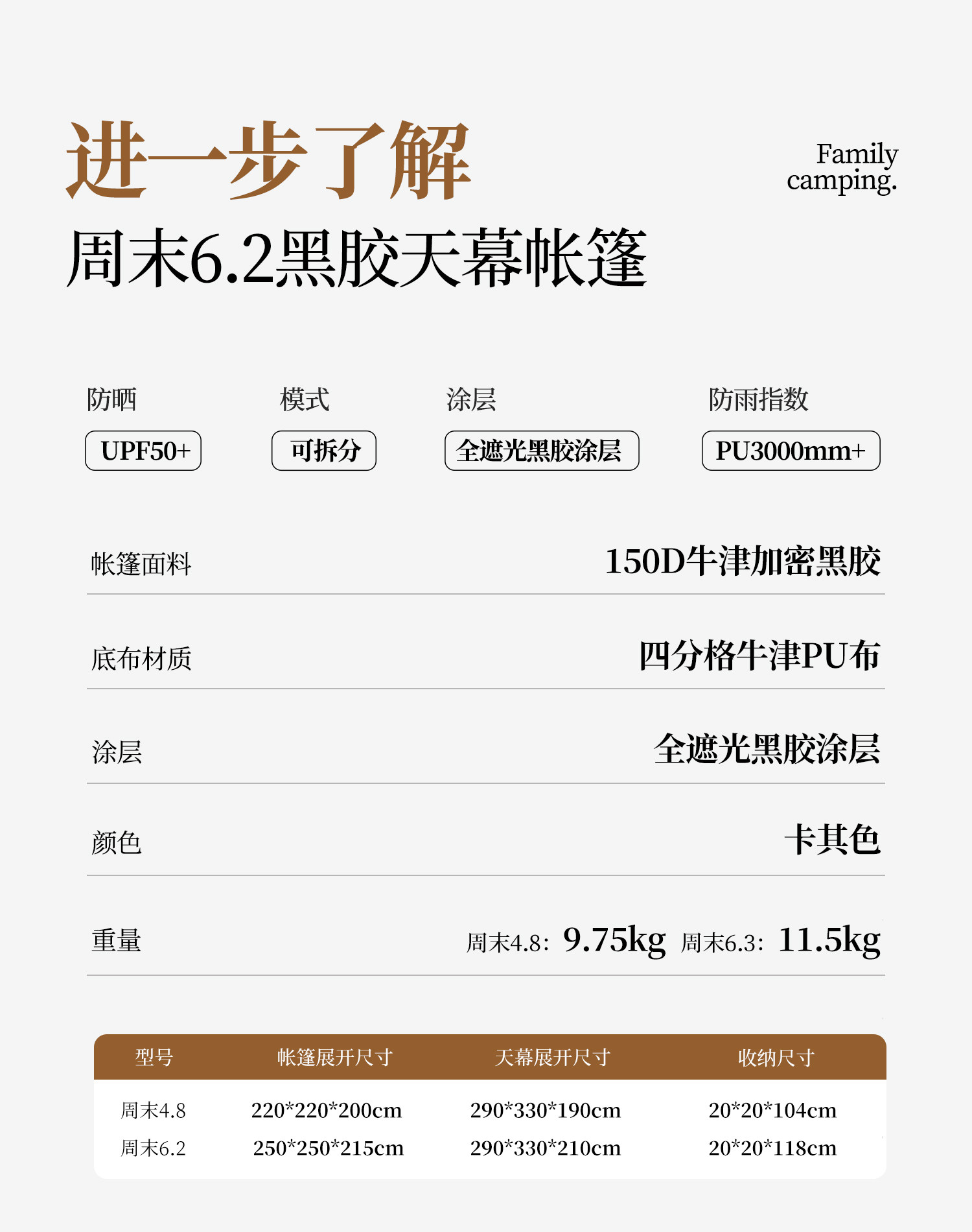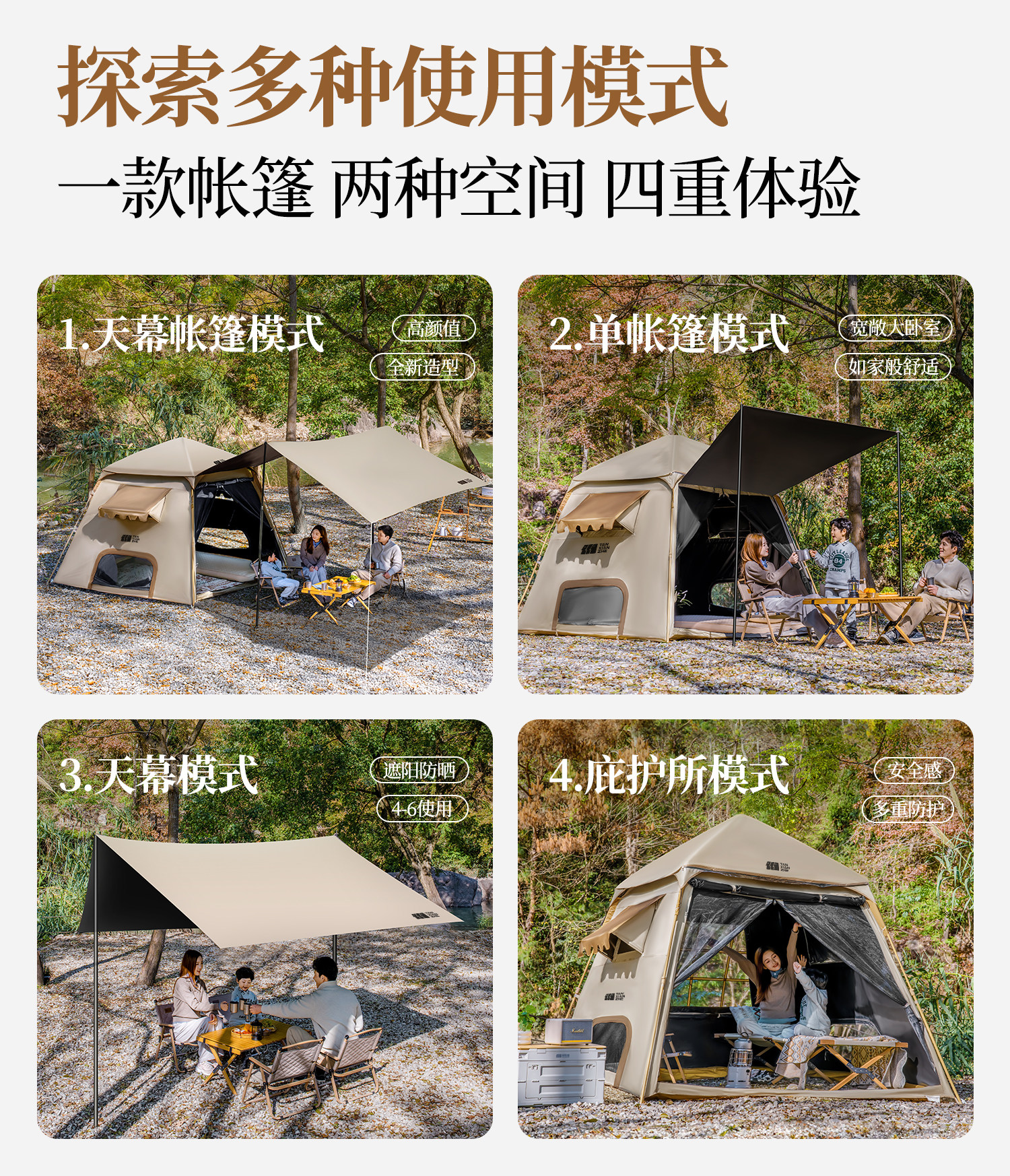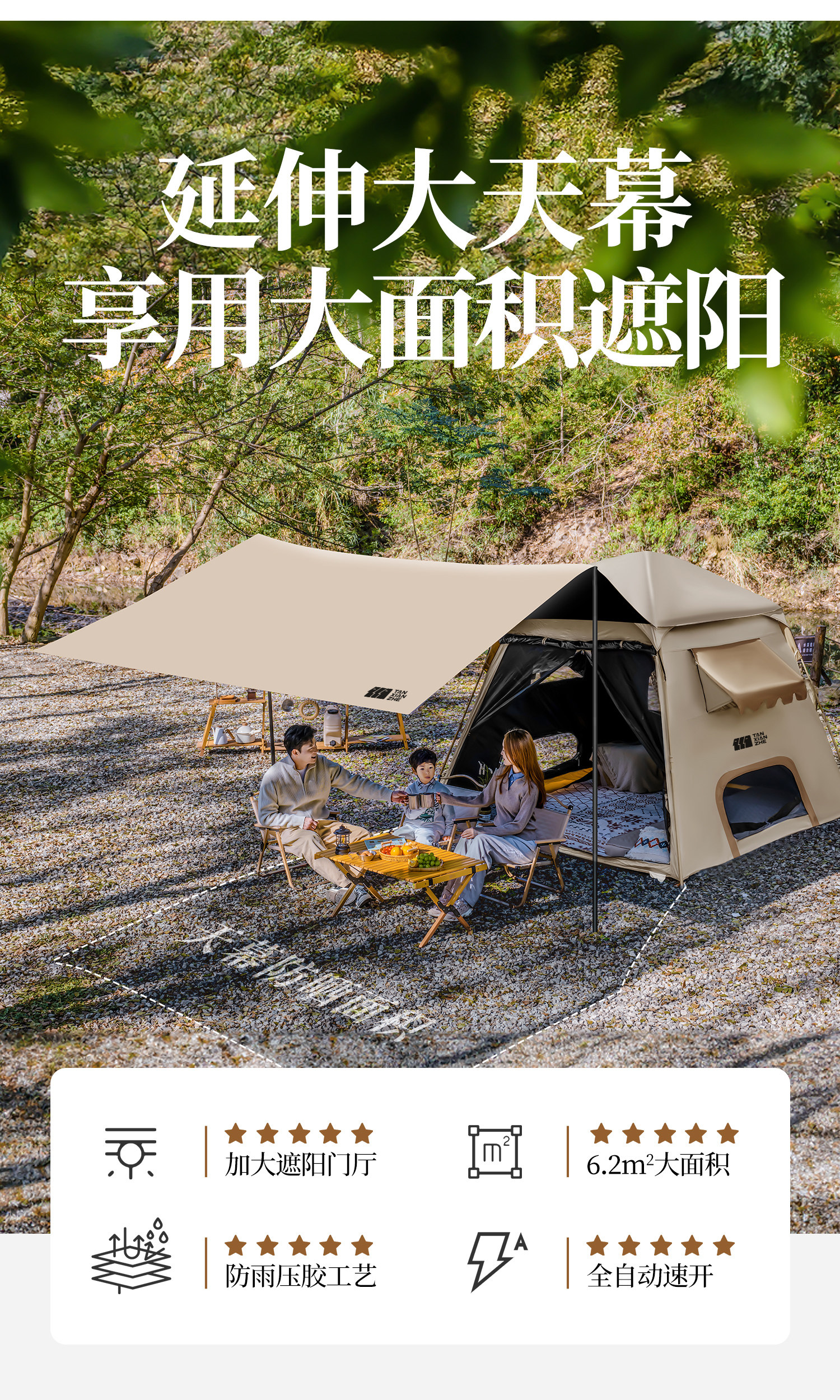 | Color Classification | [Weekend Automatic - Khaki (One-Touch Open, Automatic Setup)],Fully Blackout Vinyl Fabric Blocks 99%.9% Uv,[Weekend 4.8 - Upgraded Canopy]Full Blackout Vinyl + Tent Height 2m,[Weekend 4.8-Picnic Mat Package]+Ultrasonic Picnic Mat,[Weekend 4.8-Inflatable Mattress Package]+3Cm Automatic Inflatable Mattress,[Weekend 4.8-Inflatable Bed Package]+Upgraded Automatic Inflatable Bed with Built-In Pump,[Weekend 4.8-Night Camping Package]+Inflatable Bed+Camping Style Light+Sleeping Bag*2,[Weekend 4.8-Picnic Table and Chairs Package]+Moon Chair*4+120 Egg Roll Table*1,[Weekend 4.8-Camping Table and Chair Package]+Kermit Chair*4+120 Egg Roll Table*1,[Weekend 4.8-Upgraded Picnic Table and Chairs + Campervan Package],[Weekend 4.8-Upgraded Camping Table and Chairs + Campervan Package],[Weekend 4.8-Camping Complete Equipment],[Weekend 6.2. Upgraded Canopy]Full Blackout Vinyl + Tent Height 2.1M,[Weekend 6.2-Picnic Mat Package]+Ultrasonic Picnic Mat,[Weekend 6.2-Inflatable Mattress Package]+3Cm Automatic Inflatable Mattress,[Weekend 6.2-Inflatable Bed Package]+Upgraded Automatic Inflatable Bed with Built-In Pump,[Weekend 6.2--Overnight Camping Package]+Inflatable Bed+Camping Style Light+Sleeping Bag*2,[Weekend 6.2--Picnic Table and Chair Package]+Moon Chair*4+120 Egg Roll Table*1,[Weekend 6.2--Camping Table and Chair Package]+Kermit Chair*4+120 Egg Roll Table*1,[Weekend 6.2--Upgraded Picnic Table and Chairs + Campervan Package],[Weekend 6.2--Upgraded Camping Table and Chairs + Campervan Package],[Weekend 6.2--Complete Set of Camping Equipment] |