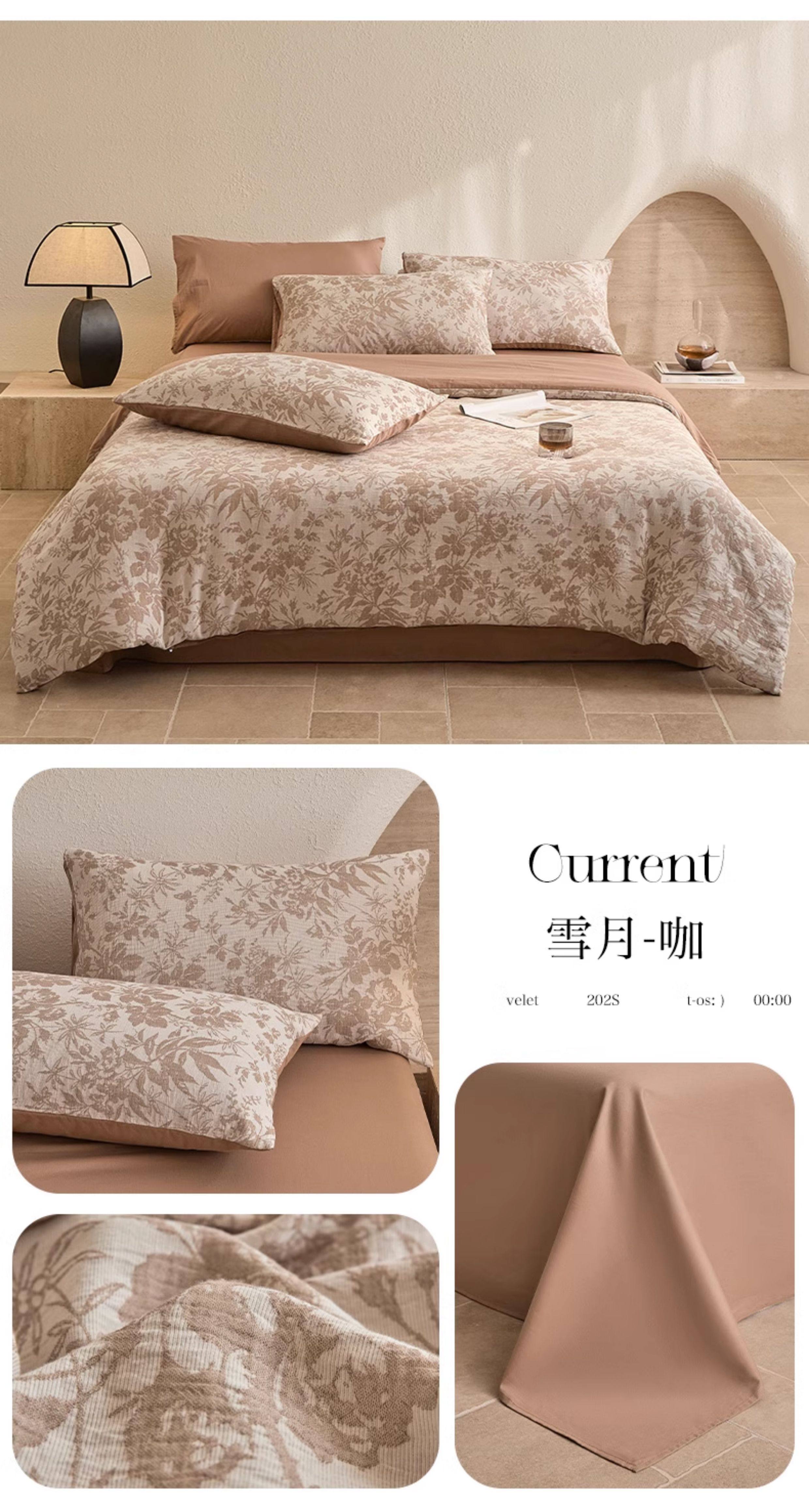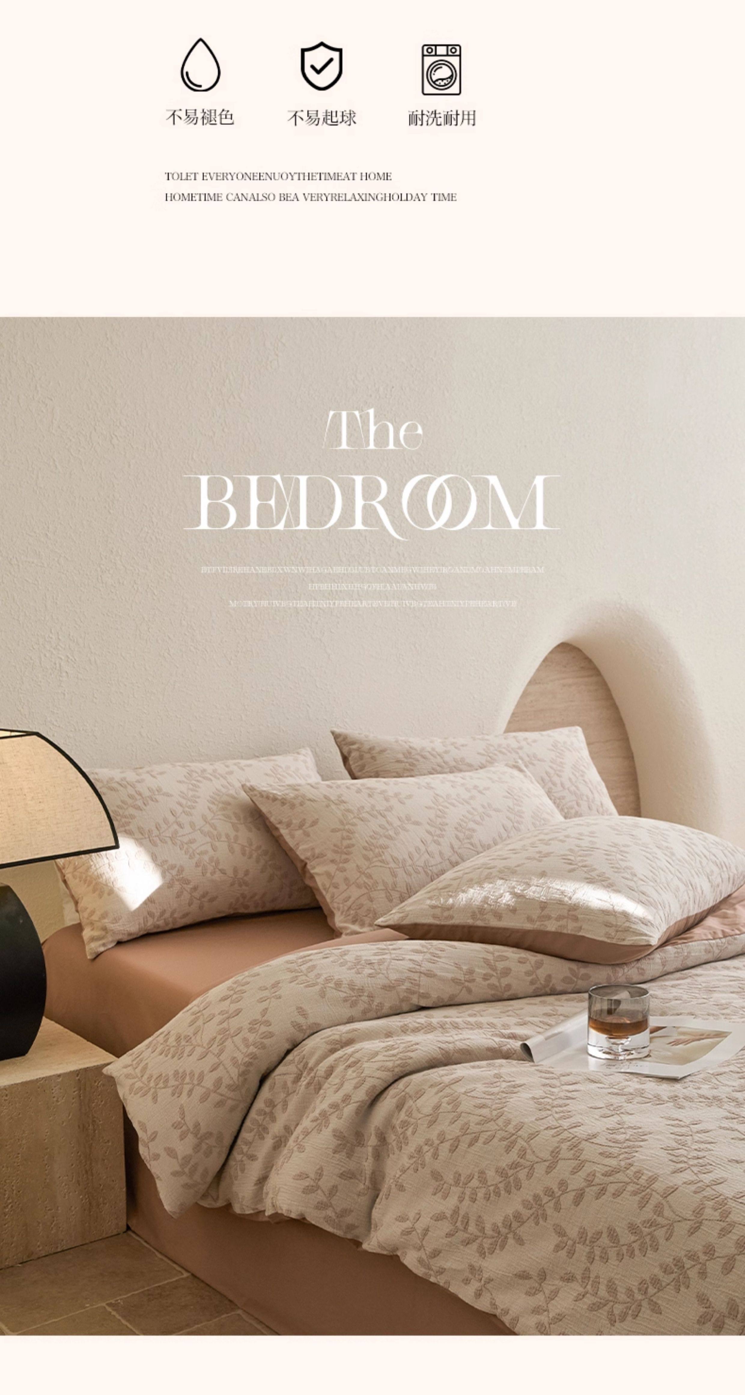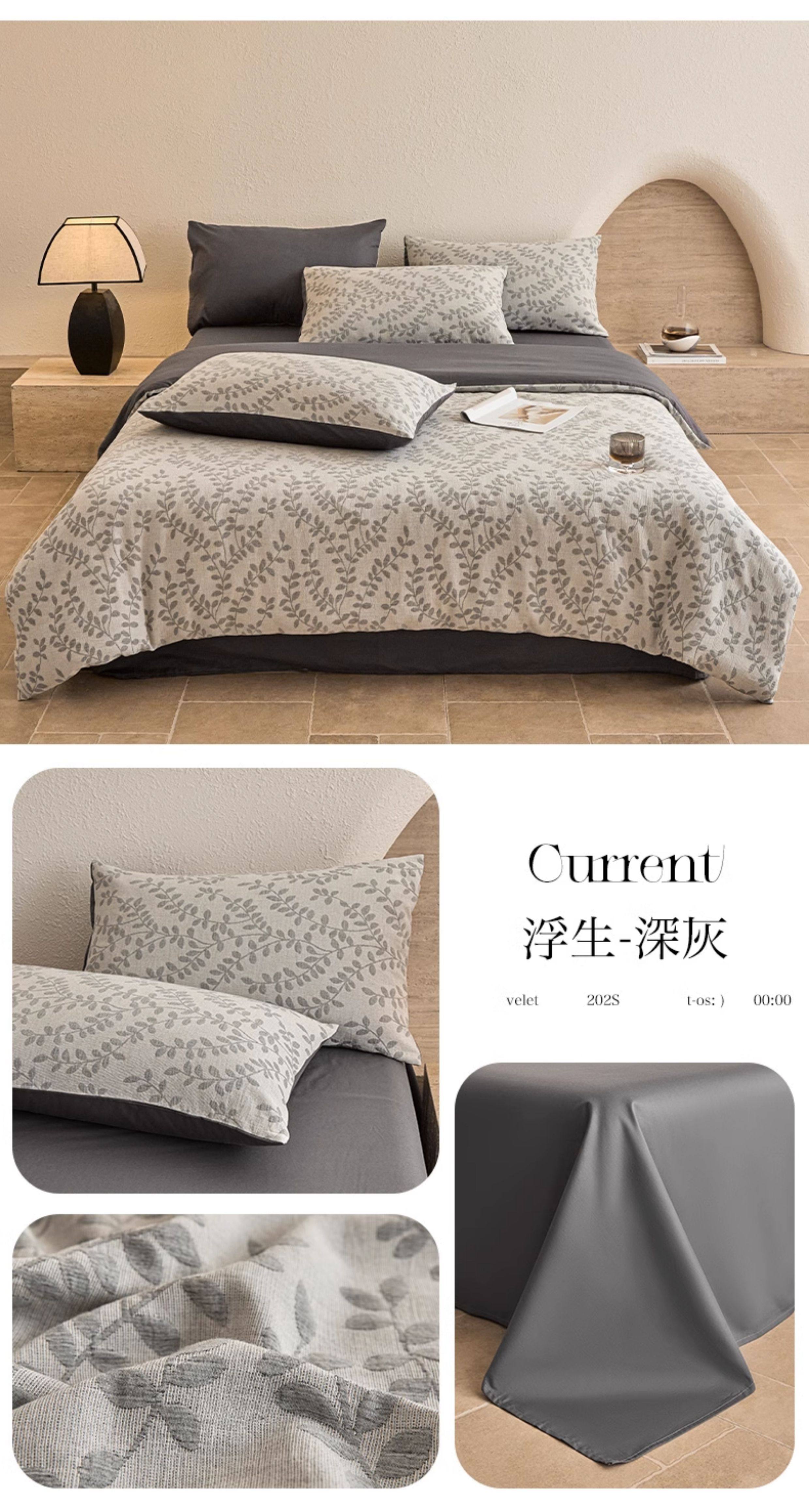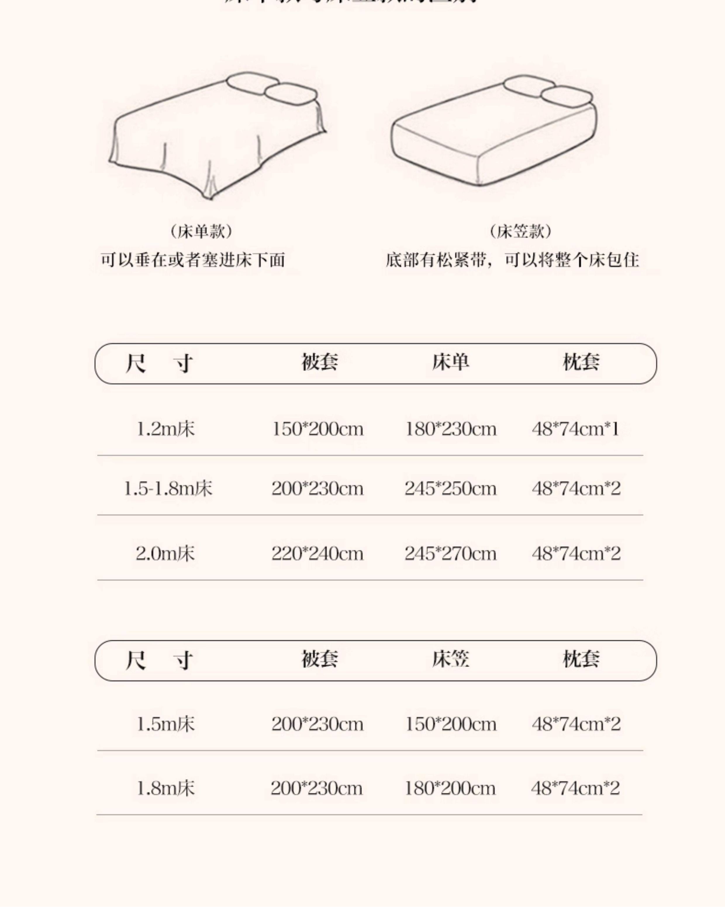 | Applicable Bed Size | 0.9m/1.2m Bed-Three-Piece Bed Sheet Set [Sheet*1+Quilt Cover*1+Pillowcase*1],1.5m/1.8m Bed - Four-Piece Bed Sheet Set [Sheet*1+Quilt Cover*1+Pillowcase*2],2.0m Bed - Four-Piece Bed Sheet Set [Sheet*1+Quilt Cover*1+Pillowcase*2],1.5m Fitted Sheet Set of Four [Fitted Sheet*1+Quilt Cover*1+Pillowcase*2],1.8m Fitted Sheet Set of Four [Fitted Sheet*1+Quilt Cover*1+Pillowcase*2] |