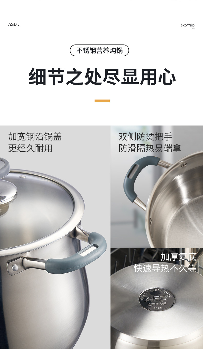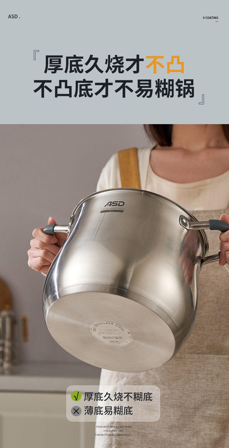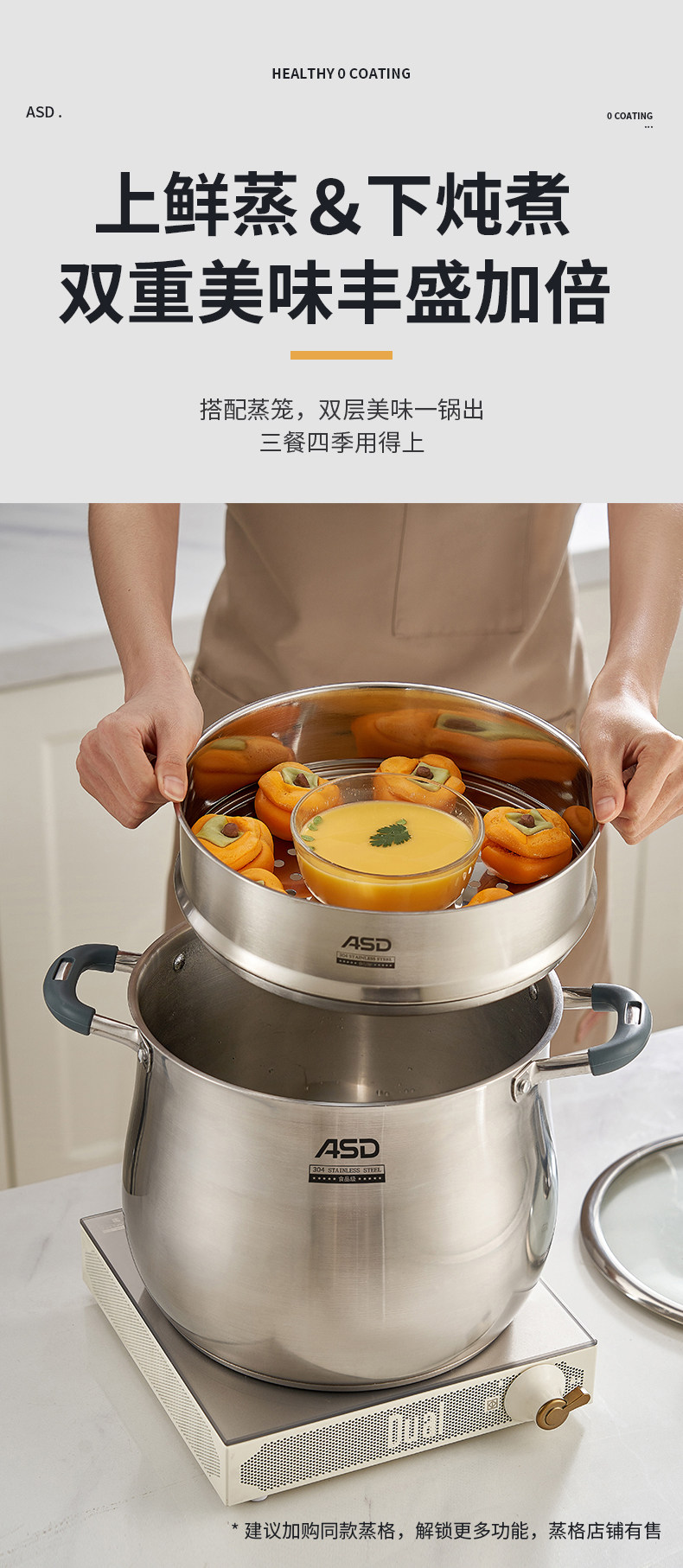 Aistar Soup Pot 304 Stainless Steel Thickened Large Capacity Household Soup Steaming and Stewing Pot Double-Handle Soup Bucket Induction Cooker
