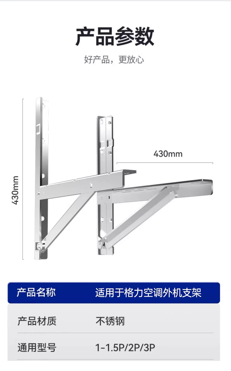| Color Classification | [Recommended][Midea Exclusive]National Standard Stainless Steel 1-1.5P Air Conditioning Bracket Thickness 1.8mm Load-Bearing 330kg Comes with a Full Set of Mounting Screws,[Recommended][Special for Grids]National Standard Stainless Steel 1-1.5P Air Conditioning Bracket Thickness 1.8mm Load-Bearing 330kg Comes with a Full Set of Mounting Screws,[Midea Exclusive]National Standard Stainless Steel 1-1.5P Air Conditioning Bracket Thickness 1.6mm Load Bearing 300kg Comes with a Full Set of Mounting Screws,[Midea Exclusive]National Standard Stainless Steel 1-1.5P Air Conditioning Bracket Thickness 2.0mm Load Capacity 350kg Comes with a Full Set of Mounting Screws,[Special for Grids]National Standard Stainless Steel 1-1.5P Air Conditioning Bracket Thickness 1.6mm Load Bearing 300kg Comes with a Full Set of Mounting Screws,[Special for Grids]National Standard Stainless Steel 1-1.5P Air Conditioning Bracket Thickness 2.0mm Load Capacity 350kg Comes with a Full Set of Mounting Screws,[Free 4 Shock Absorbers]1-1.5P Standard Version/Thickness 1.4mm, Load Capacity 280Kg/Comes with a Full Set of Mounting Screws,[Free 4 Shock Absorbers]1-1.5P Standard Version/Thickness 1.6mm Load Bearing 300Kg/Comes with a Full Set of Mounting Screws,[Free 4 Shock Absorbers]1-1.5P Enhanced Version/Thickness 1.8mm Load Bearing 330Kg/Comes with a Full Set of Mounting Screws,[Free 4 Shock Absorbers]1-1.5P Thickened Version/Thickness 2.0mm Load-Bearing 350Kg/Comes with a Full Set of Mounting Screws,[Free 4 Shock Absorbers]2P Air Conditioning Bracket/Thickness 1.6Mm/Load Bearing 330Kg/Comes with a Full Set of Mounting Screws,[Free 4 Shock Absorbers]3P Air Conditioning Bracket/Thickness 1.8mm Load-Bearing 350Kg/Comes with a Full Set of Mounting Screws,1-1.5p[Stainless Steel]Bracket Without Screws 1.3mm Thickness,1-1.5p[Stainless Steel]Bracket 1.3mm Thickness[Complete Set of Screws Included],1-1.5p[Stainless Steel]Bracket Without Screws 1.4mm Thickness,1-1.5p[Stainless Steel]Bracket 1.4mm Thickness[Complete Set of Screws Included],1-1.5p[Stainless Steel]Bracket Without Screws 1.6mm Thickness,1-1.5p[Stainless Steel]Bracket 1.6mm Thickness[Complete Set of Screws Included],1-1.5p[Stainless Steel]Bracket Extended and Thickened Version Without Screws 1.8mm Thickness,1-1.5p[Stainless Steel]Bracket Extended Version 1.8mm Thickness[Complete Set of Screws Included],1-1.5p[Stainless Steel]Bracket Extended and Thickened Version Without Screws 2.0mm Thickness,1-1.5p[Stainless Steel]Bracket Extended Version 2.0mm Thickness[Complete Set of Screws Included],2P Stainless Steel 1.6mm Thickness Without Screws[Load Bearing 330kg Without Pressure],2P Stainless Steel 1.6mm Thickness Comes with a Full Set of Screws[Load Bearing 330kg Without Pressure],3P Stainless Steel 1.8mm Thickness Without Screws[Load Bearing 350kg Without Pressure],3P Stainless Steel 1.8mm Thickness Comes with a Full Set of Screws[Load Bearing 350kg Without Pressure],[304 Material]1-1.5P Stainless Steel 1.5mm Thickness Without Screws,[304 Material]1-1.5P Stainless Steel 1.5mm Thickness Comes with a Full Set of Screws,[304 Material]2P Stainless Steel 1.6mm Thickness Without Screws,[304 Material]2P Stainless Steel 1.6mm Thickness Comes with a Full Set of Screws,[304 Material]3P Stainless Steel 1.8mm Thickness Without Screws,1-1.5p[Stainless Steel]Bracket Without Screws 1.3mm Thickness (Limited Time Special Offer),[304 Material]3P Stainless Steel 1.8mm Thickness Comes with a Full Set of Screws,1-1.5P with Crossbar Thickness 1.8mm Load Capacity 350kg, Free Mounting Screws,2P with Crossbar Thickness 1.8mm, Load Capacity 400kg, Free Mounting Screws,3P with Crossbar Thickness 1.8mm, Load Capacity 450kg, Free Mounting Screws |