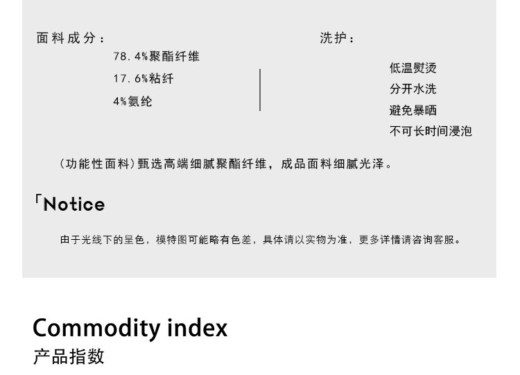 | Material Composition | Polyester 78.4% Viscose Fiber (Viscose Fiber) 17.6% Polyurethane Elastic Fiber (Spandex) 4% |