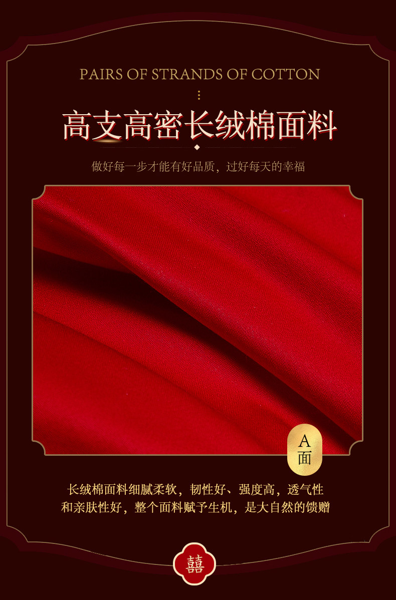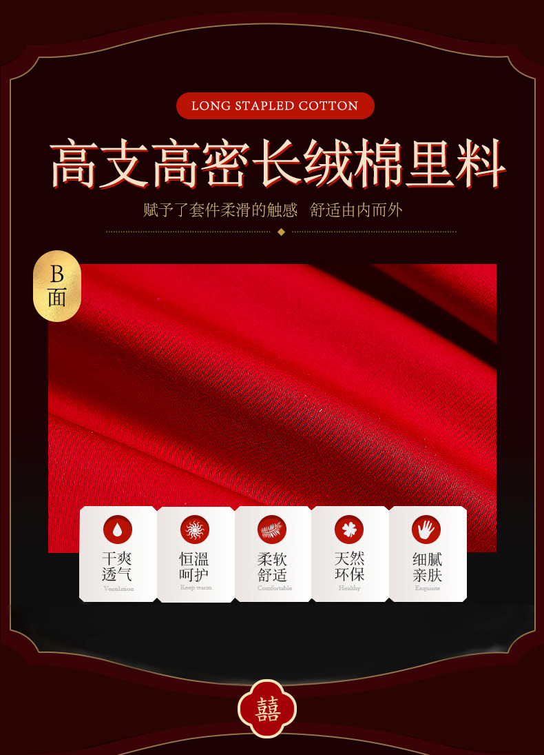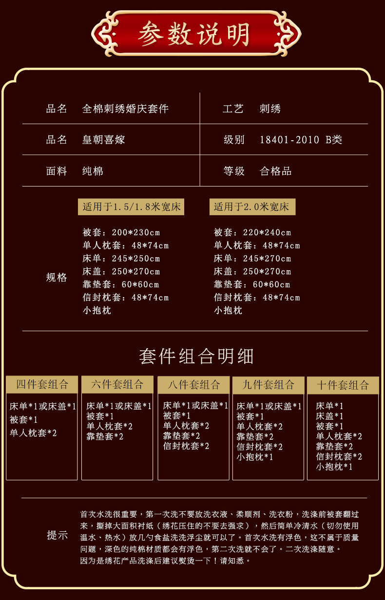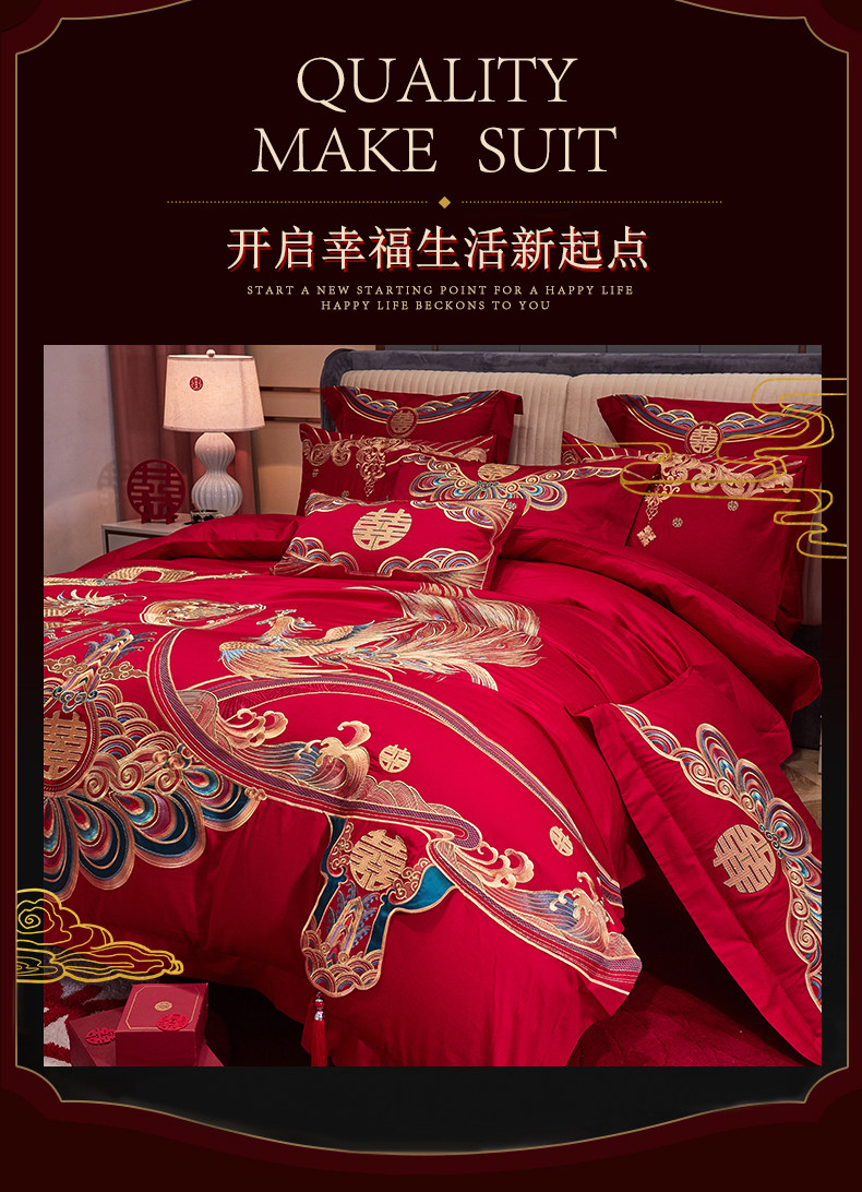 | Applicable Bed Size | 1.5/1.8m Bed Sheet Style [Four-Piece Set - Suitable for 200*230 Wedding Quilt] [Sheet + Quilt Cover + Pillowcase*2],1.8/2.0m Bed Sheet Style [Four-Piece Set - Suitable for 220*240 Wedding Quilt] [Sheet + Quilt Cover + Pillowcase*2],1.5/1.8m Bed Sheet Style [Six-Piece Set - Suitable for 200*230 Wedding Quilt] [Sheet + Quilt Cover + Pillowcase*2 + Cushion Cover*2],1.8/2.0m Bed Sheet Style [Six-Piece Set - Suitable for 220*240 Wedding Quilt] [Sheet + Quilt Cover + Pillowcase*2 + Cushion Cover*2],1.5/1.8m Bed Sheet Style [Eight-Piece Set - Suitable for 200*230 Wedding Quilt] [Bed Sheet + Quilt Cover + Pillowcase*2+Cushion Cover*2+Envelope Pillowcase*2],1.8/2.0m Bed Sheet Style [Eight-Piece Set - Suitable for 220*240 Wedding Quilt] [Sheet + Quilt Cover + Pillowcase*2 + Cushion Cover*2 + Envelope Pillowcase*2],1.5/1.8m Bed Sheet Style [Nine-Piece Set - Suitable for 200*230 Wedding Quilt] [Bed Sheet + Quilt Cover + Pillowcase*2+Cushion Cover*2+Envelope Pillowcase*2+Small Pillow*1],1.8/2.0m Bed Sheet Style [Nine-Piece Set - Suitable for 220*240 Wedding Quilt] [Bed Sheet + Quilt Cover + Pillowcase*2+Cushion Cover*2+Envelope Pillowcase*2+Small Pillow*1],1.5/1.8m Bed Cover [Four-Piece Set - Suitable for 200*230 Wedding Quilt] [Bed Cover + Quilt Cover + Pillowcase*2],1.8/2.0m Bed Cover [Four-Piece Set - Suitable for 220*240 Wedding Quilt] [Bed Cover + Quilt Cover + Pillowcase*2],1.5/1.8m Bed Cover [Six-Piece Set - Suitable for 200*230 Wedding Quilt] [Bed Cover + Quilt Cover + Pillowcase*2 + Cushion Cover*2],1.8/2.0m Bed Cover [Six-Piece Set - Suitable for 220*240 Wedding Quilt] [Bed Cover + Quilt Cover + Pillowcase*2 + Cushion Cover*2],1.5/1.8m Bed Cover [Eight-Piece Set - Suitable for 200*230 Wedding Quilt] [Bed Cover + Quilt Cover + Pillowcase*2+Cushion Cover*2+Envelope Pillowcase*2],1.8/2.0m Bed Cover [Eight-Piece Set - Suitable for 220*240 Wedding Quilt] [Bed Cover + Quilt Cover + Pillowcase*2 + Cushion Cover*2 + Envelope Pillowcase*2],1.5/1.8m Bed Cover [Nine-Piece Set - Suitable for 200*230 Wedding Quilt] [Bed Cover + Quilt Cover + Pillowcase*2 + Cushion Cover*2 + Envelope Pillowcase*2 + Small Pillow*1],1.8/2.0m Bed Cover [Nine-Piece Set - Suitable for 220*240 Wedding Quilt] [Bed Cover + Quilt Cover + Pillowcase*2+Cushion Cover*2+Envelope Pillowcase*2+Small Pillow*1],1.5/1.8m Bed [Ten-Piece Set - Suitable for 200*230 Wedding Quilt] [Bed Sheets+Bed Cover+Quilt Cover+Pillowcase*2+Cushion Cover*2+Envelope Pillowcase*2+Small Pillow*1],1.8/2.0m Bed [Ten-Piece Set - Suitable for 220*240 Wedding Quilt] [Sheet + Bed Cover + Quilt Cover + Pillowcase*2 + Cushion Cover*2 + Envelope Pillowcase*2 + Small Pillow*1] |