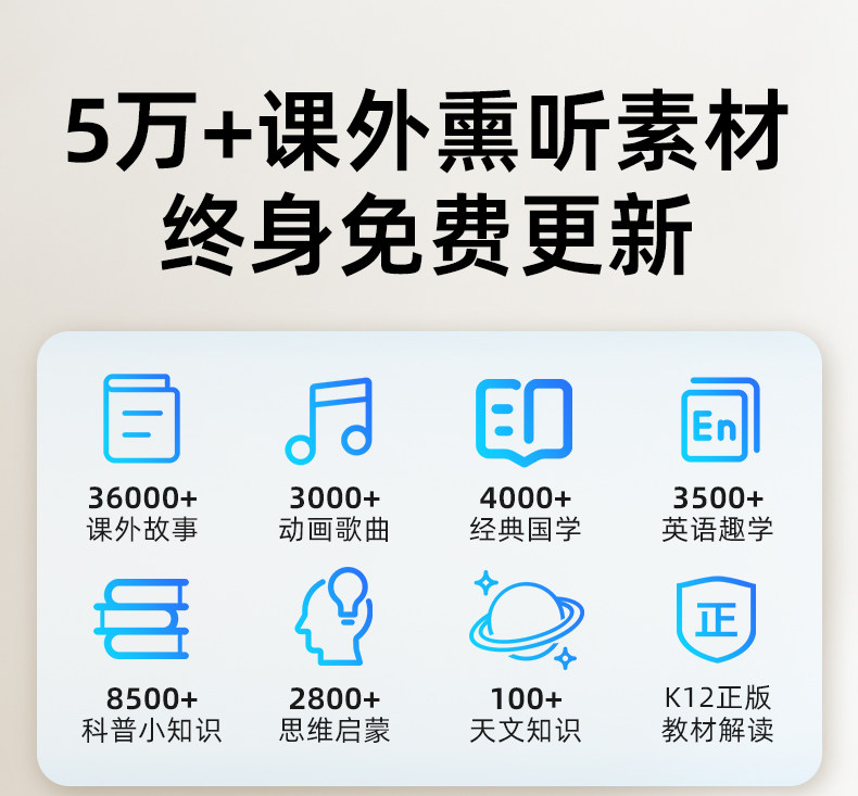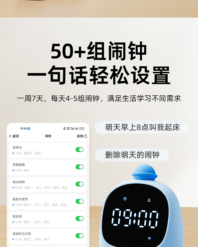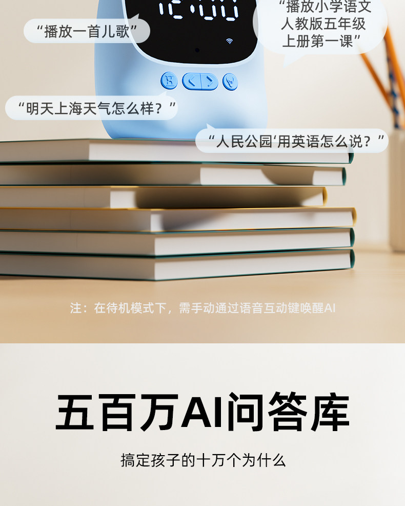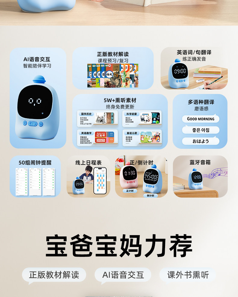 | Color Classification | [Smart Ai Large Model Alarm Clock 2.0]Deep Thinking + Voice Interaction + Textbook Interpretation + Material Exposure - Sky Blue,[Smart Ai Large Model Alarm Clock 2.0]Deep Thinking + Voice Interaction + Textbook Interpretation + Immersive Listening - Dreamy Pink,[Smart Ai Large Model Alarm Clock 2.0]Deep Thinking + Voice Interaction + Textbook Interpretation + Immersive Listening - Almond Yellow,[Smart Ai Voice Alarm Clock 1.0]Voice Interaction + Authentic Textbook Interpretation + Supplementary Materials for Immersion - Sky Blue,[Smart Ai Voice Alarm Clock 1.0]Voice Interaction + Authentic Textbook Interpretation + Supplementary Materials for Immersion - Dreamy Pink,[Smart Ai Large Model Alarm Clock 2.0+ Self-Discipline Punch-In Device](Free 48 Punch Cards)-Sky Blue,[Smart Ai Large Model Alarm Clock 2.0+ Self-Discipline Punch-In Set](Free 48 Punch Cards)-Dream Pink,[Smart Ai Voice Alarm Clock 1.0+ Self-Discipline Punch-In Set]-Sky Blue,[Smart Ai Voice Alarm Clock 1.0+ Self-Discipline Punch-In Set]-Dream Powder,Ai Voice Dialogue,English Sparring,Comprehensive Textbook Interpretation,5 Million Question and Answer Database |