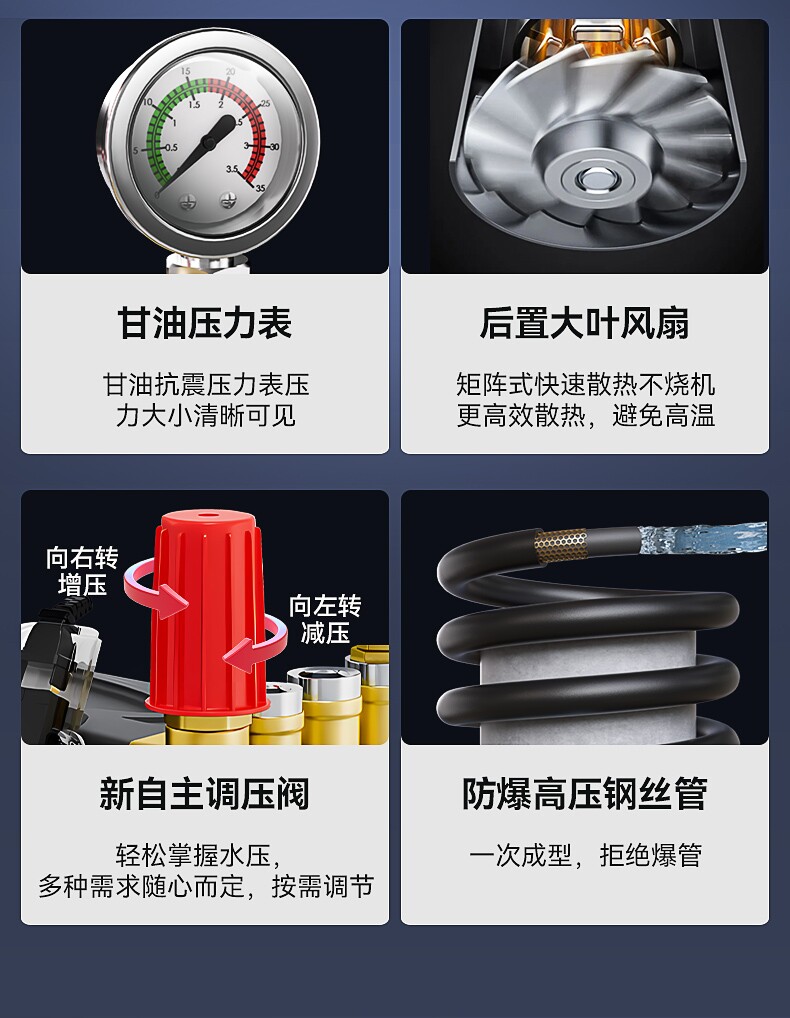 | Color Classification | 220V2.6Kw [190kg Pressure] 10m Tube Small Flow Household Model,220V2.8Kw [200kg Pressure] 10m Tube Small-Scale Breeding Farm,220V2.8Kw [200kg Pressure] 20m Tube [Upgraded Hose Reel],220V3.0Kw [210kg Pressure] 15m Household Cost Performance,220V3.0Kw [210kg Pressure] 20m Flash Sale with Leakage Protection,220V3.3Kw [220kg Pressure] 15m Copper Motor Copper Pump,220V3.3Kw [220kg Pressure] 20m Shutdown with Gun,220V3.5Kw [230kg Pressure] 15m Small-Scale Breeding Farm,220V3.5Kw [230kg Pressure] 20m Small Breeding High Configuration,220V3.7Kw [240kg Pressure] 15m Small-Scale Breeding Farm,220V3.7Kw [240kg Pressure] 20m Small-Scale Breeding Farm,220V2.7Kw [250kg Pressure] 15m Energy Saving,220V2.7Kw [250kg Pressure] 20m Car Wash Shop Breeding Farm,220V2.7Kw [250kg Pressure] 20m High Configuration [Upgraded Hose Reel],220V4.0Kw [260kg Pressure] 15m Pure Copper Four-Stage Motor,220V4.0Kw [260kg Pressure] 20m Medium-Sized Car Wash Shop,220V4.0Kw [260kg Pressure] 20m High Configuration [Upgraded Hose Reel],220V4.5Kw [270kg Pressure] 15m Medium-Sized Breeding Farm,220V4.5Kw [270kg Pressure] 20m Medium-Sized Breeding Farm,220V4.5Kw [270kg Pressure] 20m High Configuration [Upgraded Hose Reel],220V5.0Kw [280kg Pressure] 15m Large-Scale Breeding Farm,220V5.0Kw [280kg Pressure] 20m Professional Car Wash Shop,220V5.0Kw [280kg Pressure] 20m High Configuration [Upgraded Hose Reel],220V5.3Kw [300kg Pressure] 15m Large Car Wash,220V5.3Kw [300kg Pressure] 20m Community Property,220V5.3Kw [300kg Pressure] 20m High Configuration [Upgraded Hose Reel],220V5.5Kw [320kg Pressure] 15m Cleaning Large Trucks,220V5.5Kw [320kg Pressure] 20m Multi-Station Car Wash Shop,220V5.5Kw [320kg Pressure] 20m High Configuration [Upgraded Hose Reel],220V6.0Kw [350kg Pressure] 15m Invincible Cleaning Model,220V6.0Kw [350kg Pressure] 20m Single Phase Invincible Model,220V6.0Kw [350kg Pressure] 20m High Configuration [Upgraded Hose Reel],【380V】3.0Kw/ 15m / 240kg Pressure Three-Phase Movable Model,[380V] 3.0Kw/ 20m / 240kg Pressure [Upgraded Hose Reel],【380V】4.0Kw/ 15m / 280kg Pressure Medium-Sized Car Wash Shop,[380V] 4.0Kw/ 20m / 280kg Pressure [Upgraded Hose Reel],【380V】5.0Kw/ 15m / 300kg Pressure Professional Car Wash Shop,[380V] 5.0Kw/ 20m / 300kg Pressure [Upgraded Hose Reel],【380V】5.5Kw/ 15m / 320kg Pressure Large Car Wash Shop Breeding,[380V] 5.5Kw/ 20m / 320kg Pressure [Upgraded Hose Reel],【380V】7.5Kw/ 20m / 360kg Pressure Large Factory Cleaning,【380V】10Kw/ 20m / 370kg Pressure Engineering Vehicle Cleaning Equipment,【380V】11Kw/ 20m / 380kg Pressure Large Trailer Cleaning,New 220V 4.0Kw [220kg Pressure] 20m Tube Low Energy Consumption Copper Motor,New 220V2.5Kw [260kg Pressure] 20m Pure Copper Four-Stage Motor,New 220V3.7Kw [270kg Pressure] 20m Medium-Sized Car Wash Shop,New 220V4.0Kw [280kg Pressure] 15m [Medium-Sized Breeding Farm],New 220V5.0Kw [300kg Pressure] 15m [Professional Car Wash Shop],New 220V5.5Kw [320kg Pressure] 15m [Large-Scale Breeding Farm],New 380V4.0Kw [280kg Pressure] 15m [Medium-Sized Breeding Farm],New 380V5.0Kw [300kg Pressure] 15m [Professional Car Wash Shop],New 380V5.5Kw [320kg Pressure] 15m [Large-Scale Breeding Farm] |