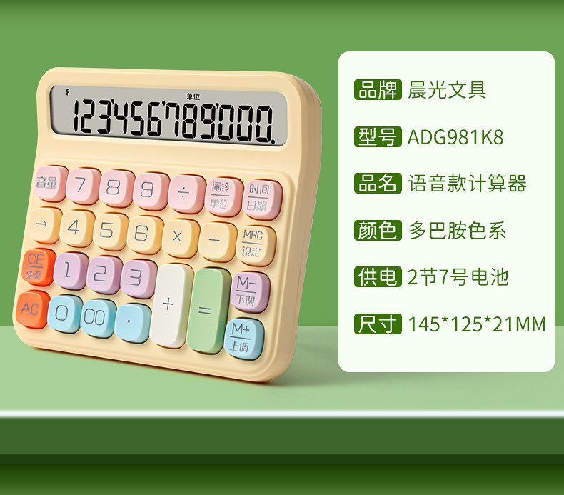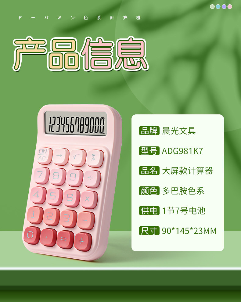 | Color Classification | [Magic Powder]Dopamine| Portable Calculator/Free Battery,[Forest Green]Dopamine| Portable Calculator/Free Battery,[Sea Blue]Dopamine| Portable Calculator/Free Battery,[Crystal Purple]Dopamine| Portable Calculator/Free Battery,[Feather White]Dopamine| Voice Calculator/Free Battery,[Gilt]Dopamine| Voice Calculator/Free Battery,[Sea Blue]Dopamine| Voice Calculator/Free Battery,[Crystal Purple]Dopamine| Voice Calculator/Free Battery |