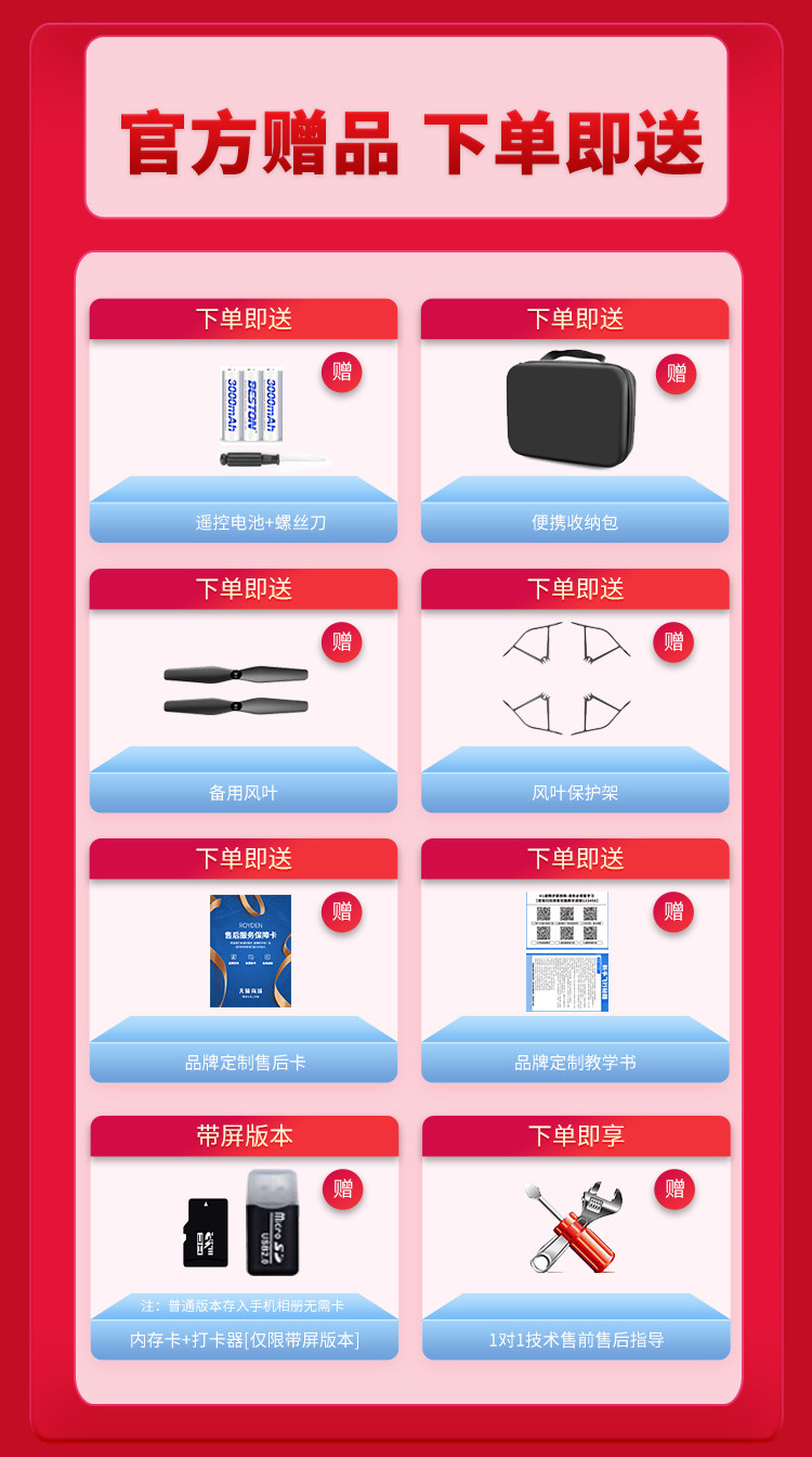 | Package Type | Official Standard Configuration,1 Battery [Comes with Storage Bag + Vulnerable Accessories + Charging Cable],Free 1 Battery, 3 Batteries in Total [Free Storage Bag + Vulnerable Accessories + Multiple Charging Cables],Free 1 Battery, 4 Batteries in Total [Free Storage Bag + Vulnerable Accessories + Multiple Charging Cables],Free 1 Battery, 5 Batteries in Total [Free Storage Bag + Vulnerable Accessories + Multiple Charging Cables] |