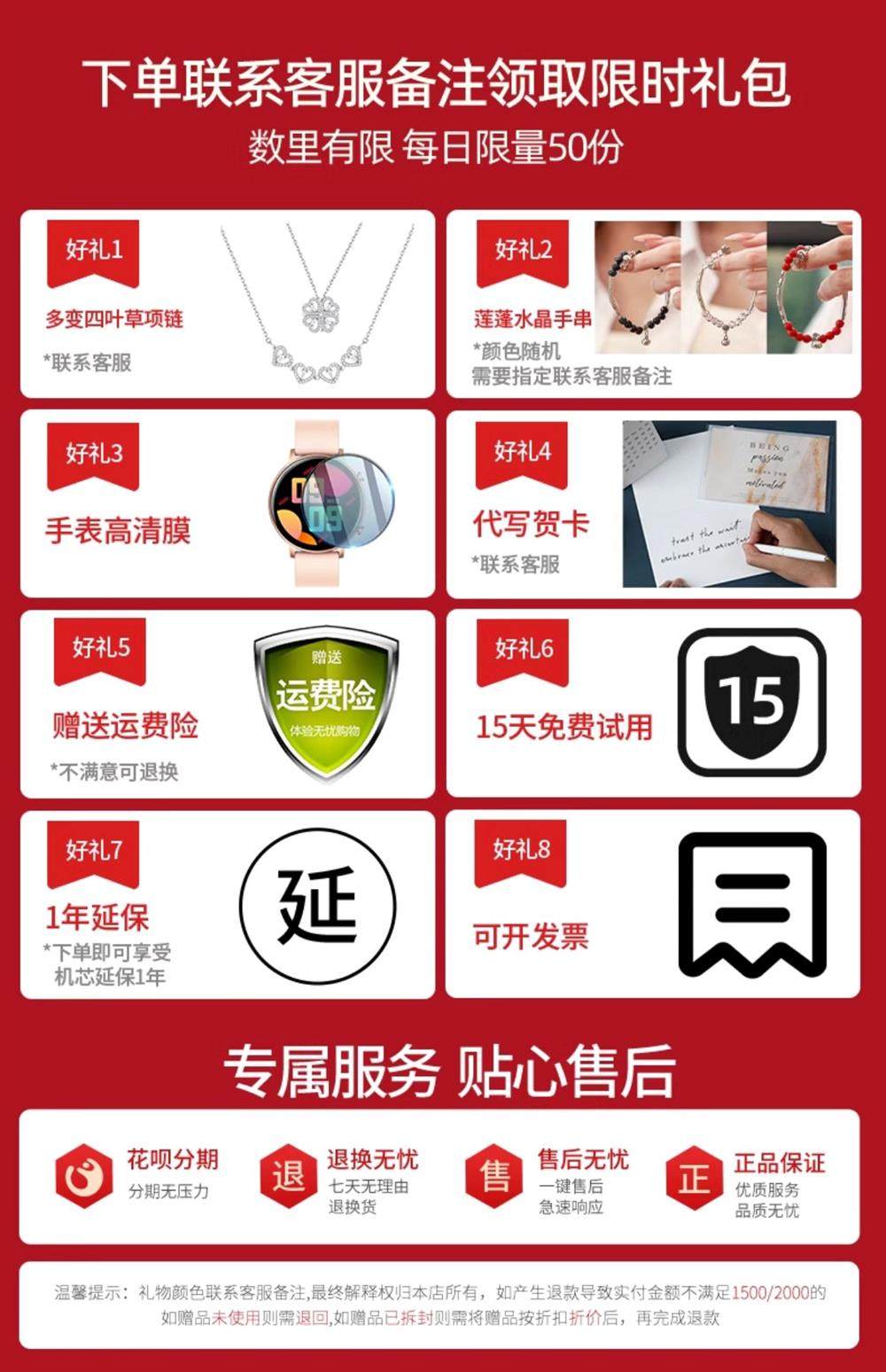 | Color Classification | Same Style as Main Picture[24H Health Monitoring· Payment· Hd Call· Voice Assistant· Message View· DIY Watch Face, Etc],Heart's Desire: Limited Edition Gift Box[Irresistible Limited Edition Gift Box: Watch + Beloved Perfume + Wheat Leaf Bracelet + Greeting Card & More],Mainstream Black[24H Health Monitoring· Payment· Hd Call· Voice Assistant· Message View· DIY Watch Face, Etc],Vintage Black Gold[24H Health Monitoring· Payment· Hd Call· Voice Assistant· Message View· DIY Watch Face, Etc],Original Cream Puppy[24H Health Monitoring· Payment· Hd Call· Voice Assistant· Message View· DIY Watch Face, Etc],Champagne Apricot[24H Health Monitoring· Payment· Hd Call· Voice Assistant· Message View· DIY Watch Face, Etc],Lucky Red[High-Definition Calls, Payments, Exercise Monitoring, Etc],Simple White[24H Health Monitoring· Payment· Hd Call· Voice Assistant· Message View· DIY Watch Face, Etc],Haze Powder[24H Health Monitoring· Payment· Hd Call· Voice Assistant· Message View· DIY Watch Face, Etc],Rose Gold Mesh Steel Band[24H Health Monitoring· Payment· Hd Call· Voice Assistant· Message View· DIY Watch Face, Etc],Black Wire Mesh Steel Strapping[24H Health Monitoring·Hd Call·Voice Assistant·Message View·Diy Watch Face, Etc],ins Grids[24H Health Monitoring· Payment· Hd Call· Voice Assistant· Message View· DIY Watch Face, Etc],Lychee Pattern Butterfly Buckle·White Leather[24H Health Monitoring· Payment· Hd Call· Voice Assistant· Message View· DIY Watch Face, Etc],Lychee Pattern Butterfly Buckle·Black Leather[24H Health Monitoring· Payment· Hd Call· Voice Assistant· Message View· DIY Watch Face, Etc],Lychee Pattern Butterfly Buckle·Grey Leather[24H Health Monitoring· Payment· Hd Call· Voice Assistant· Message View· DIY Watch Face, Etc],Four-Leaf Clover·Rose Gold White[24H Health Monitoring· Payment· Hd Call· Voice Assistant· Message View· DIY Watch Face, Etc],Four-Leaf Clover·Rose Gold Black[24H Health Monitoring· Payment· Hd Call· Voice Assistant· Message View· DIY Watch Face, Etc],Four-Leaf Clover·Silver[24H Health Monitoring· Payment· Hd Call· Voice Assistant· Message View· DIY Watch Face, Etc],Three Fat Whites[24H Health Monitoring· Payment· Hd Call· Voice Assistant· Message View· DIY Watch Face, Etc],Pink Limited Gift Box[Watch + Pink Limited Edition Gift Box + Necklace + Spare Strap + Dried Flower Greeting Card, Etc],Full of "Orange" Meaning[Watch, Limited Gift Box + Perfume + Spare Strap, Etc],Instantly Fall in Love: Sini Blue Limited Edition[Watch + Spare Strap + Hd Film + Real Flower Greeting Card],Velvet & Peach Blossom Mirror Gift Set[Watch + Velvet Mirror Gift Box + Spare Strap, Etc],Love·Say I Love You·Limited Sale,Gift Set to Show Love - Limited Edition,I-Love-U-Rabbit-Limited Gift Box,Alice Box Set·Limited Sale,520·Love Limited[Love Gift Box + Watch + Dried Flower Greeting Card, Etc],Beloved Envelope Gift Box[Bluetooth Headset + Limited Gift Box and Other Watch Colors Can Be Changed],Hot Love·520 Limited Gift Box[Red Heart Gift Box + Watch + Wheat Leaf Bracelet + Passionate Love Heart Perfume + Greeting Card, Etc],Rose·Limited Gift Box[Watch + Little Swan Necklace + Classical Bracelet],520·Heartbeat Limited Gift Box[Can Write Greeting Cards~],Confession Balloon Gift Box[Draw Rabbit + Gilt Perfume + Spare Watch Strap + Everlasting Bouquet],Flower and Bird Collection·Spring and Summer Limited Edition[Dried Flower Bouquets, Perfumes, Watches, Flower and Bird Gift Boxes, Etc],Always by Your Side, with Sounds That Move Your Heart. Limited Edition Gift Box - Pink[Watch*·Gift Box*·Headphones*·Watch Strap*·Hd Film*·Greeting Card, Etc],Always by Your Side, with Sounds That Move Your Heart. Limited Edition Gift Box - Black[Watch*·Gift Box*·Headphones*·Watch Strap*·Hd Film*·Greeting Card, Etc],Single Watch·Qixi Limited Edition·Double Love Gift Box[Watch + Perfume + Towel Bear + Limited Gift Box],Heartthrob & Darling: Limited Edition Couple Watch Gift Set[Heartthrob's Exclusive Gift Box: Watch + Signature Perfume + Greeting Card & More],Matching Watches - Qixi Festival Limited Edition - Double-Door Heart Gift Box[Watch + Perfume + Towel Bear + Limited Gift Box] |
