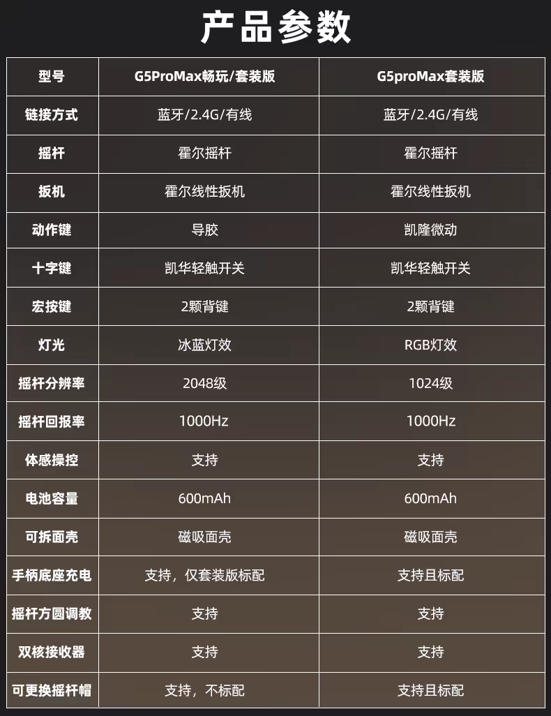 | Color Classification | G5Prov2 Explore Black/Three-Mode (Hot-Swappable Joystick + Optical Trigger),G5Prov2 Explorer White / Tri-Mode (Hot-Swap Joystick + Optical Triggers),G5Prov2 Collector's Edition Set / Tri-Mode (Rgb Charging Dock + Hot-Swappable Hall Effect Joystick),G5Pro Explore Black/Three Modes (Hall Trigger + Hall Rocker),G5Pro Explore White/Three-Mode (Hall Trigger + Hall Joystick),G5Promax White/Three-Mode/Rgb Charging Base,G5Promax Powder/Three-Mode/Rgb Charging Base,G5Promax Play Edition/Gray/Three Modes,G5Promax Play Edition/White/Three Modes,G5Promax Play Edition Set/Gray/Three-Mode/Charging Base,G5Promax Play Edition Set/White/Three-Mode/Charging Base |