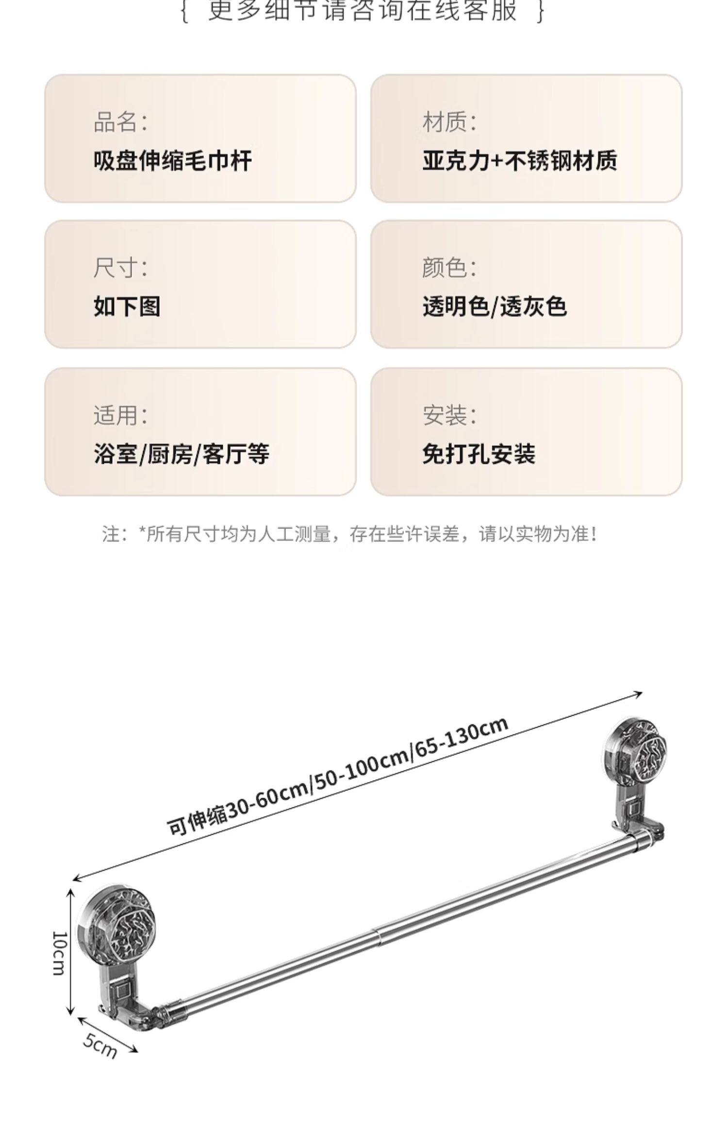 | Color Classification | Note: "Suction Cups Can Be Used on Walls." Click to View Instructionsâ€Recommended for Use on Tile Surfacesâ€,Installation Instructions,Transparent Black-Suction Cup Towel Bar[30CM],Transparent Black-Suction Cup Towel Bar[50CM],Transparent Black-Suction Cup Towel Bar[65CM],Transparent Black-Suction Cup Towel Bar[Retractable 30-60cm],Transparent Black-Suction Cup Towel Bar[Retractable 50-100cm],Transparent Black-Suction Cup Towel Bar[Retractable 65-130cm],Transparent Color-Suction Cup Towel Bar[30CM],Transparent Color-Suction Cup Towel Bar[50CM],Transparent Color-Suction Cup Towel Bar[65CM],Transparent Color-Suction Cup Towel Bar[Retractable 30-60cm],Transparent Color-Suction Cup Towel Bar[Retractable 50-100cm],Transparent Color-Suction Cup Towel Bar[Retractable 65-130cm] |
