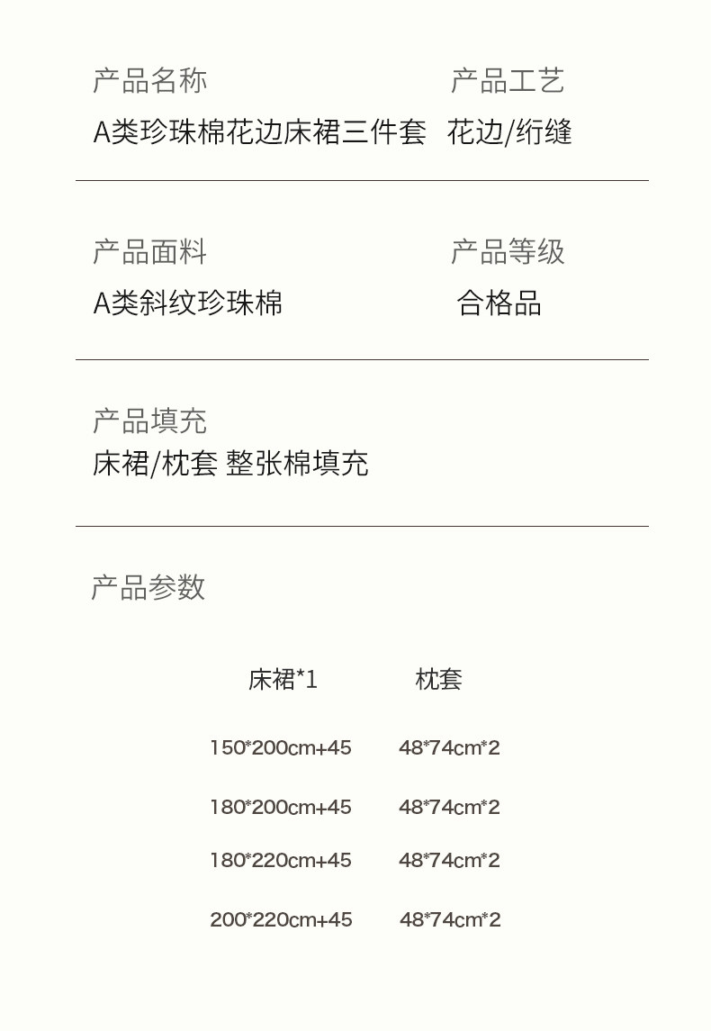 | Bed Sheets/Fitted Sheets Size | 150X200Cm Quilted Bed Skirt Single Piece,180X200Cm Quilted Bed Skirt Single Piece,180X220Cm Quilted Bed Skirt Single Piece,200X220Cm Quilted Bed Skirt Single Piece,150X200Cm Quilted Bed Skirt + 2 Pillowcases,180X200Cm Quilted Bed Skirt + 2 Pillowcases,180X220Cm Quilted Bed Skirt + 2 Pillowcases,200X220Cm Quilted Bed Skirt + 2 Pillowcases |