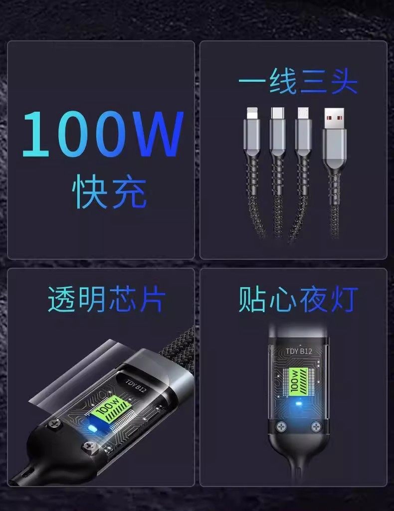 100W Fast Charging Data Cable, Mobile Phone Charger Cable, Car Charger Cable, Three-In-One Multi-Head New Model with Light, Universal Super Flash Charging, Suitable for Apple iPhone and Android