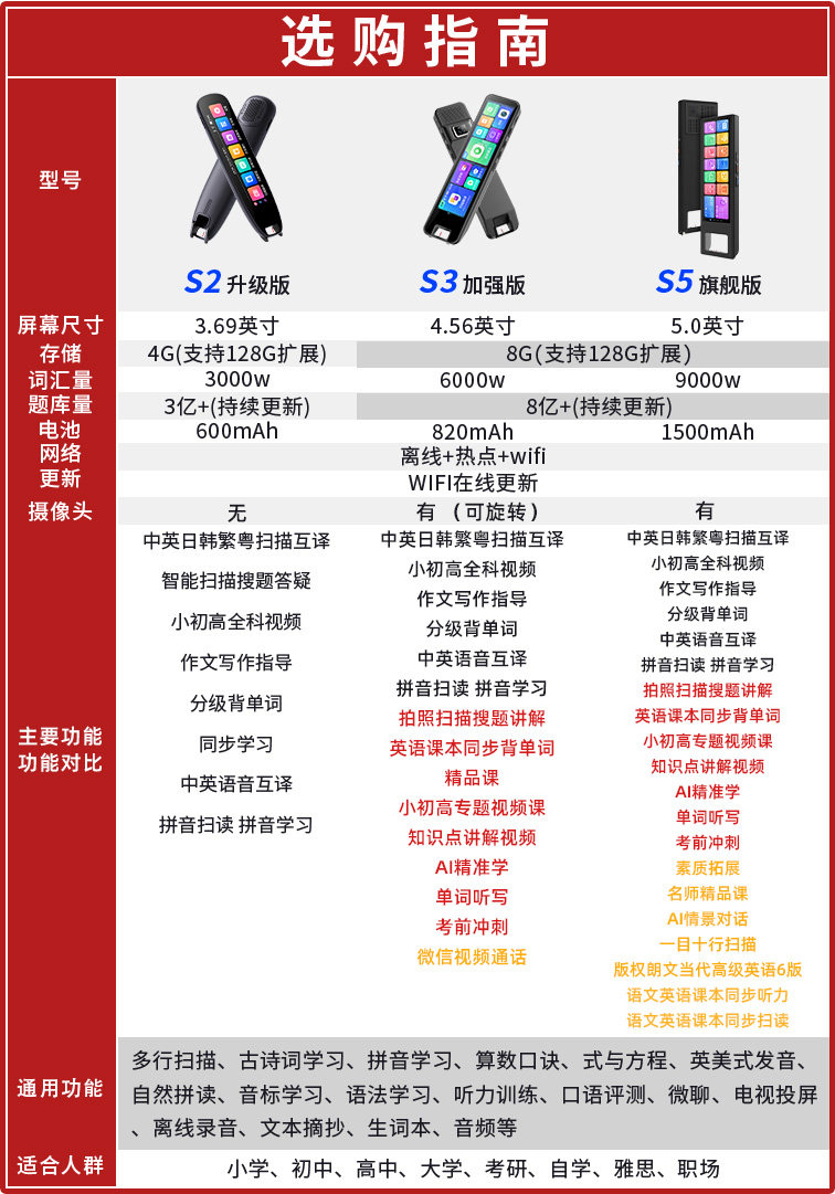 | Color Classification | [S2â 4GăScan & Translate + Listen & Learn Vocabulary + Scan Questions + Interactive Practice + Unlimited Books + Standard Pronunciation,[S2â 64GăScan & Translate + Listen & Learn Vocabulary + Scan Questions + Interactive Practice + Unlimited Books + Standard Pronunciation,[S2â 128GăScan & Translate + Listen & Learn Vocabulary + Scan Questions + Interactive Practice + Unlimited Books + Standard Pronunciation,ăS3 Blackâ 8GăVideo Call + Scan Translation + Ai Precision Learning + Smart Q&A + Synchronized Video + Comprehensive Recitation,ăS3 Whiteâ 8GăVideo Call + Scan Translation + Ai Precision Learning + Smart Q&A + Synchronized Video + Comprehensive Recitation,ăS3 Blackâ 128GăVideo Call + Scan Translation + Ai Accurate Learning + Intelligent Question Answering + Synchronous Video + Full Subject Recitation,ăS3 Whiteâ 128GăVideo Call + Scan Translation + Ai Accurate Learning + Intelligent Question Answering + Synchronous Video + Full Subject Recitation,[S5â 8GăScan Dictionary + Smart Answering + Synchronized Classroom + Specialized Videos + Synchronized/Progressive Vocabulary Learning,[S5â 128GăScan Dictionary + Smart Answer + Synchronized Classroom + Special Topic Videos + Synchronized/Graded Vocabulary Memorization |