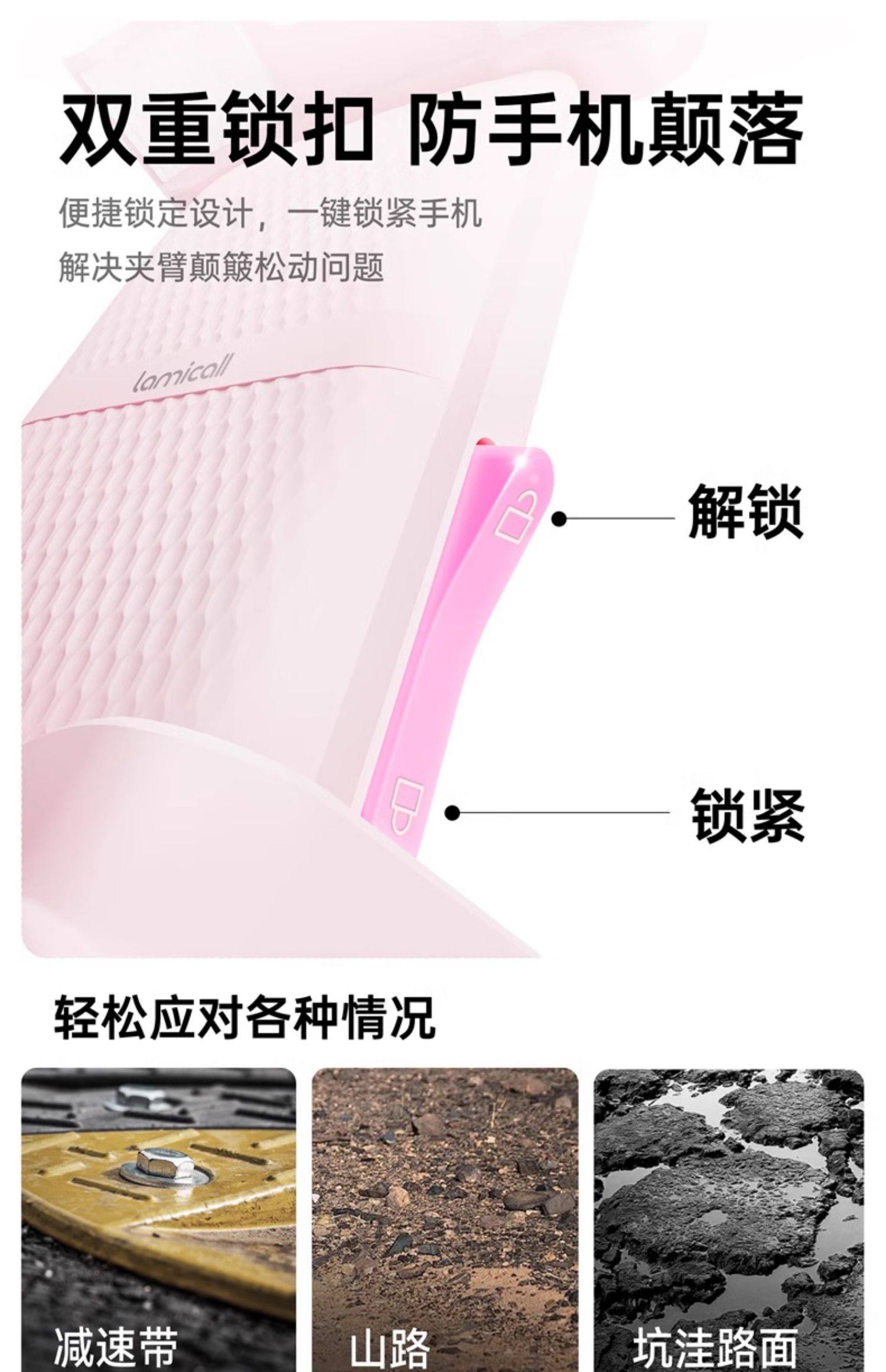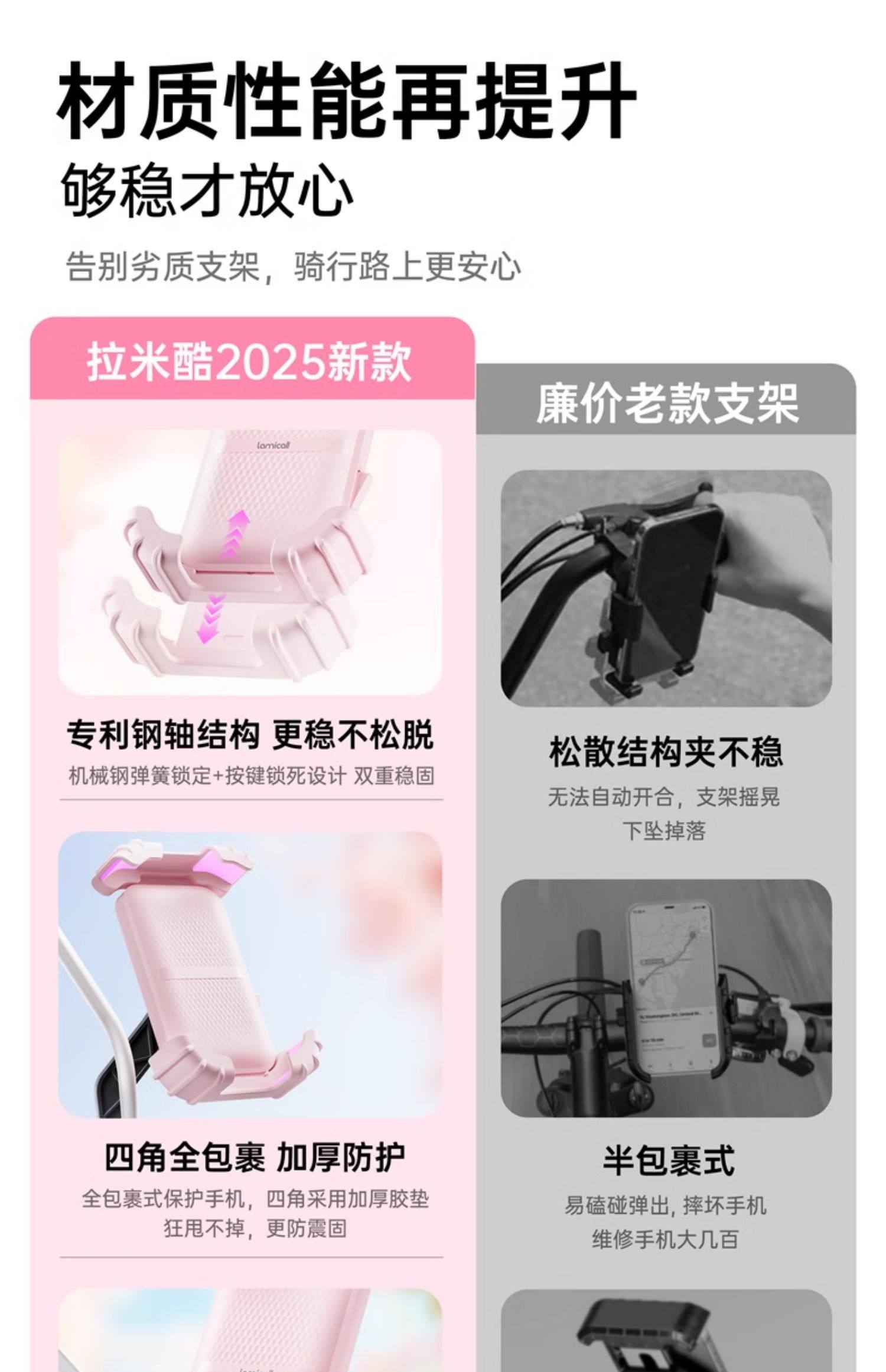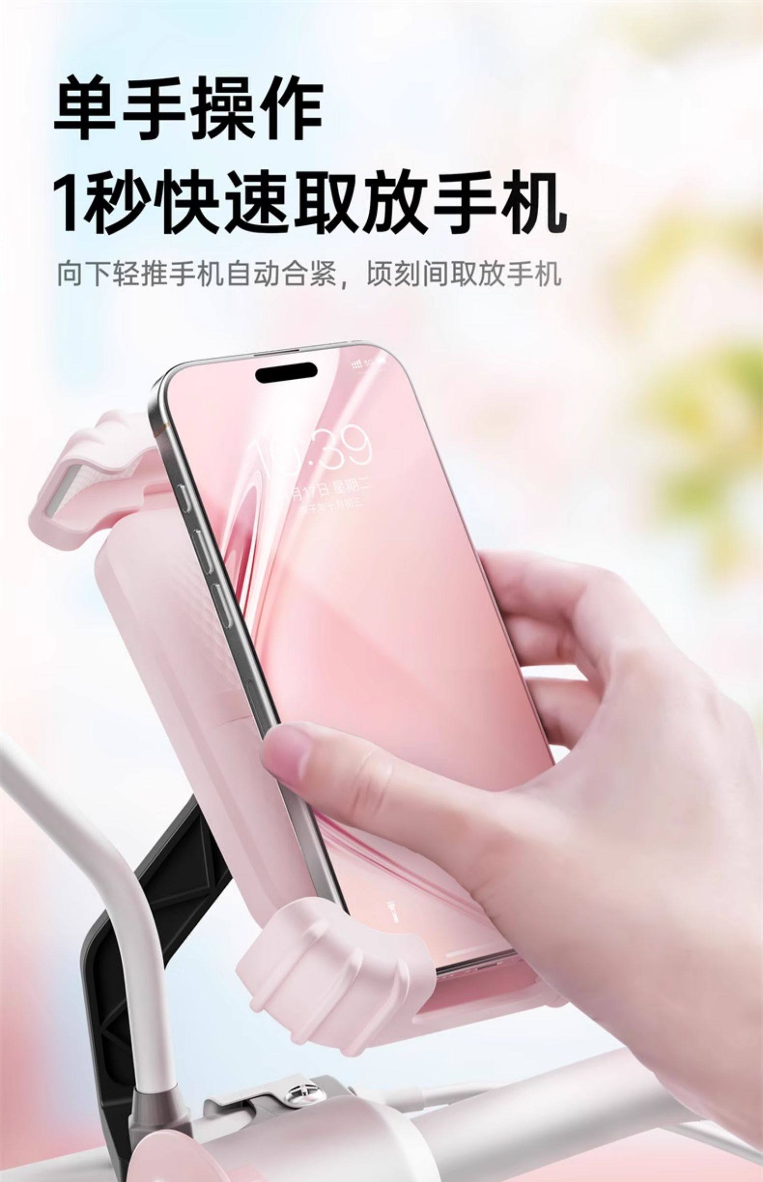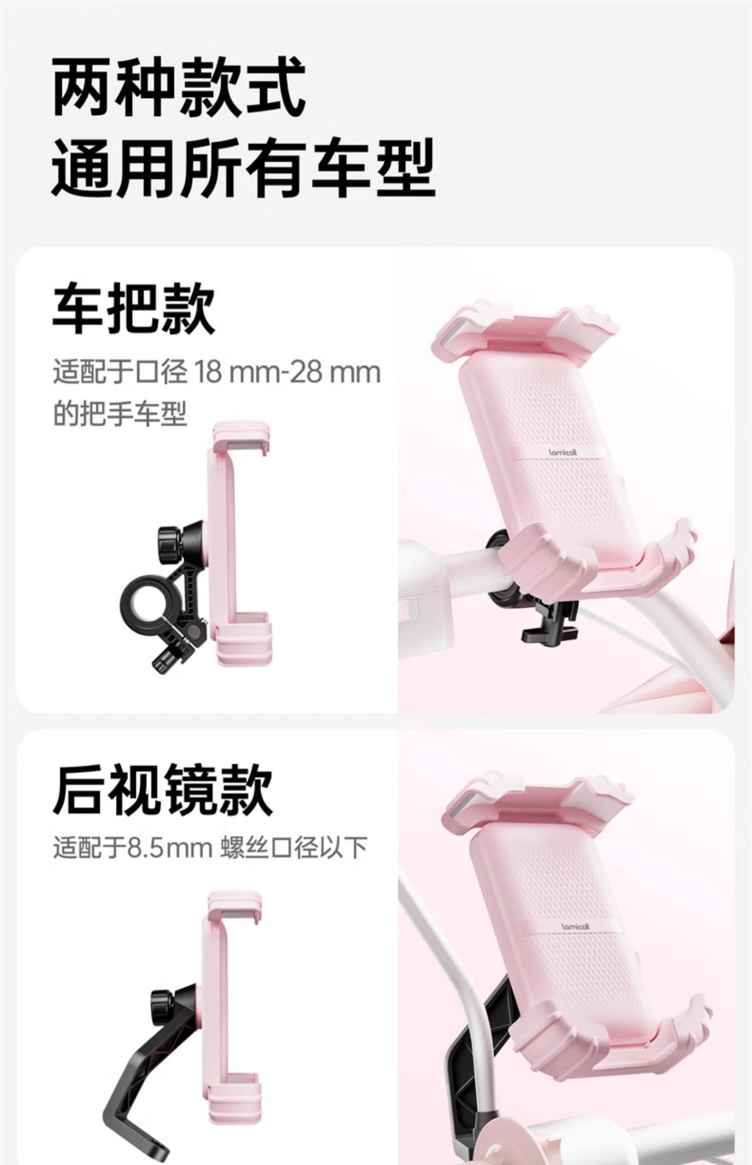 | Color Classification | Peach Pink [Mirror Stand Model] One-Handed Pick-Up and Placement, Shock-Resistant and Anti-Shake,Peach Pink [Handlebar Mount] One-Handed Access, Shockproof & Anti-Shake,Cool Black [Mirror Base Model] One-Handed Placement, Shock-Resistant and Anti-Shake,Cool Black [Handlebar Mount] - One-Handed Access, Shockproof & Anti-Shake,[Handlebar Style] Made of Fine Steel✅Anti-Seismic and Anti-Shake✅One-Handed Access,[Crab Claw Style] Made of Fine Steel✅Anti-Seismic and Anti-Shake✅Thickened Silicone |