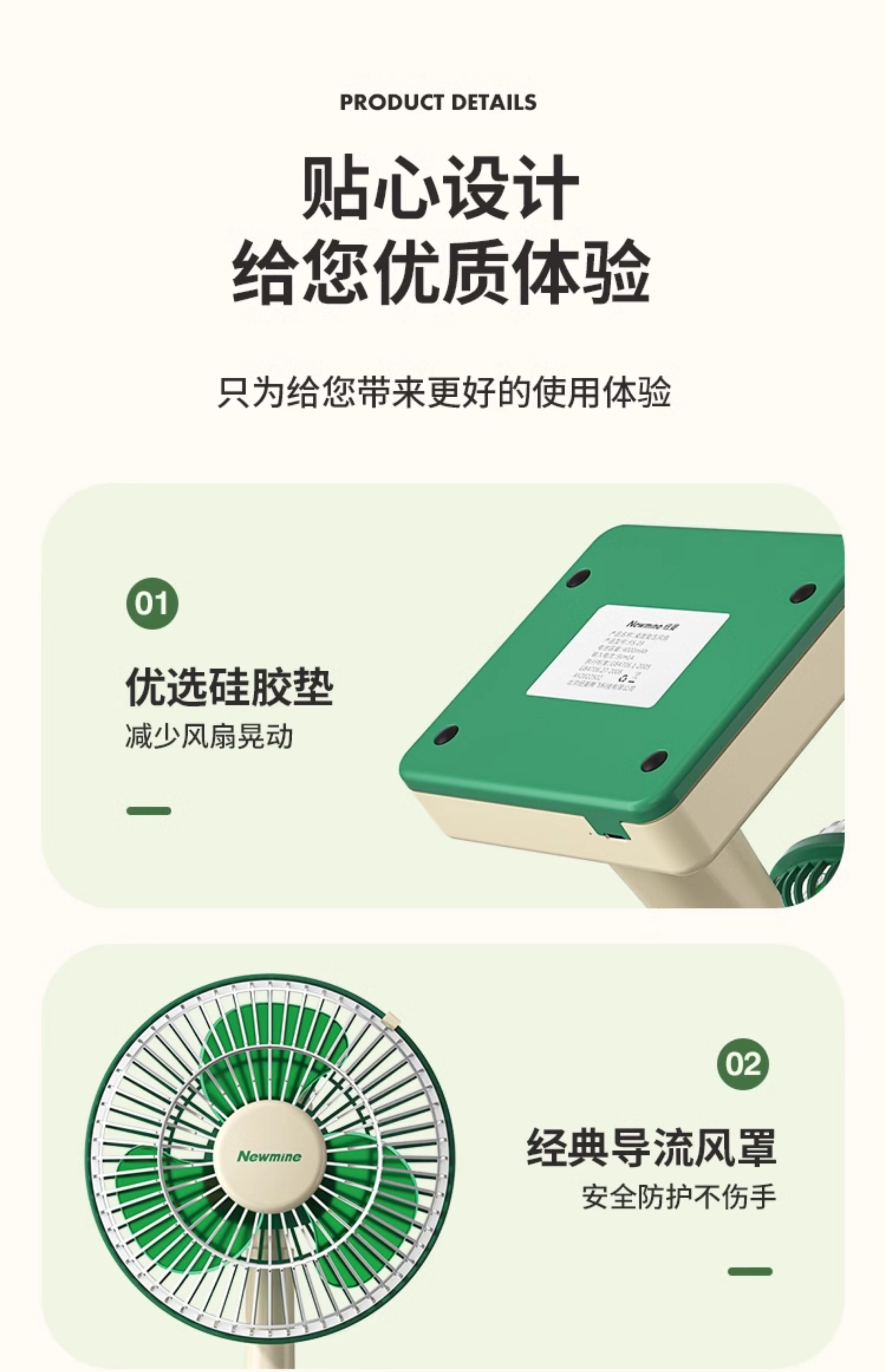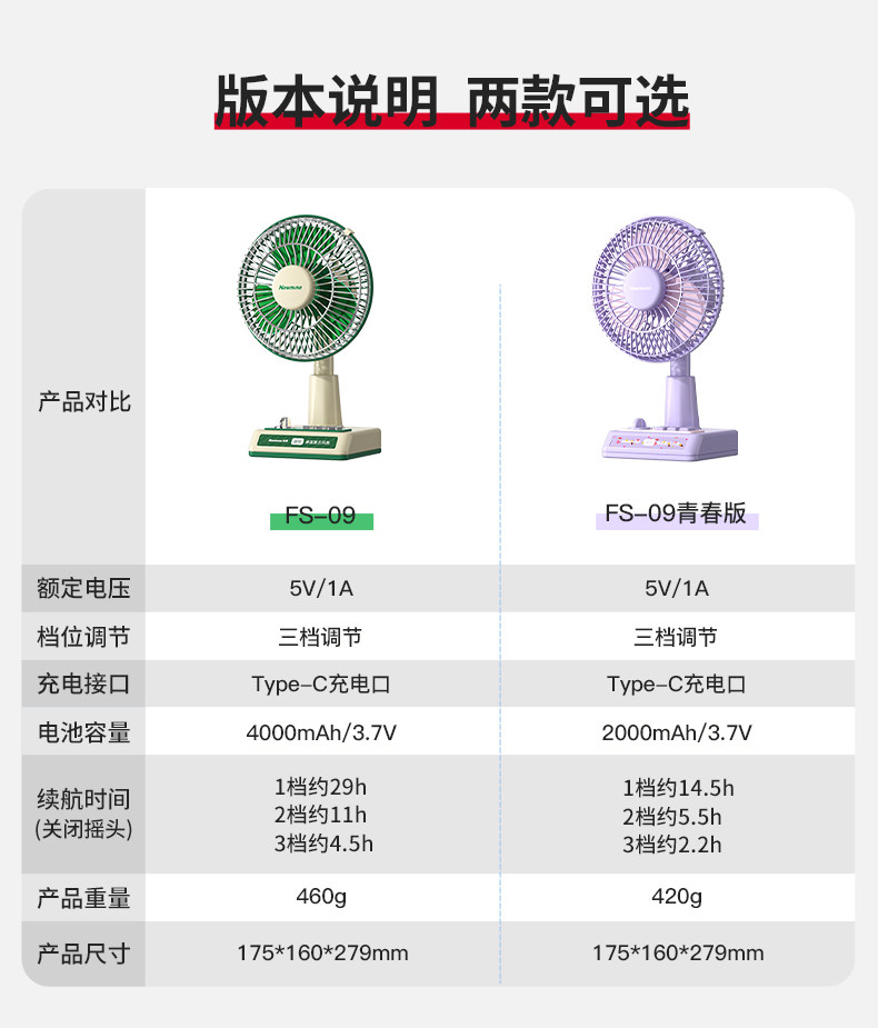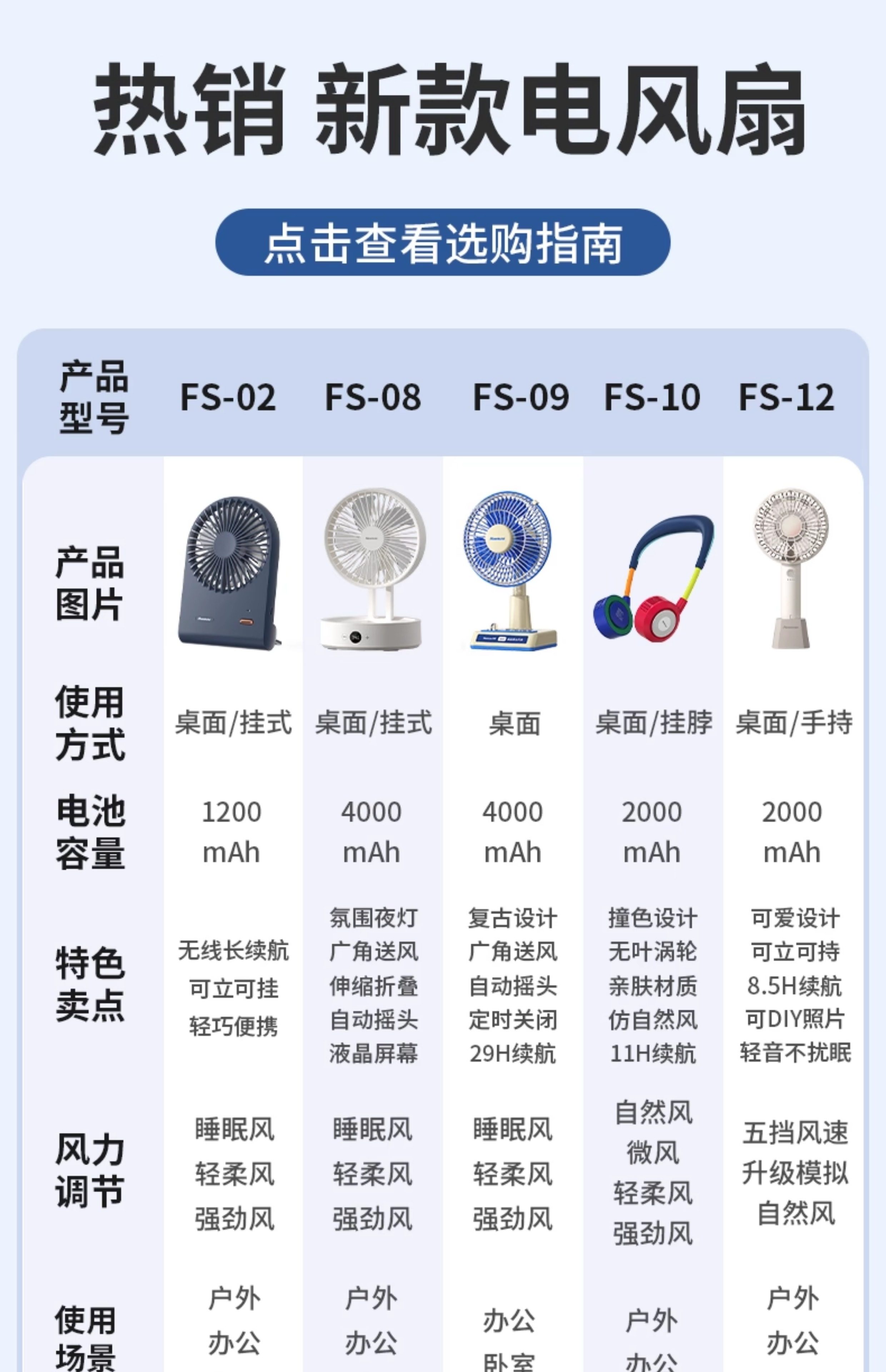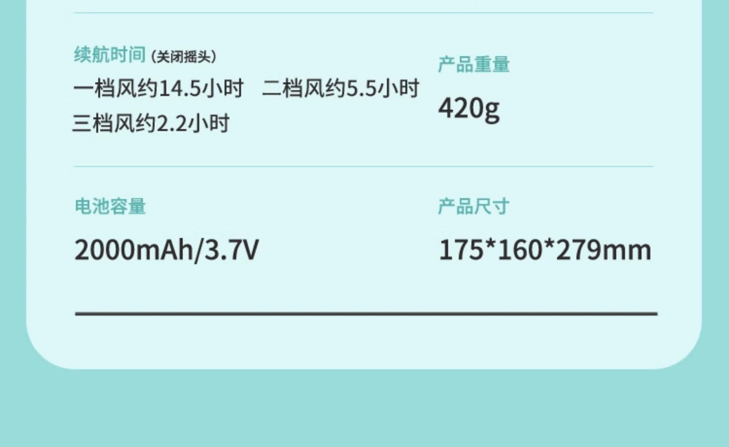 | Color Classification | [Midsummer Green] 4000Mah★29 Hours Long Battery Life★Three Wind Speeds★Automatically Shake Head,[China Red] 4000Mah ★ 29 Hours Long Battery Life ★ Three Wind Speeds ★ Automatically Shake Head,[Lake Blue] 2000Mah★14.5 Hours Long Battery Life★Three Wind Speeds★Automatically Shake Head,[Sakura Pink] 2000Mah★14.5 Hours Long Battery Life★Three Wind Speeds★Automatically Shake Head,[Roland Purple] 2000Mah★14.5 Hours Long Battery Life★Three Wind Speeds★Automatically Shake Head,[Fresh White] 2000Mah★Intelligent Digital Display★Ambient Night Light★Wide-Angle Pan and Tilt★Folding Storage |
