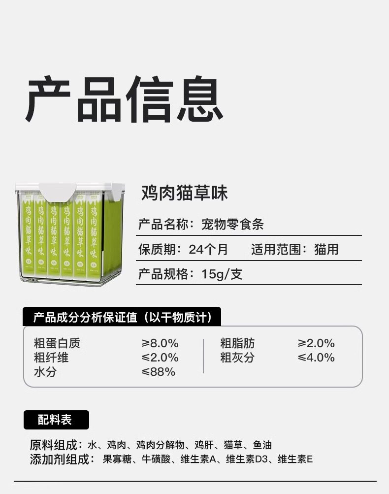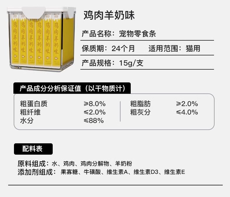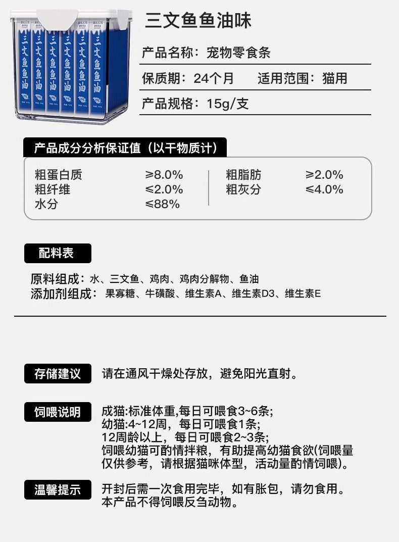 | Food Taste | [Salmon Fish Oil]100 Pieces/Barrel, Pampering This Worry-Free[Nurture Gastrointestinal Nutrition and Health Zero Additives],[Chicken and Cat Flavor]100 Pieces/Barrel, Pampering This Worry-Free[Nurture Gastrointestinal Nutrition and Health Zero Additives],[Mixed Flavors]100 Pieces/Barrel, Pampering This Worry-Free[Nurture Gastrointestinal Nutrition and Health Zero Additives] |