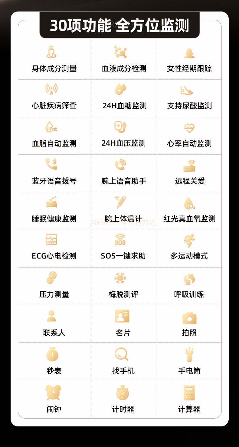 | Function | Exercise Tracking,Remote Selfie,Bluetooth,Step Counting,Health Monitoring,Menstrual Cycle Reminder (Female),Reminder to Sit for a Long Time,One-Click Help,Waterproof,Blood Pressure Monitoring,Body Temperature,Blood Sugar Test,Bluetooth Call,Information Push,Heart Rate Monitoring,Blood Oxygen Detection,Smart Reminder,Sleep Monitoring,Smart Q&A,Watch Features |