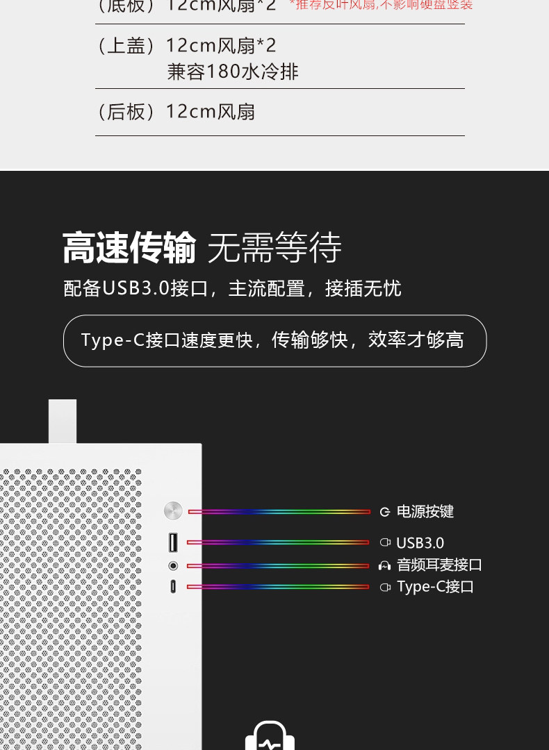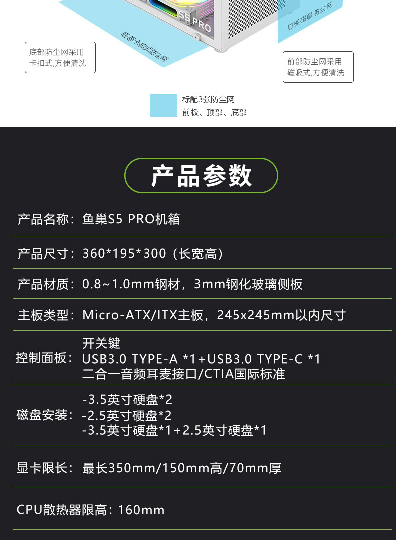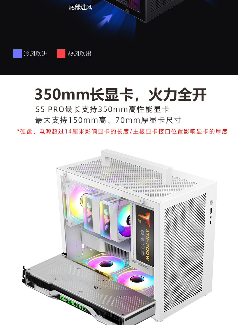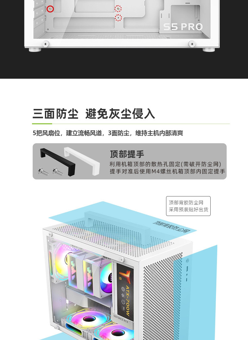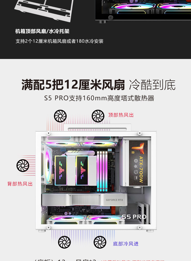 | Color Classification | S5Pro Black Single Chassis,S5Pro White Single Chassis,S5Pro Black + 3 White Light Fans,S5Pro Black + 5 White Light Fans,S5Pro Black + 3 Argb Fans,S5Pro Black + 5 Argb Fans,S5Pro Black + Radiator + 5 White Light Fans,S5Pro Black + Argb Radiator + 5 Argb Fans,S5Pro Black + 500W Power Supply + 3 White Light Fans,S5Pro Black + 600W Power Supply + 3 White Light Fans,S5Pro Black + 700W Power Supply + 3 White Light Fans,S5Pro Black +180 Water Cooling,S5Pro White + 3 White Light Fans,S5Pro White + 5 White Light Fans,S5Pro White + 3 Argb Fans,S5Pro White + 5 Argb Fans,S5Pro White + Radiator + 5 White Light Fans,S5Pro White + Argb Radiator + 5 Argb Fans,S5Pro White + 500W Power Supply + 3 White Light Fans,S5Pro White + 600W Power Supply + 3 White Light Fans,S5Pro White + 700W Power Supply + 3 White Light Fans,S5Pro White +180 Water Cooling |