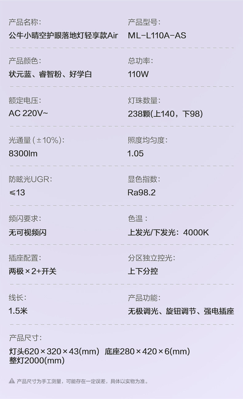 | Color Classification | Floor Lamp - Pro White[Full Spectrum Eye Protection]55W,Special Offer Lite White[Low Blue Light Eye Protection]110W Daily Limited Edition,Lightweight Lite White[Low Blue Light Eye Protection]110W Upper and Lower Control 16-20㎡,Lightweight Air White[Purple Light Eye Protection]110W Upper and Lower Control 16-20㎡,Lightweight Air Blue[Purple Light Eye Protection]110W Upper and Lower Control 16-20㎡,Lightweight Air Pink[Purple Light Eye Protection]110W Upper and Lower Control 16-20㎡,Special Offer Standard Model Air White[Purple Light Eye Protection]120W Limited to 9 People Per Day,Standard Air White[Purple Light Eye Protection]120W Voice Control, Top and Bottom Independent Control, 18-22㎡,Standard Pro White[Purple Light Eye Protection]120W Imported Sunlike Lamp Beads 18-22㎡,Special Offer Lite White |