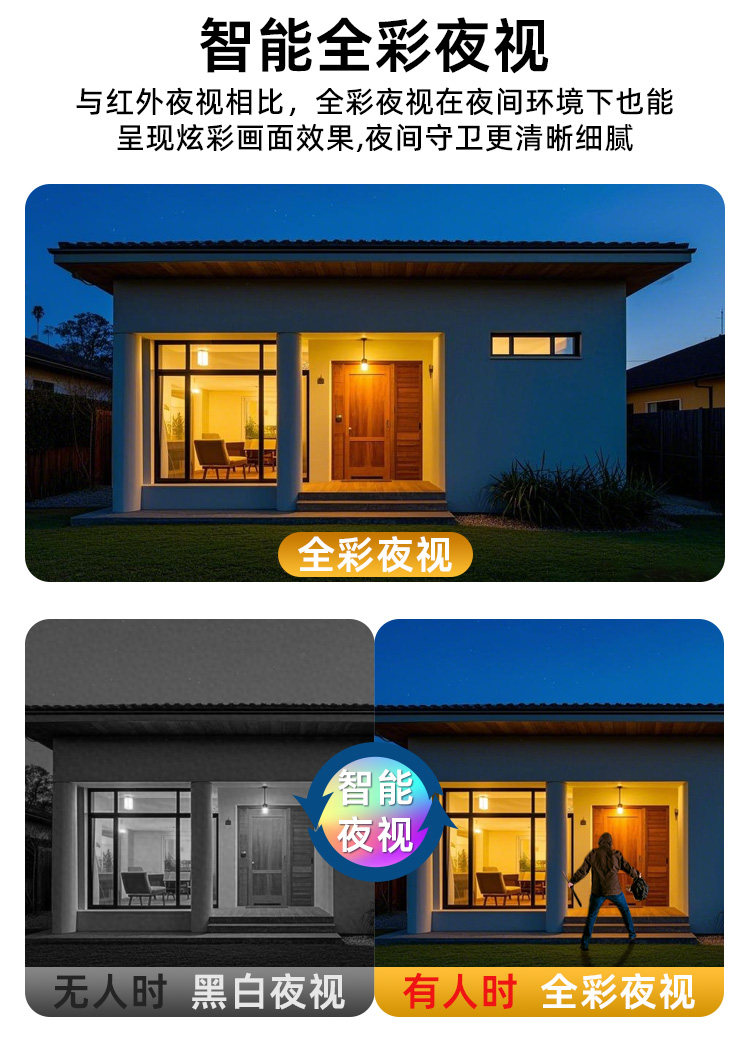 | Function | Full Color Night Vision,Binocular and Multiocular,Mobile Tracking,Perimeter Alarm,Recording,360 Degree Monitoring,Two-Way Voice Intercom,Pet Identification |