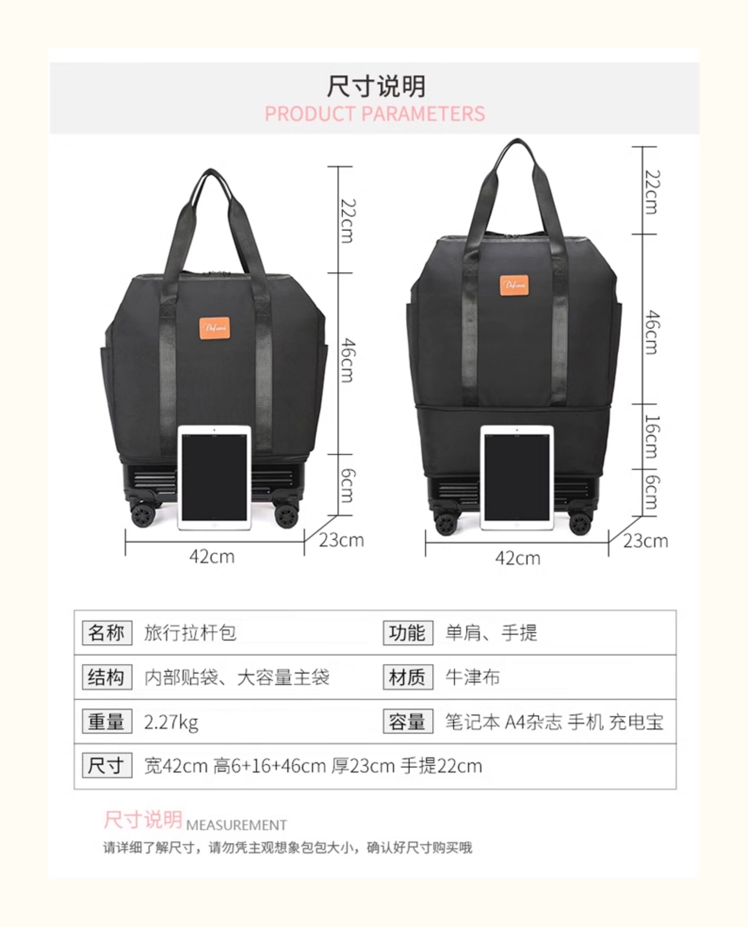 | Bag Size | 42*23*(6+16)+46CM |