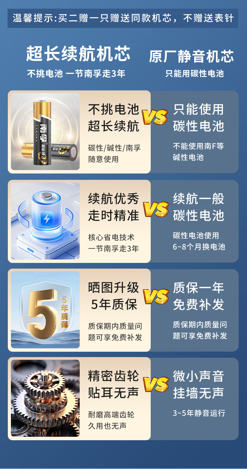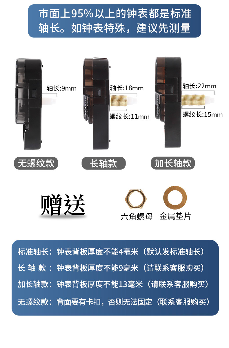 Size Original Factory Sweep-Second Movement [Standard Shaft Length] - Carbon-Zinc Batteries Only.,Original Factory Sweep-Second Movement [Long Shaft Model] - Carbon-Zinc Batteries Only.,Original Factory Sweep-Second Movement [Extended Shaft Version] - Carbon-Zinc Batteries Only.,Long Battery Life Movement [Standard Shaft Length] 3 Years with One Nanfu,Long Battery Life Movement [Long Axis Model] 3 Years of Use with One Nanfu,Long Battery Life Movement [Extended Shaft Model] Uses One Nanfu Battery for 3 Years