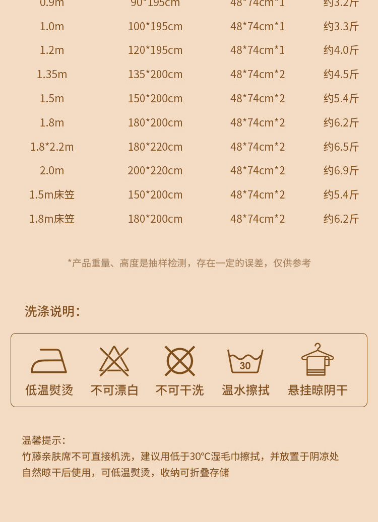| Color Classification | Hot Selling Model❄️Bamboo and Rattan Mat[Natural Material Selection/High Temperature Carbonization/Reversible Use]No Pillowcase,Hot Selling Model❄️Bamboo and Rattan Mat[Natural Material Selection/High Temperature Carbonization/Reversible Use]With Rattan Pillowcase,Basic Model ❄️ Polishing Mat[Sleeping Naked Is Skin-Friendly/Naturally Cool/Reversible]No Pillowcase,Fresh Style❄️Patterned Bamboo Mat[Mugwort Repels Mosquitoes/Helps Sleep and Soothes the Mind/Reversible]No Pillowcase,Fresh Style❄️Patterned Bamboo Mat[Mugwort Repels Mosquitoes/Helps Sleep and Soothes the Mind/Reversible]With Rattan Pillowcase,Upgraded Model❄️Water Mill Mat[Mugwort Mosquito Repellent/Antibacterial and Anti-Mite/Reversible]No Pillowcase,Upgraded Model❄️Water Mill Mat[Mugwort Mosquito Repellent/Antibacterial and Anti-Mite/Reversible]With Rattan Pillowcase,Children's Model❄️Mellow Bamboo Mat[Class a Seat Surface/Antibacterial and Anti-Mite/Reversible]With Rattan Pillowcase,Fashionable Style❄️Skin-Friendly Seat[Antibacterial and Anti-Mite/Suitable for Mothers and Infants/Smooth and Thorn-Free]With Rattan Pillowcase,Light Luxury Style❄️Ecological Seat[Upgraded and Thickened/Cool but Not Icy/Comfortable to Sleep Naked]No Pillowcase,Light Luxury Style❄️Ecological Seat[Upgraded and Thickened/Cool but Not Icy/Comfortable to Sleep Naked]With Rattan Pillowcase,Selected Models❄️Hydrating Mat[Double Layer Thickening/Natural Cooling/No Air Conditioning Required]No Pillowcase,Selected Models❄️Hydrating Mat[Double Layer Thickening/Natural Cooling/No Air Conditioning Required]With Rattan Pillowcase,Exclusive Edition❄️Original Bamboo Mat[Maternal and Infant Category A/Secondary Carbonization/Deep Antibacterial]With Rattan Pillowcase,Golden Needle Award❄️Wood Grain Mat[Top Layer Bamboo Green/Hand-Woven/Store Manager Recommended]With Rattan Pillowcase,[Premium Selection]❄️Yuzhu Cool Mat[Double-Sided Use/Cool to the Touch/Breathable and Not Stuffy]With Rattan Pillowcase,[Exclusive Edition]❄️Satin Silky Mat[Double-Sided Use/Cool to the Touch/Breathable and Not Stuffy]With Rattan Pillowcase,[Royal Enjoyment]❄️Silk Mist Ice Muscle Mat[Double-Sided Use/Cool to the Touch/Breathable and Not Stuffy]With Rattan Pillowcase,[The Ultimate Style]❄️Pearl Soothing Mat[Double-Sided Use/Cool to the Touch/Breathable and Not Stuffy]With Rattan Pillowcase,[Master Model]❄️Moonlight Silk Mat[Double-Sided Use/Cool to the Touch/Breathable and Not Stuffy]With Bamboo Pillowcase |