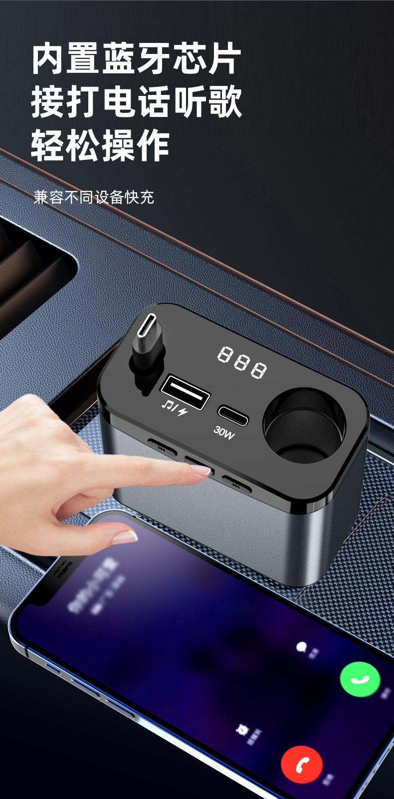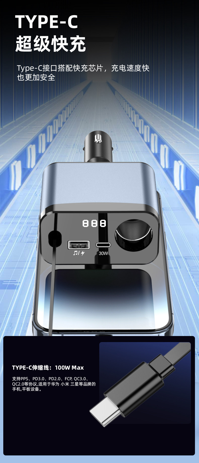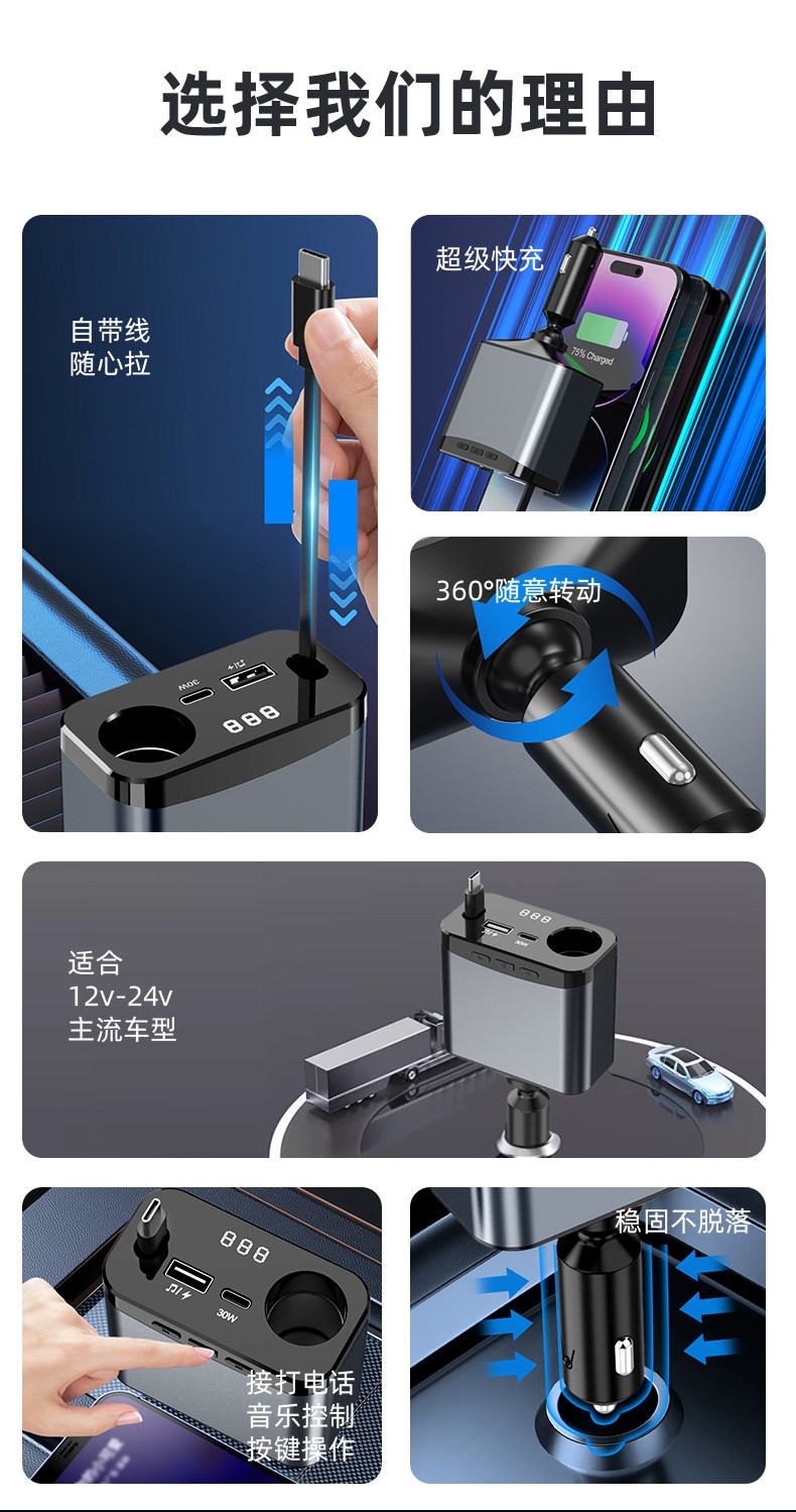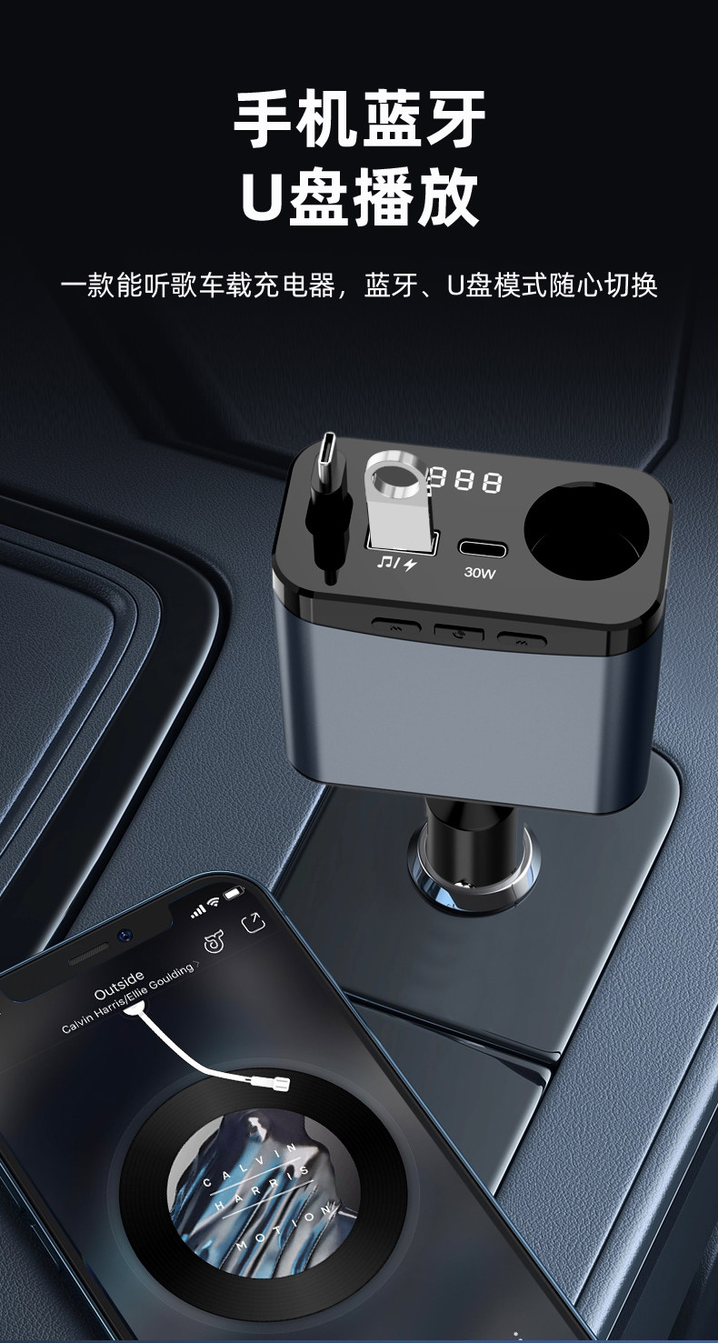 Car Bluetooth Mp3 Charger Super Fast Charging Retractable Cable Pd Multi-Function Music Cigarette Lighter Adapter Car Charger