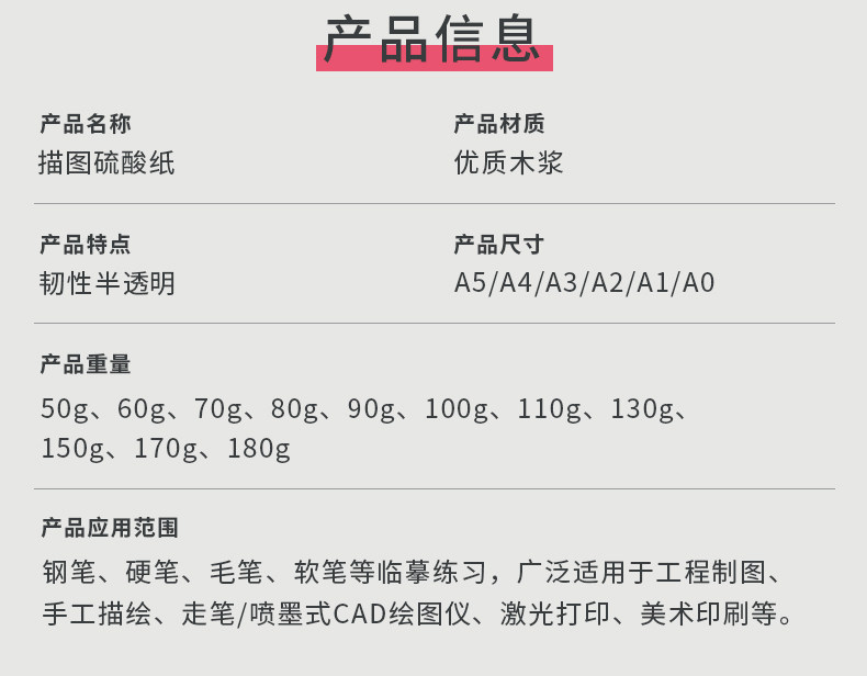 | Color Classification | A4 Sulfuric Acid Paper,A5 Sulfuric Acid Paper,A3 Sulfuric Acid Paper,A5 [148*210mm] 50 Sheets,A5 [148*210mm] 100 Sheets,A4 [210*297mm] 50 Sheets,A4 [210*297mm] 100 Sheets,A3 [297*420mm] 50 Sheets,A3 [297*420mm] 100 Sheets,A2 [420*594 mm] 25 Sheets,A2 [420*594 mm] 50 Sheets,A1 [594*841 mm] 20 Sheets,A0 [850*1194mm] 10 Sheets |
