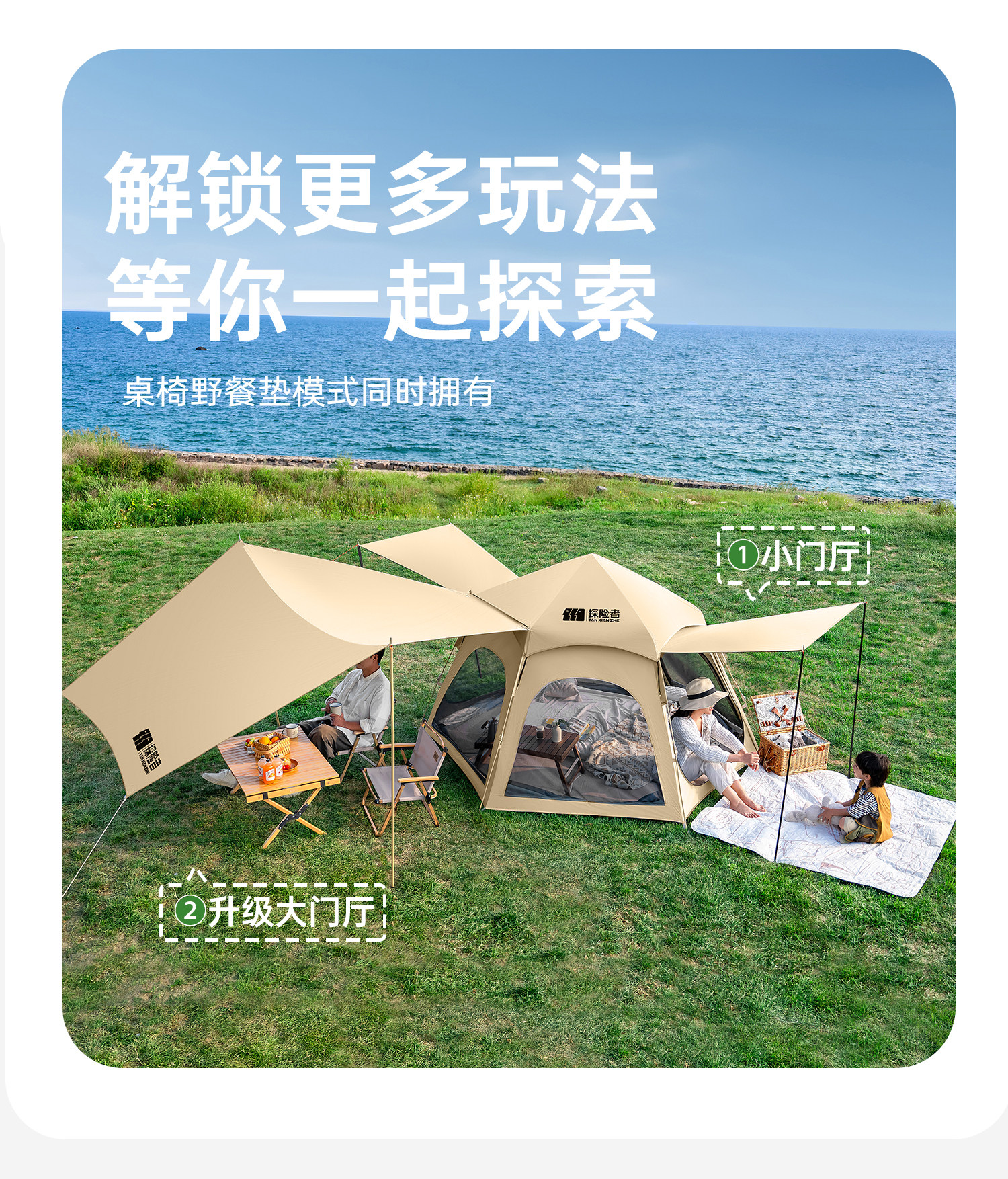 Explorer Tent Outdoor Portable Folding Camping Equipment Full Set with Integrated Canopy for Overnight Camping, Rainproof and Thickened