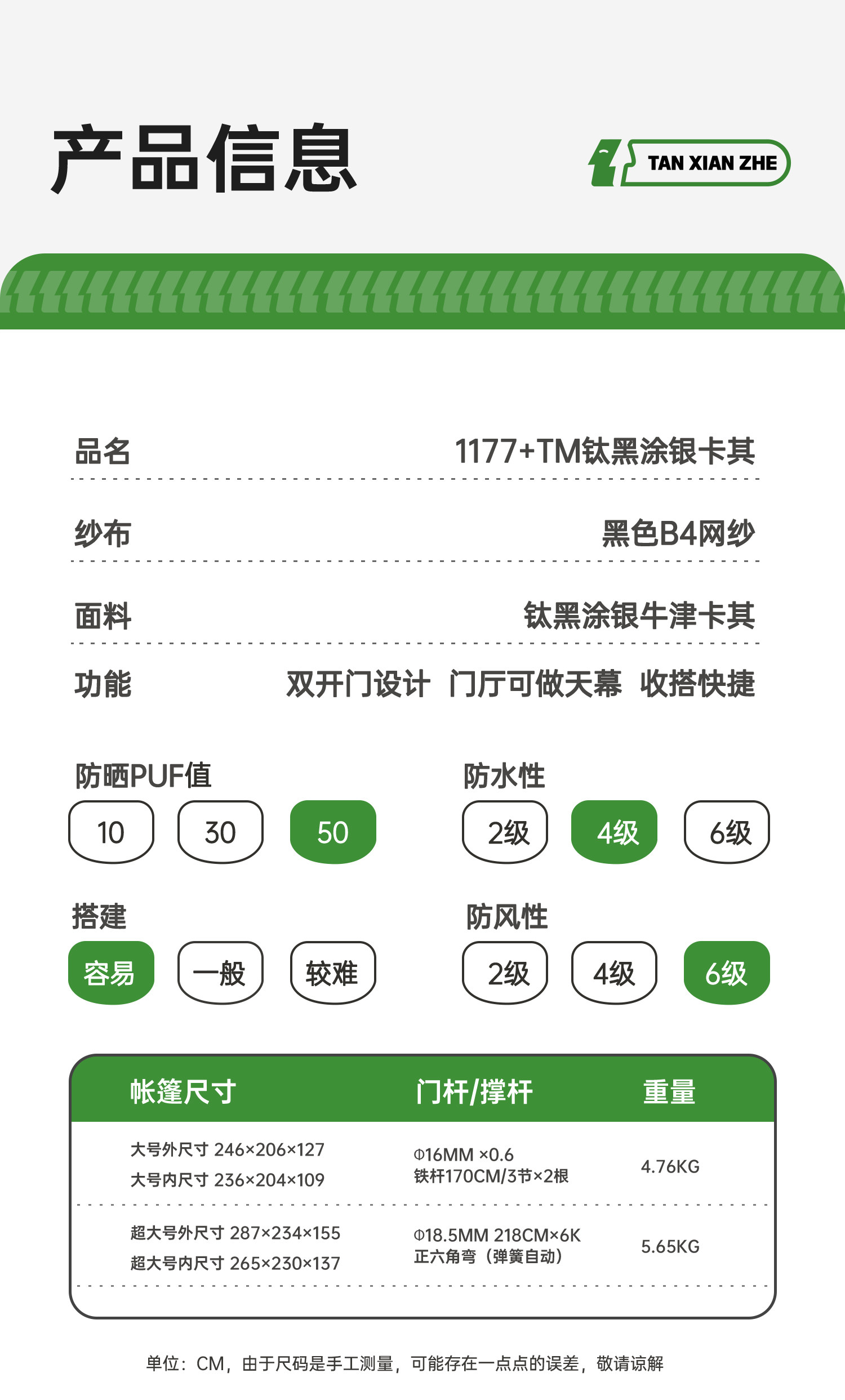| External Tent Material | 210D Oxford Cloth |