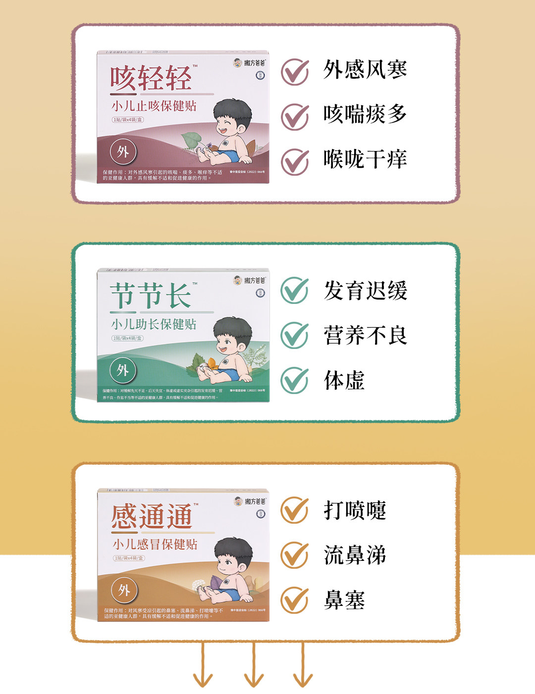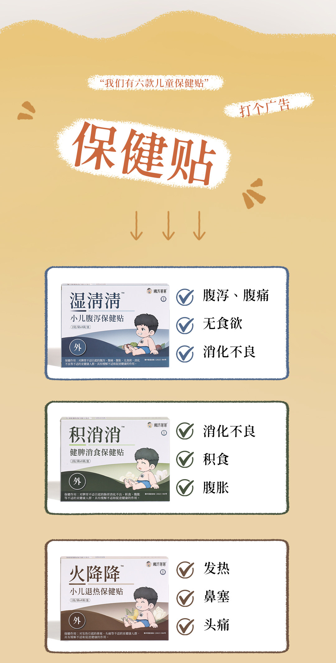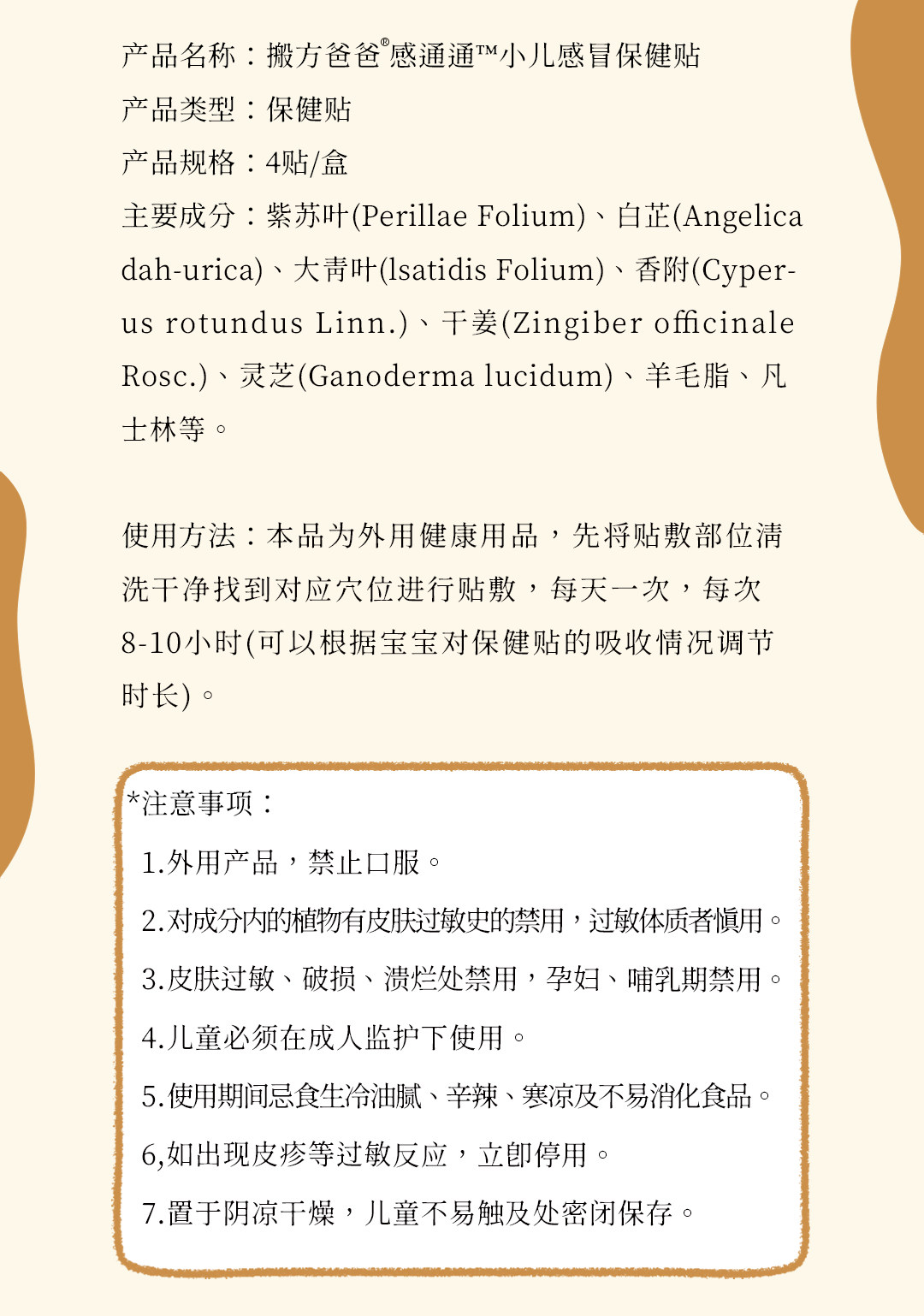 | Color Classification | [Thank You]Children's Cold Health Patch*1 Box × 4 Patches/Single Box Formula: Perilla Leaves, Angelica Dahurica, Polygonum Leaves, Polygonum, Dried Ginger, Ganoderma Lucidum, Lanolin, Petroleum Jelly, Etc.,[Wet and Clear]Pediatric Diarrhea Health Patch*1 Box × 4 Patches/Single Box Formula: Xiangfu, Turmeric, Radish, Bergenia, Astragalus, Hawthorn, Red Peony, Ganoderma Lucidum, Lanolin, Petroleum Jelly, Etc.,[Fire Falls]Pediatric Antipyretic Health Patch*1 Box × 4 Patches/Single Box Formula: Bupleurum, Cinnamon Twigs, Jinjie, Gypsum, Periwinkle Leaves, Forsythia, Honeysuckle, Angelica, Licorice, Ganoderma Lucidum, Lanolin, Petroleum Jelly, Etc.,[Cough Gently]Pediatric Cough Relief Patches * 1 Box (4 Patches/Box) Formula: Contains Platycodon Grandiflorum, Cinnamon Twigs, Pinellia, Clove, Asarum, Bitter Apricot Kernel, Licorice Root, Ganoderma Lucidum, Lanolin, and Petrolatum.,[Accumulate and Eliminate]Spleen-Invigorating & Digestion-Boosting Health Patches * 1 Box (4 Patches/Box) - Single Box,[Long]Children's Health Promotion Patch*1 Box×4 Patches/Single Box |