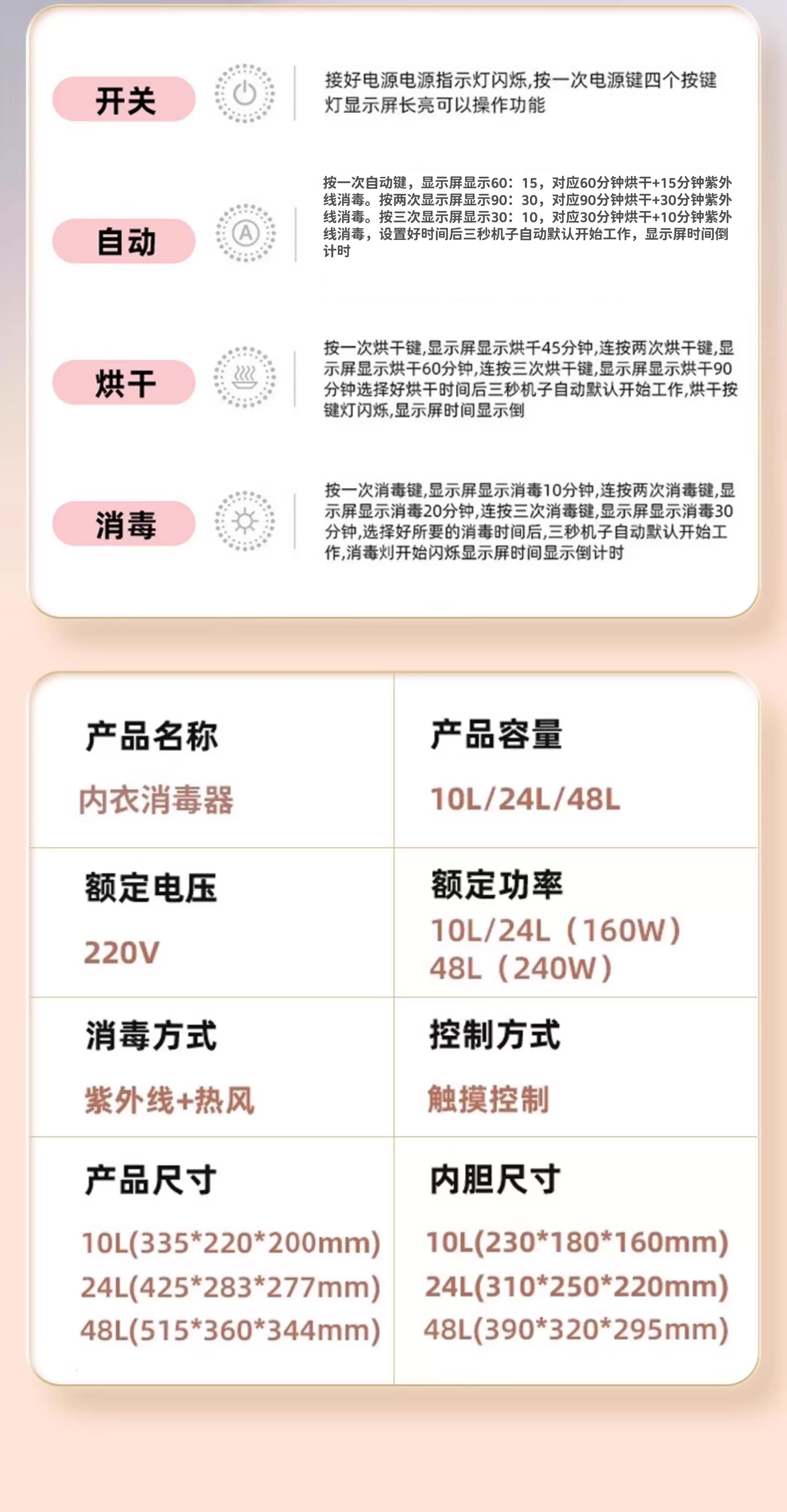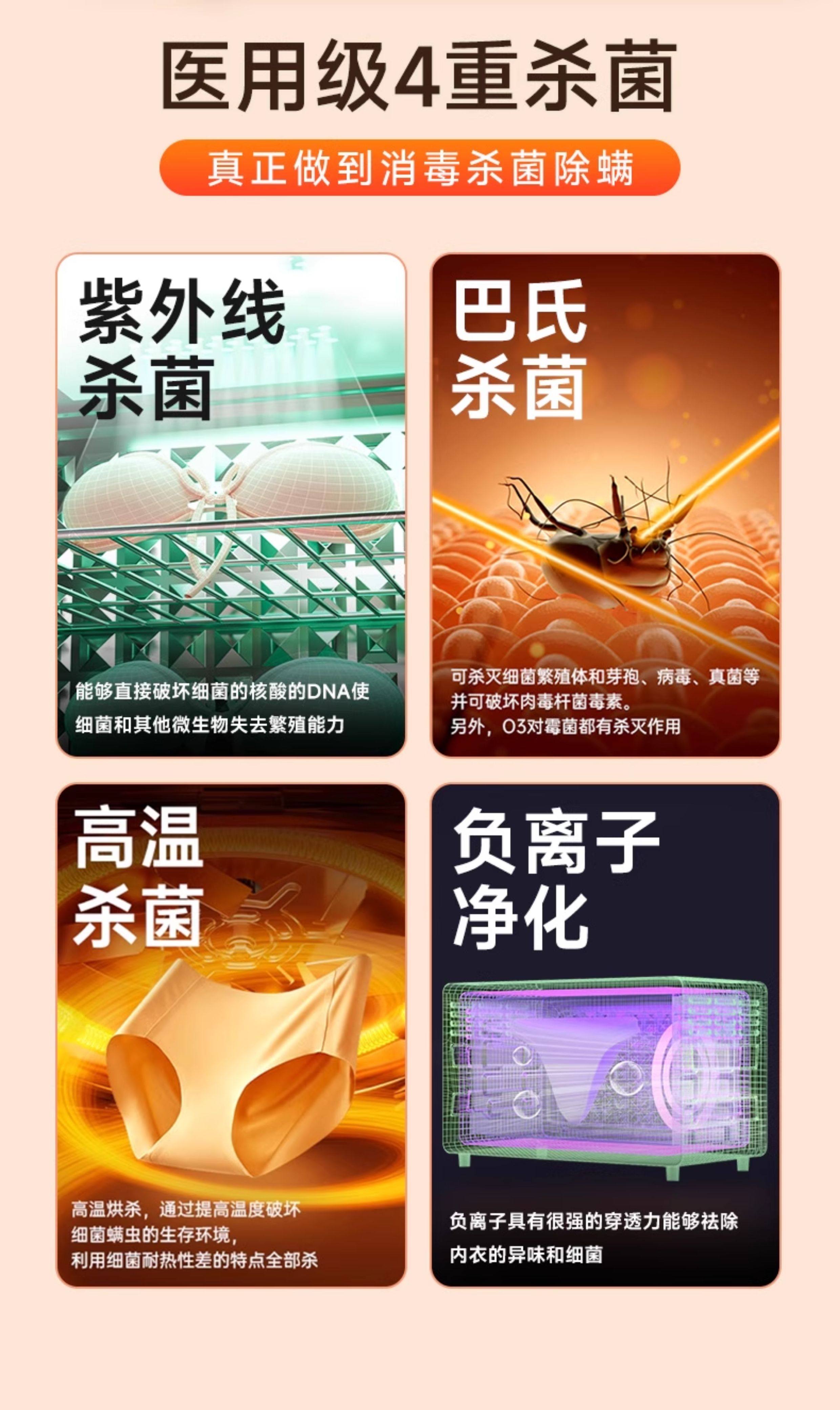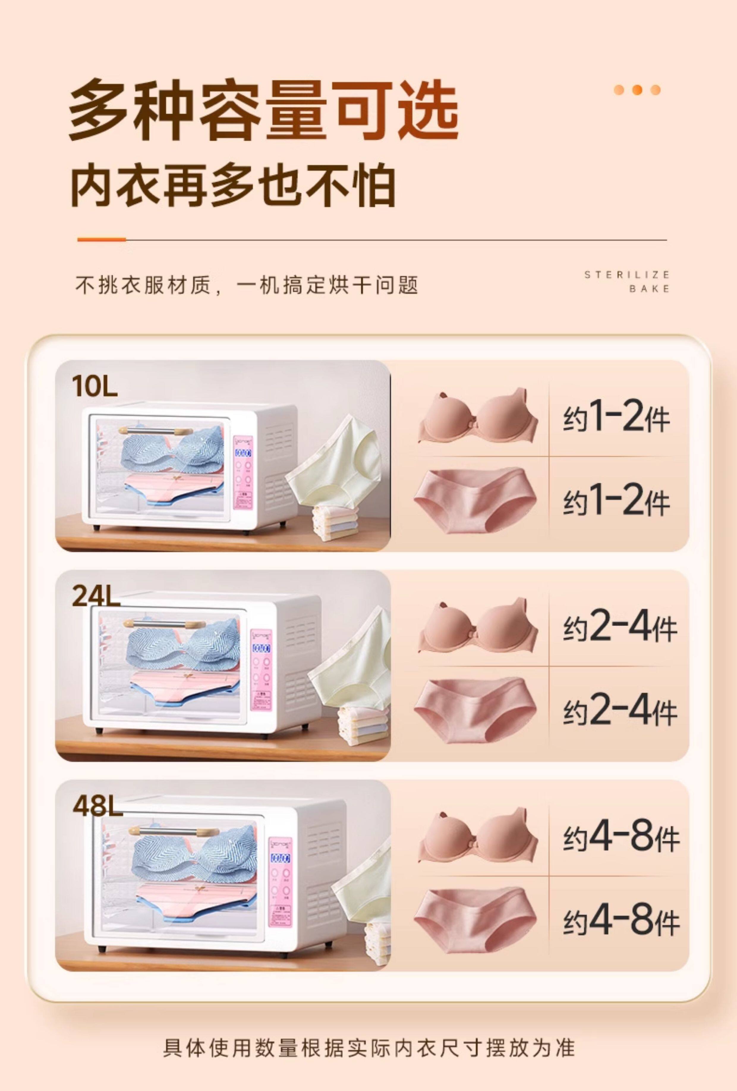 | Color Classification | 10L [Upgraded Model] Two-Star Ultraviolet Sterilization + Hot Air Drying [Suitable for 1-2 Pieces of Underwear],10L [Flagship Model] Two-Star Sterilization + Drying + 24H Asepsis + 12H Warmth [Suitable for 1-2 Pieces of Underwear],24L [Upgraded Model] Two-Star Ultraviolet Sterilization + Hot Air Drying [Suitable for 4-8 Pieces of Underwear],24L [Flagship Model] Two-Star Sterilization + Drying + 24H Asepsis + 12H Warmth [Suitable for 4-8 Pieces of Underwear],48L [Upgraded Model] Two-Star Ultraviolet Sterilization + Hot Air Drying [8-16 Pieces of Underwear],48L [Flagship Model] Two-Star Sterilization + Drying + 24H Asepsis + 12H Warmth [8-16 Pieces of Underwear],68L [Hanging Model] (24H Sterile + 12H Warm) Comprehensive Drying + Ozone + Ultraviolet [with 6 Stainless Steel Hangers],10L [Basic Model] Ultraviolet Sterilization (No Drying Function) |