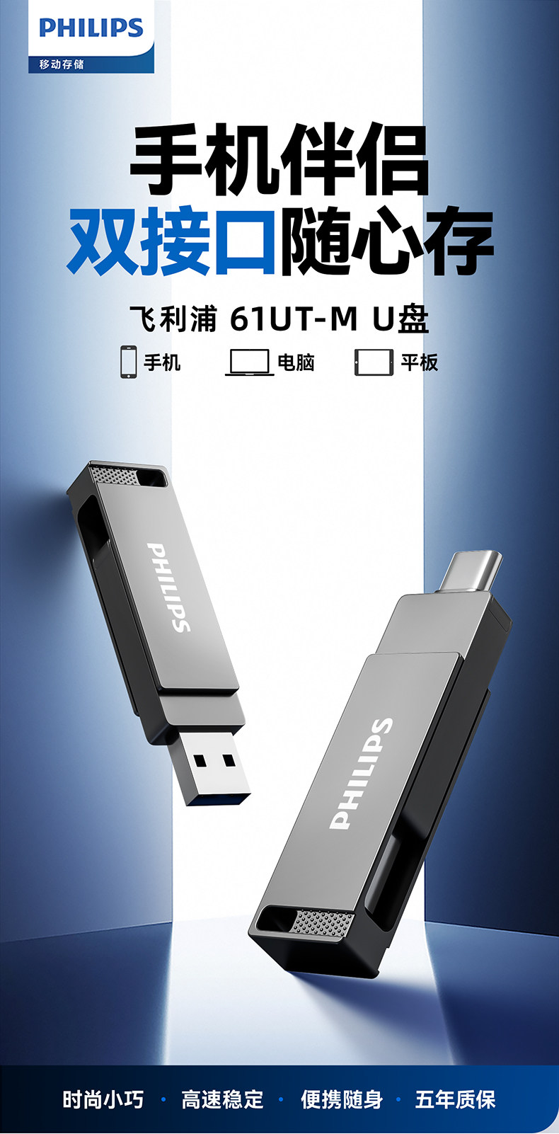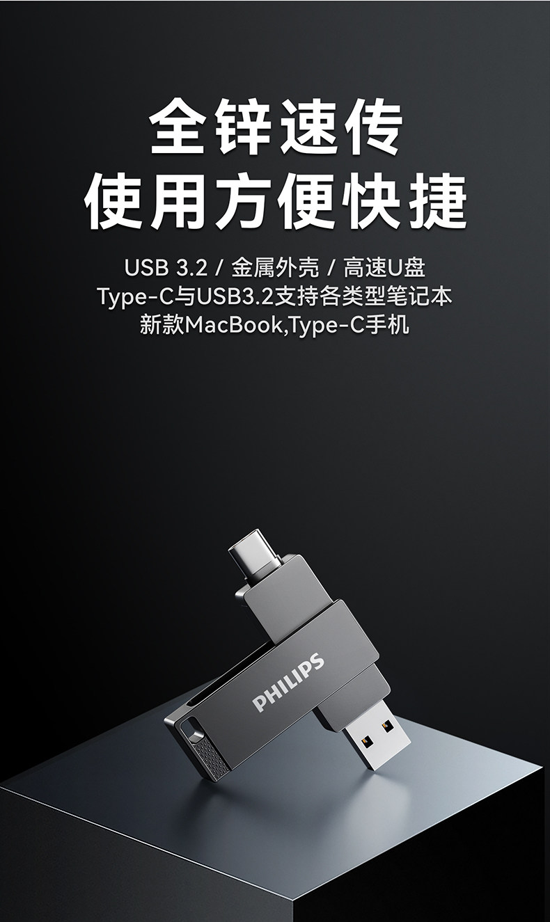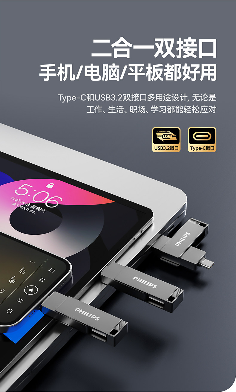 Philips USB Flash Drive Suitable for Huawei Mobile Phones, Dual Interface Typec, High-Speed, Large Capacity 256g, Double-Ended USB Flash Drive, Genuine Product
