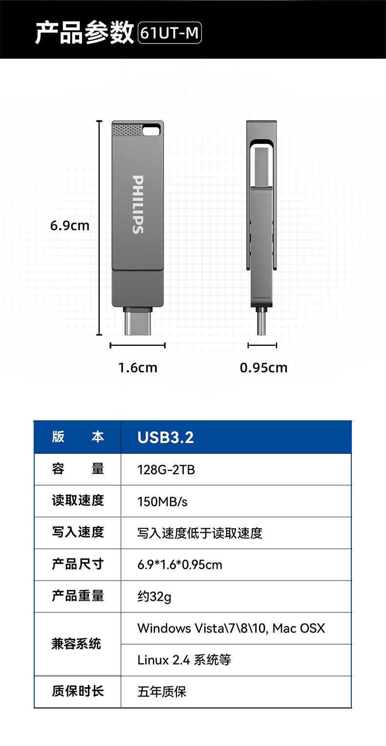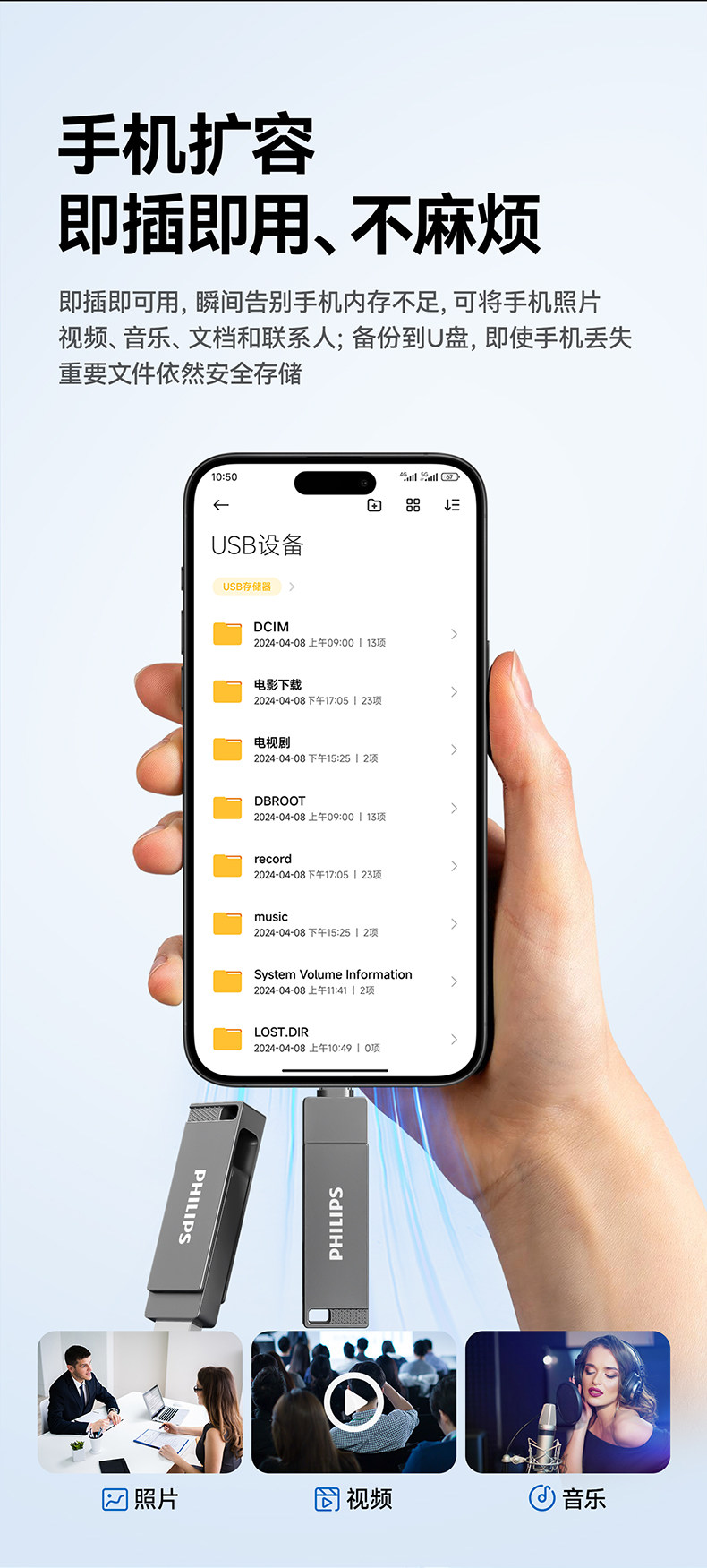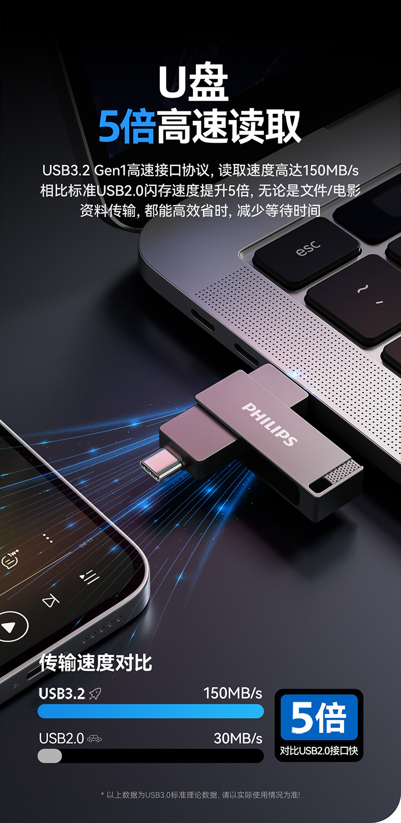 Philips USB Flash Drive Suitable for Huawei Mobile Phones, Dual Interface Typec, High-Speed, Large Capacity 256g, Double-Ended USB Flash Drive, Genuine Product