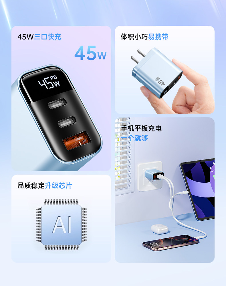 | Color Classification | Single head, mist white, 45W three-port smart digital display丨low temperature fast charging without damaging the machine,Single head, star silver gray, 45W three-port smart digital display丨low temperature fast charging without damaging the machine,Single head Yuanshan Blue 45W three-port smart digital display丨Low temperature fast charging will not damage the machine,6-14 Set[Foggy White]45W Three-Port Smart Display Fast Charging Head + 1m Pd Fast Charging Cable,6-14 Set[Star Silver Gray]45W Three-Port Smart Display Fast Charging Head + 1m Pd Fast Charging Cable,6-14 Set[Distant Mountain Blue]45W Three-Port Smart Display Fast Charging Head + 1m Pd Fast Charging Cable,15/16/17 Set[Foggy White]45W Three-Port Smart Display Fast Charging Head + 1m Double C Fast Charging Cable,15/16/17 Set[Star Silver Gray]45W Three-Port Smart Display Fast Charging Head + 1m Double C Fast Charging Cable,15/16/17 Set[Distant Mountain Blue]45W Three-Port Smart Display Fast Charging Head + 1m Double C Fast Charging Cable,6-14 Set[Foggy White]45W Three-Port Smart Display Fast Charging Head +1.5m Pd Fast Charging Cable,6-14 Set[Star Silver Gray]45W Three-Port Smart Display Fast Charging Head +1.5m Pd Fast Charging Cable,6-14 Set[Distant Mountain Blue]45W Three-Port Smart Display Fast Charging Head +1.5m Pd Fast Charging Cable,15/16/17 Set[Foggy White]45W Three-Port Smart Display Fast Charging Head +1.5m Dual C Fast Charging Cable,15/16/17 Set[Star Silver Gray]45W Three-Port Smart Display Fast Charging Head +1.5m Dual C Fast Charging Cable,15/16/17 Set[Distant Mountain Blue]45W Three-Port Smart Display Fast Charging Head +1.5m Dual C Fast Charging Cable,6-14 Set[Foggy White]45W Three-Port Smart Display Fast Charging Head + 2m Pd Fast Charging Cable,6-14 Set[Star Silver Gray]45W Three-Port Smart Display Fast Charging Head + 2m Pd Fast Charging Cable,6-14 Set[Distant Mountain Blue]45W Three-Port Smart Display Fast Charging Head + 2m Pd Fast Charging Cable,15/16/17 Set[Foggy White]45W Three-Port Smart Display Fast Charging Head + 2m Double C Fast Charging Cable,15/16/17 Set[Star Silver Gray]45W Three-Port Smart Display Fast Charging Head + 2m Double C Fast Charging Cable,15/16/17 Set[Distant Mountain Blue]45W Three-Port Smart Display Fast Charging Head + 2m Double C Fast Charging Cable |
