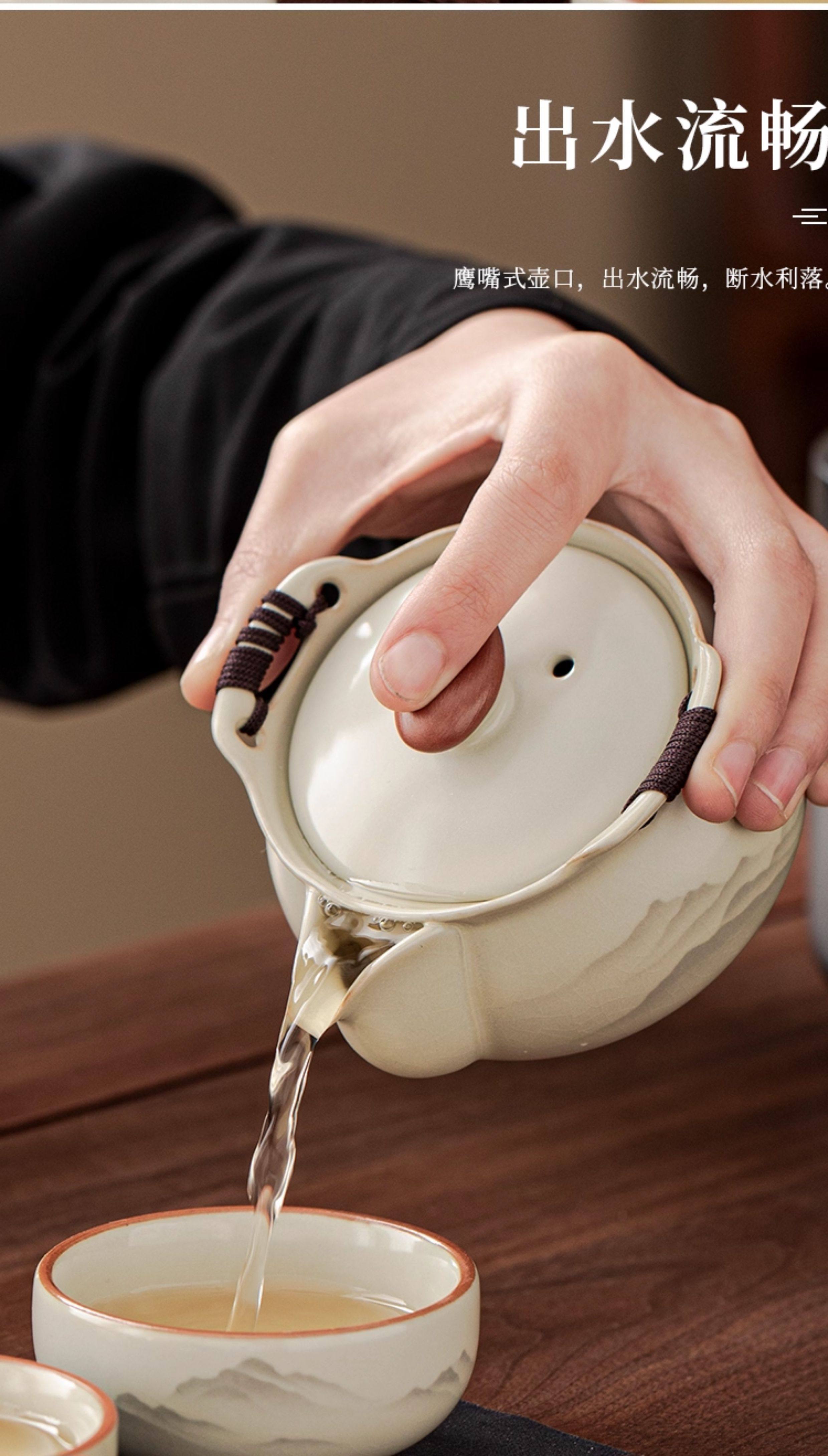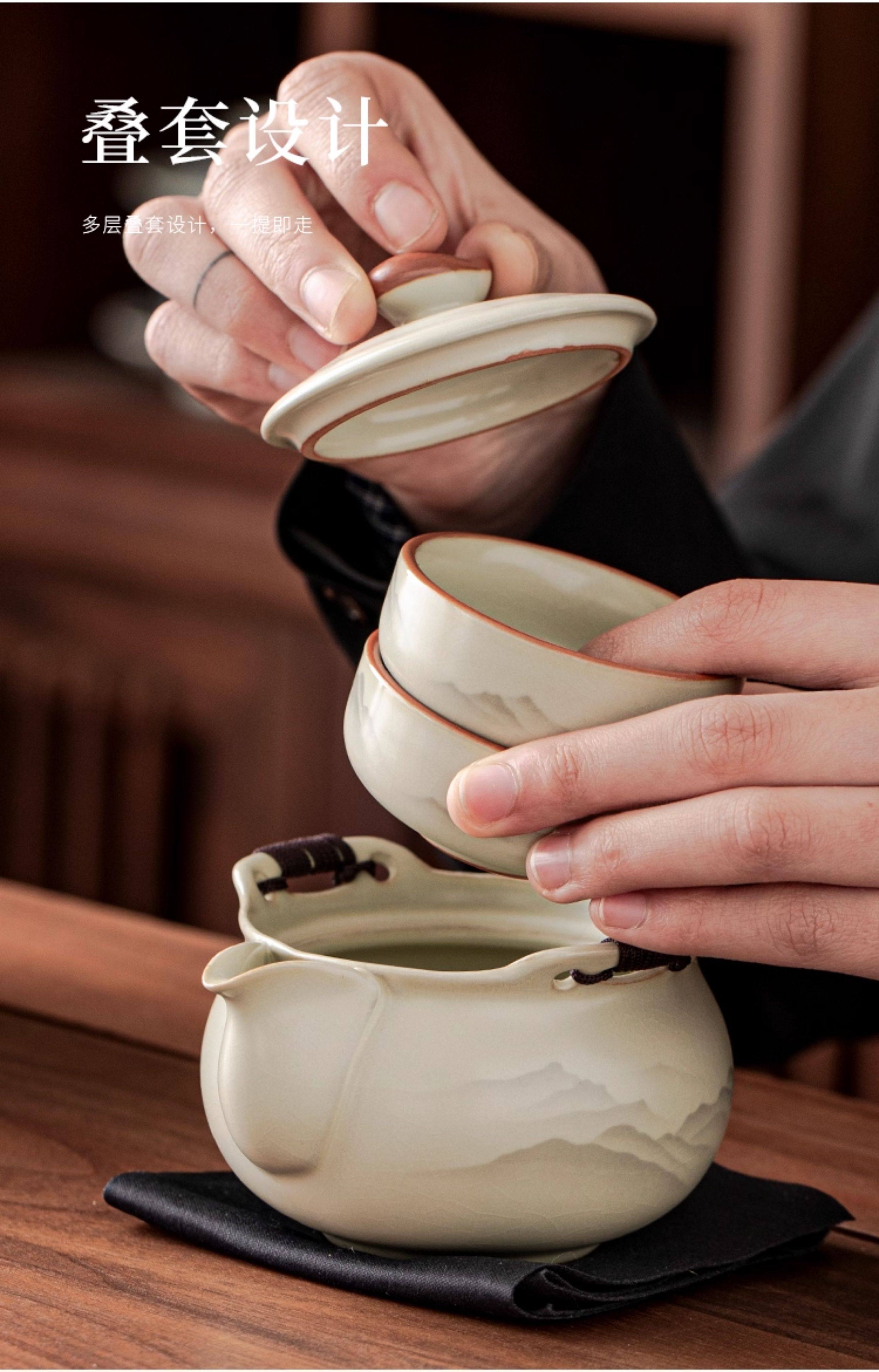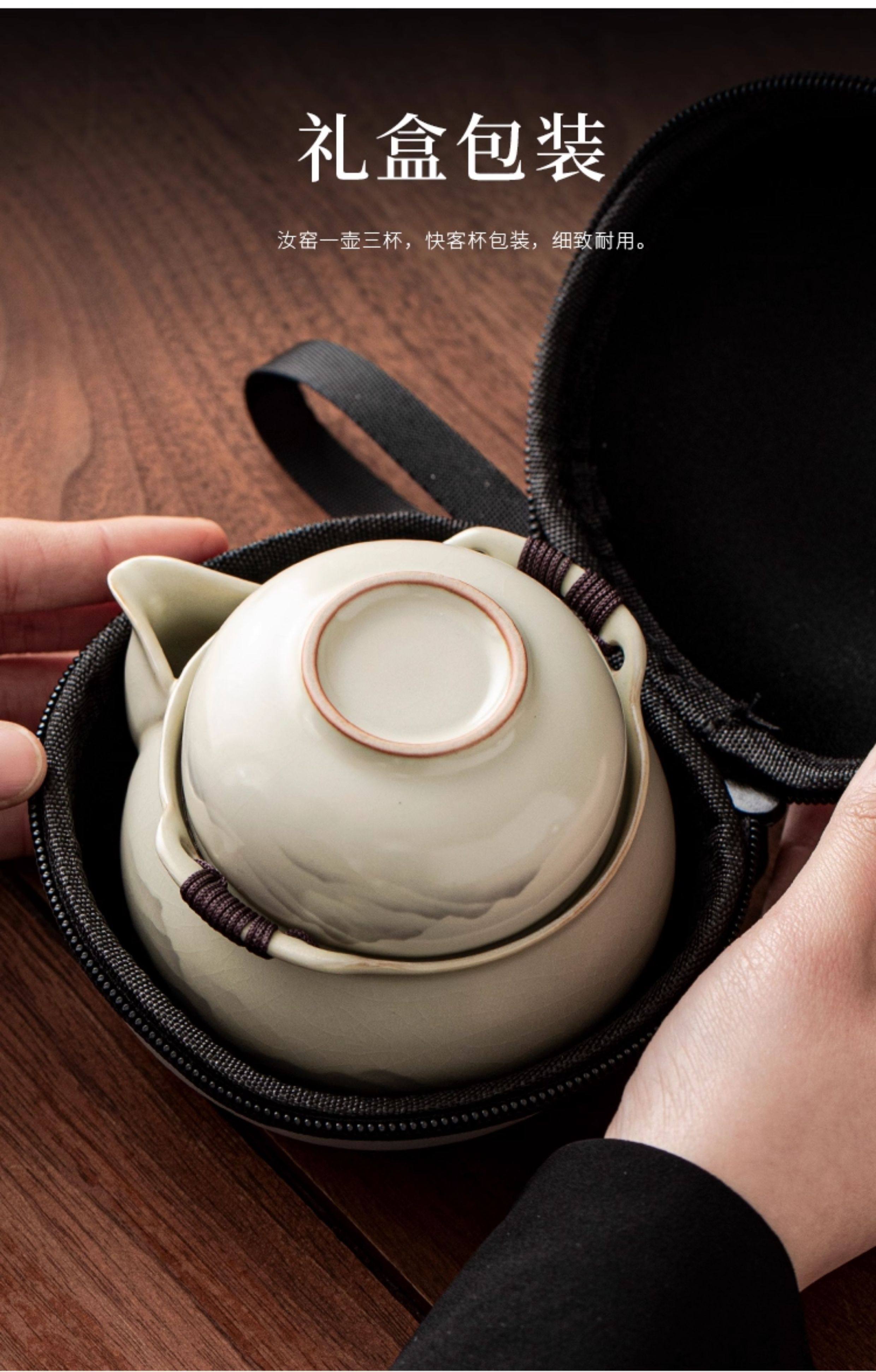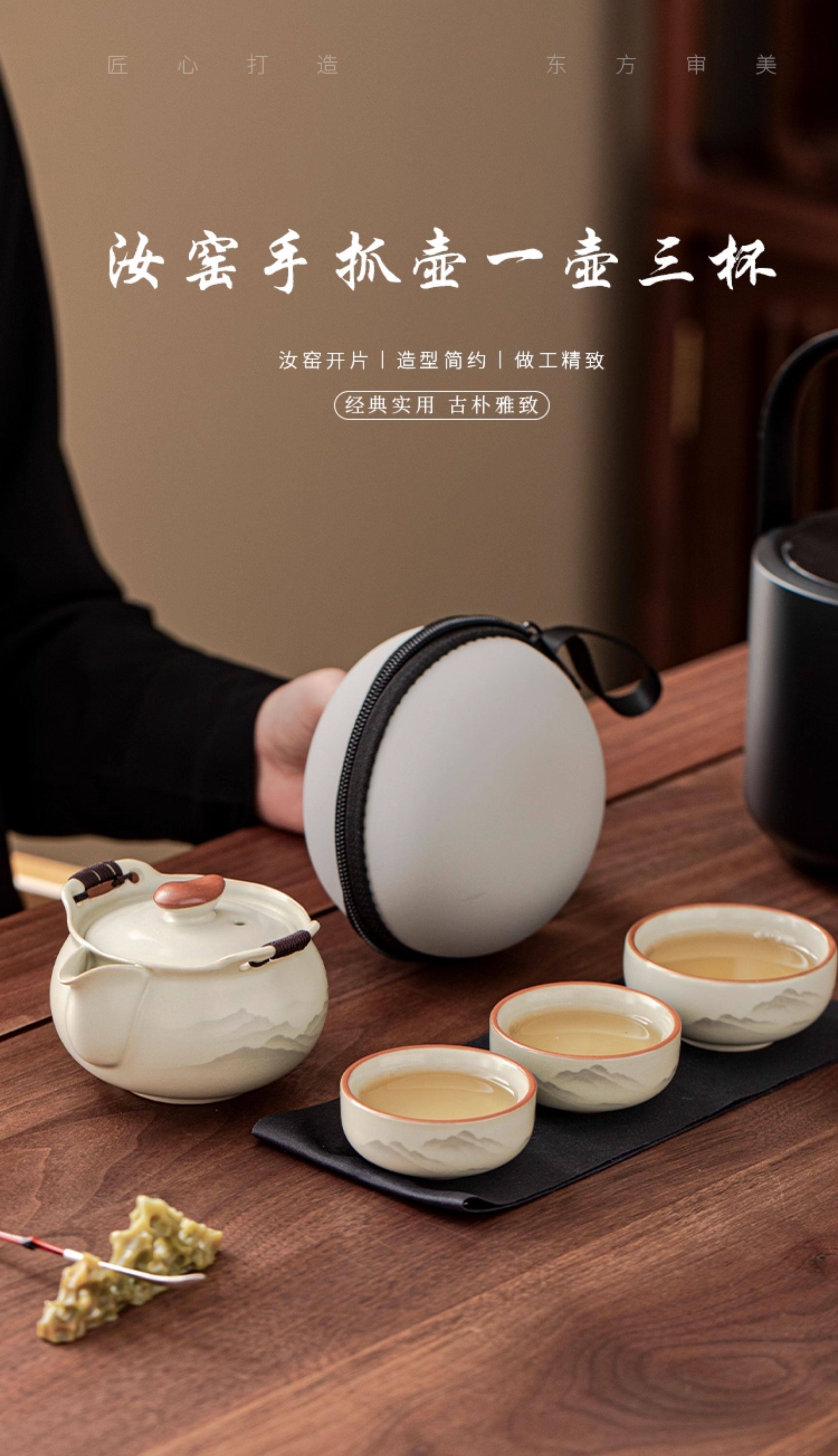Haoyao Ru Kiln Travel Tea Set, One Pot and Three Cups, Hand-Held Pot with Lid, Bowl, Outdoor Portable Tea Brewing Set, Quick Tea Cup